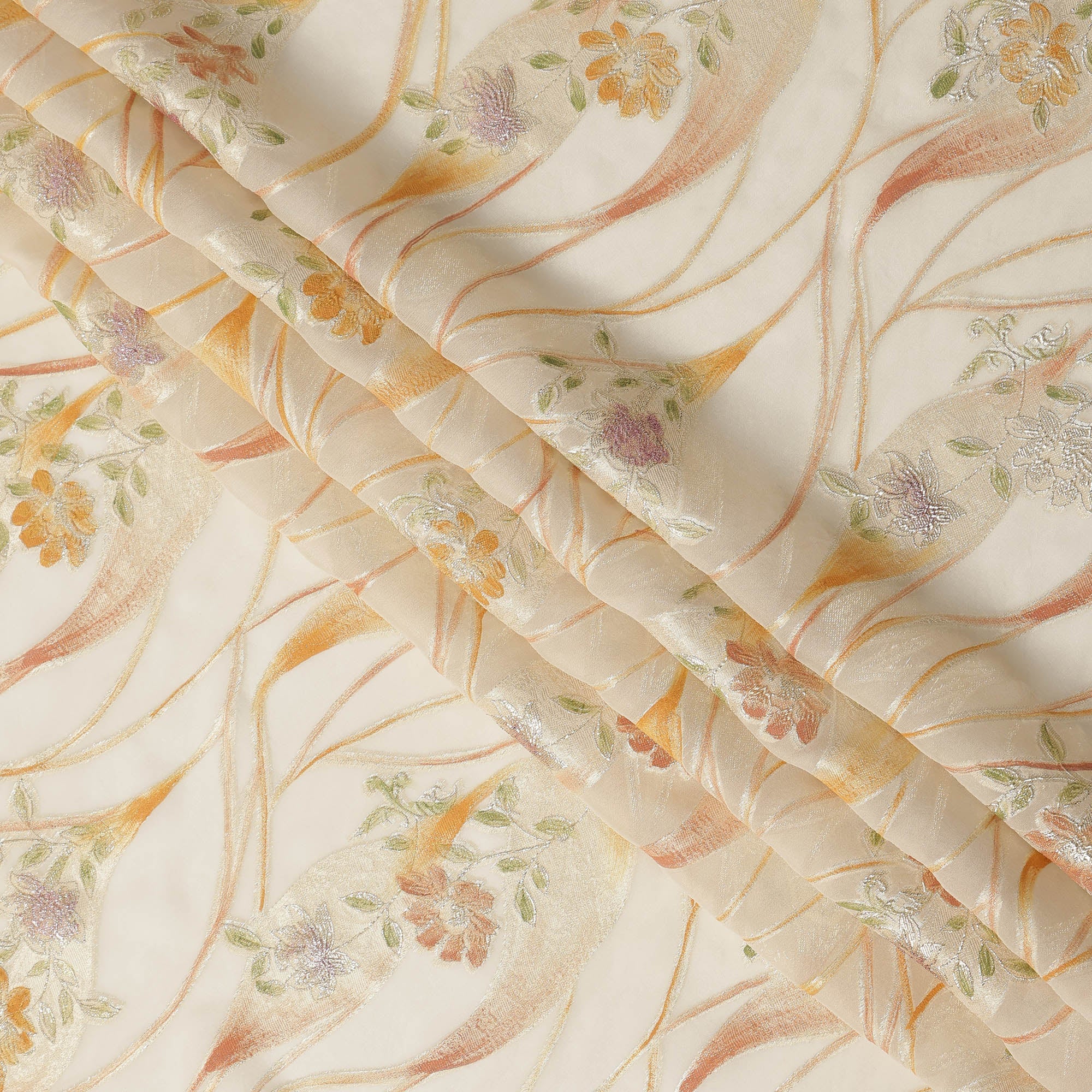 Ivory Cream Floral Metallic Hand Print Pure Silk Chiffon Fabric, 110 Cms, South Korea-D26923
