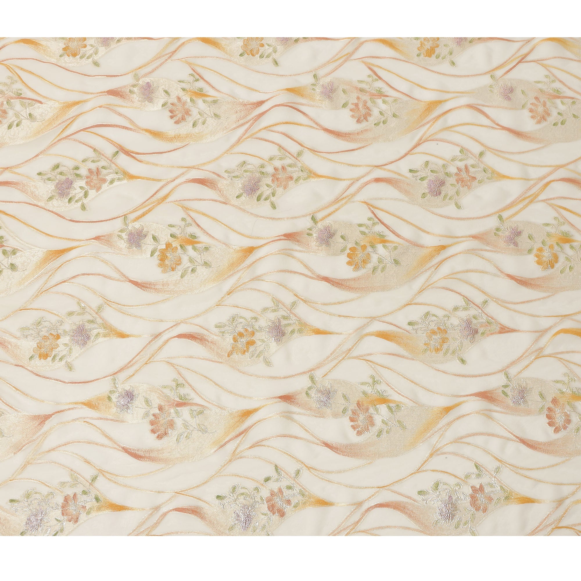 This premium pure silk chiffon fabric in an elegant ivory cream tone showcases a timeless blend of softness, sheen, and refined artistry. Adorned with a delicate floral metallic hand print arranged in graceful wave-like bands, the design features warm peach, soft lavender, and muted green floral accents enhanced by subtle metallic highlights that gently catch the light. The lightweight and sheer nature of silk chiffon gives this fabric an airy drape and fluid movement, making it ideal for luxurious silhouettes that feel effortless yet sophisticated. Perfect for designer sarees, dupattas, gowns, scarves, overlays, and couture occasion wear, this fabric offers both visual richness and wearing comfort. With a smooth texture and breathable quality, it ensures ease of styling while maintaining an elevated look. Measuring 110 cms in width, it allows versatility in cutting and design. Imported from South Korea, this fabric reflects premium craftsmanship and superior quality.