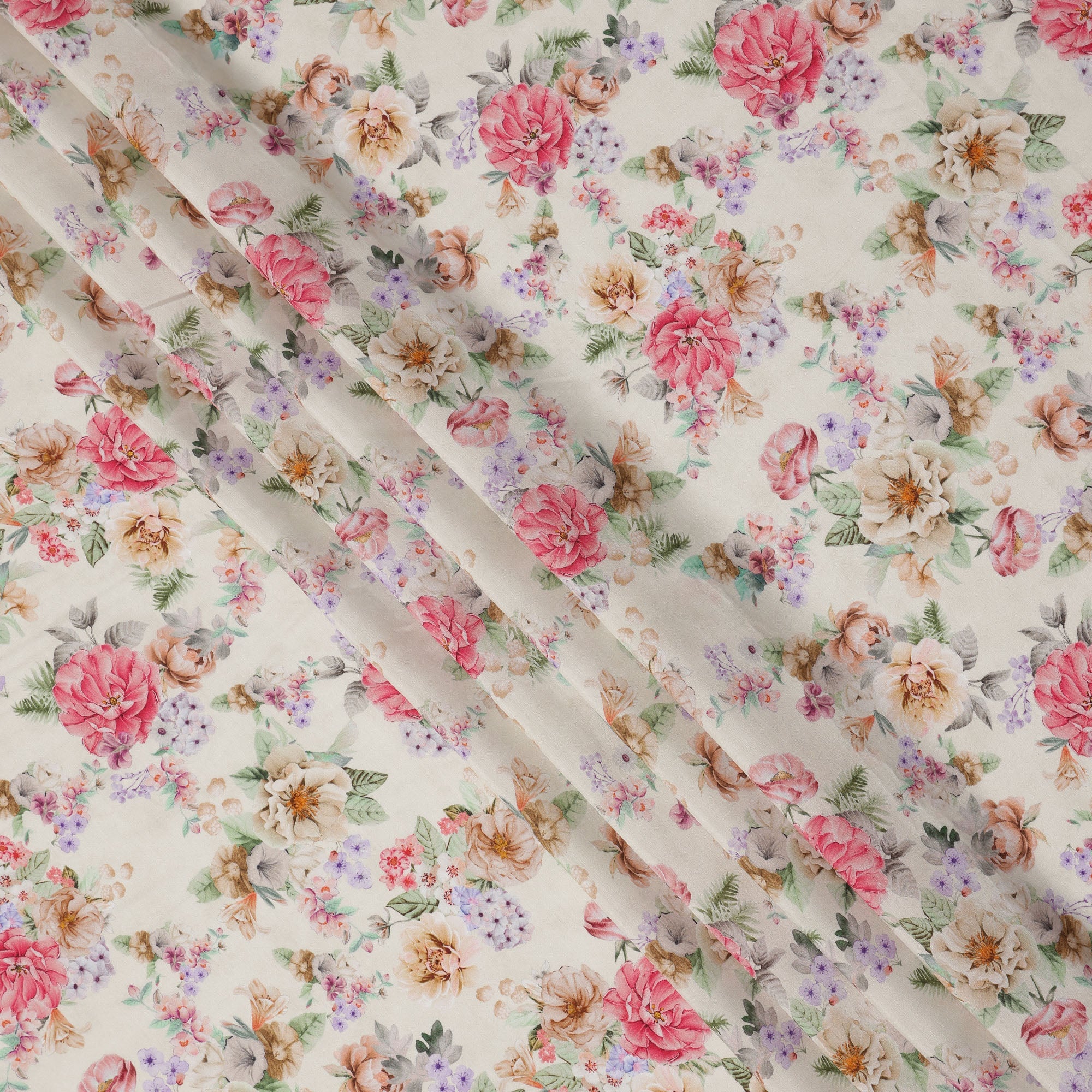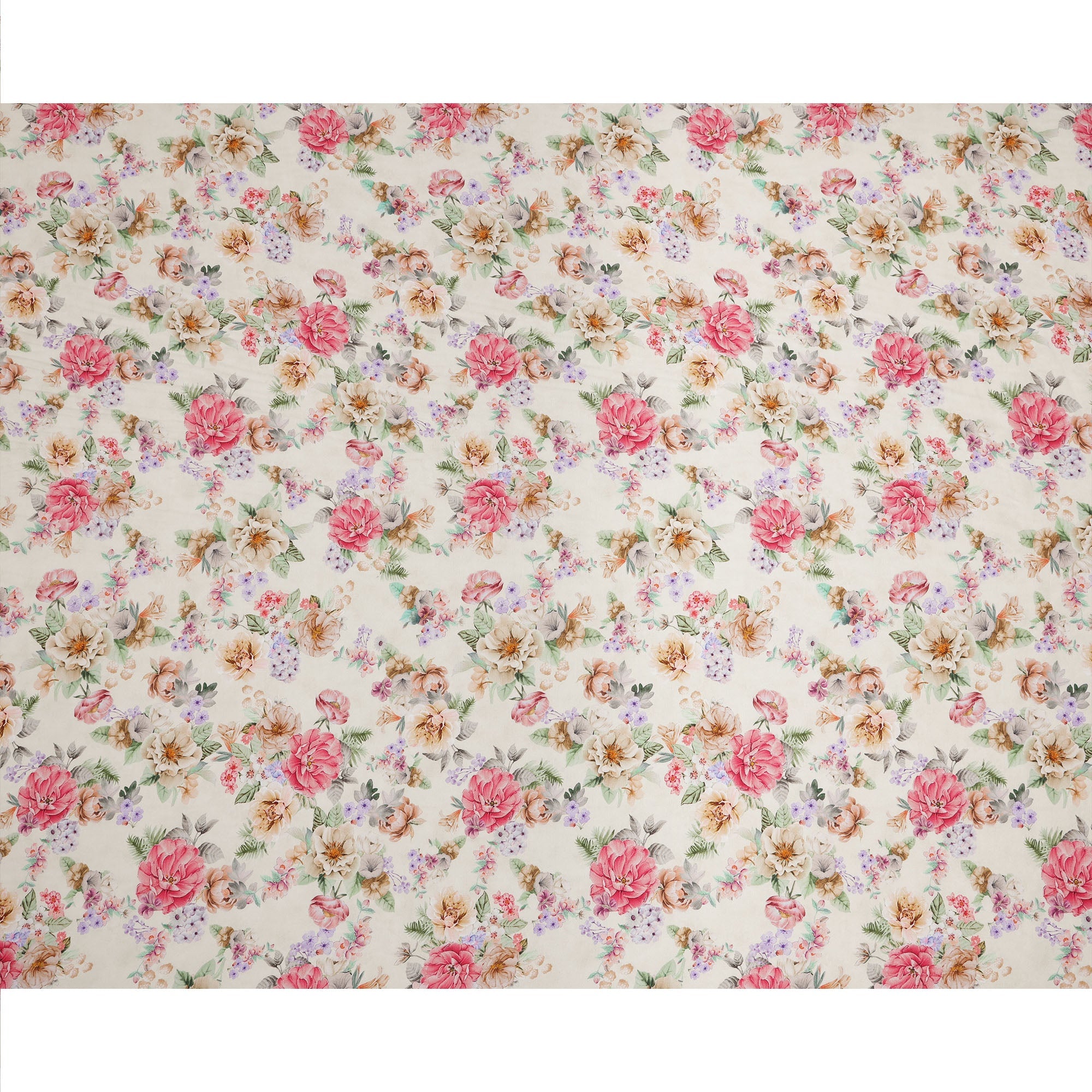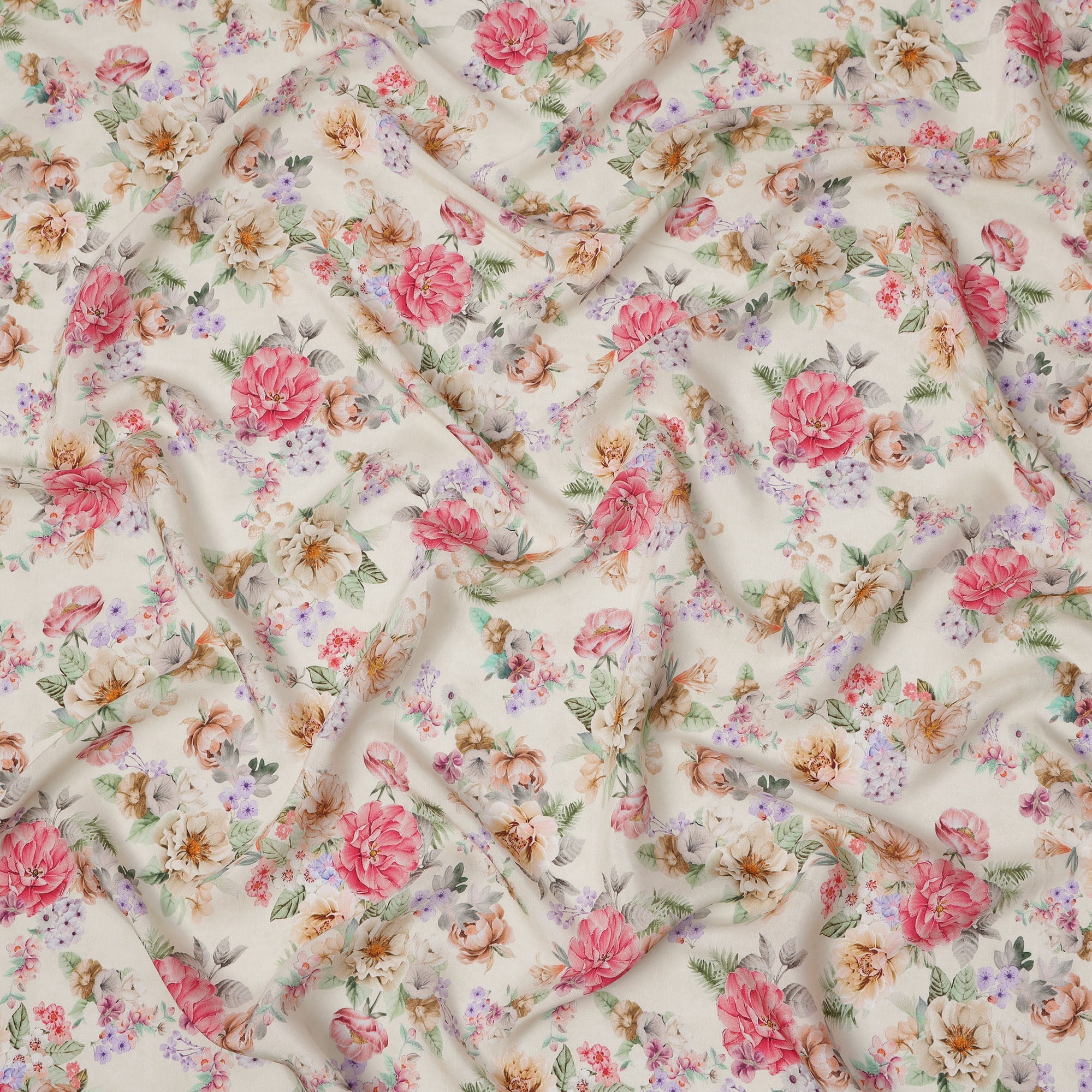 Ivory cream base with a vibrant floral print featuring pink and beige roses