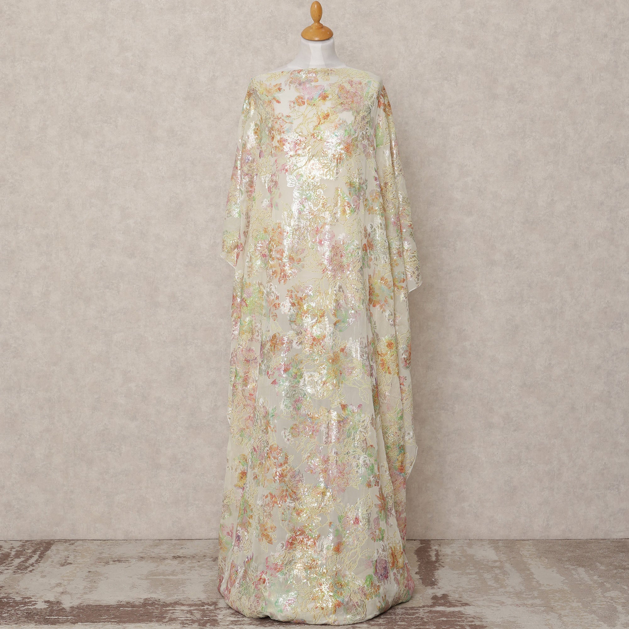 This ivory cream pure silk chiffon Somali dirac fabric with metallic lurex captures timeless beauty with a soft pastel floral... Read more Read more