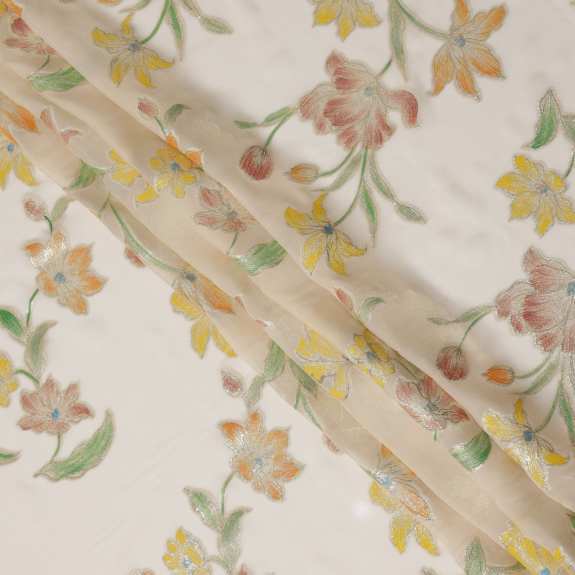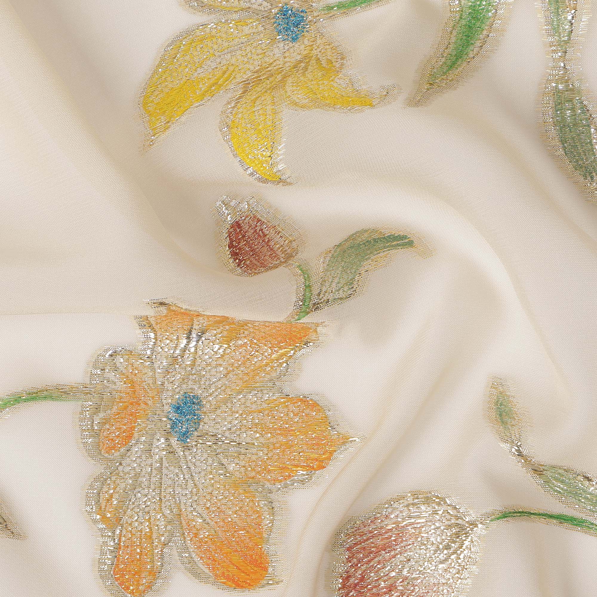 Ivory Floral Embroidered Metallic Lurex Design Premium Silk Chiffon Fabric, 110 Cms Width, Made in South Korea-D25756