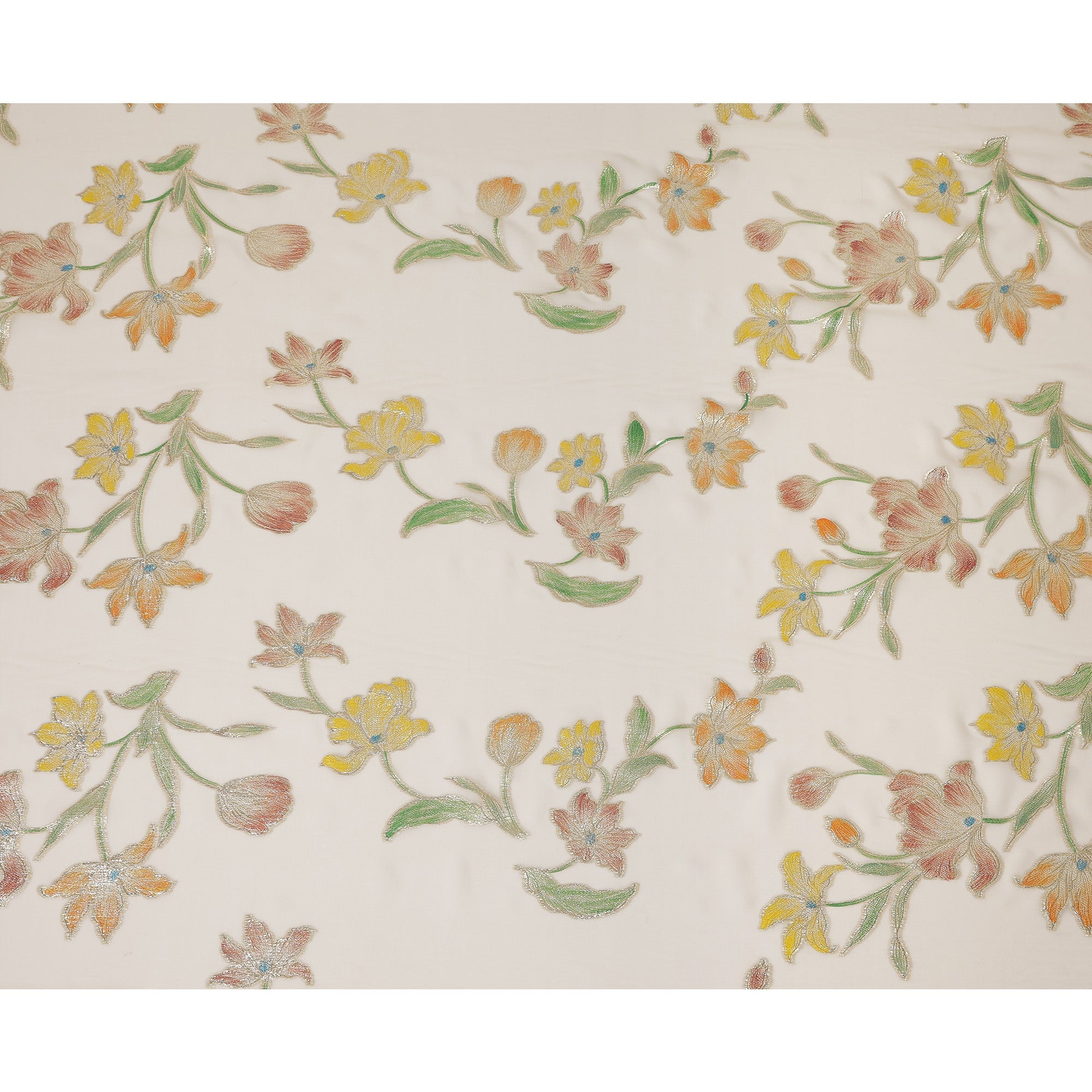Elevate your style with this Ivory Premium Silk Chiffon fabric, gracefully embroidered with delicate floral motifs accentuated by metallic lurex threads for a radiant sheen. Expertly crafted in South Korea, this fabric beautifully blends luxury with timeless artistry. The soft ivory base enhances the intricate floral embroidery in gentle shades of yellow, peach, and green, each petal highlighted with shimmering metallic detailing that adds subtle sophistication. Lightweight and fluid, this chiffon fabric drapes with effortless grace, making it ideal for sarees, gowns, dupattas, and designer couture wear. Its airy texture and lustrous finish make it perfect for festive, bridal, and elegant evening ensembles. Designed with precision craftsmanship, this Korean silk chiffon embodies elegance, comfort, and enduring beauty. To maintain its pristine sheen and embroidery, dry clean only and store carefully. Shop online now to experience the luxury and finesse of authentic Korean silk craftsmanship.