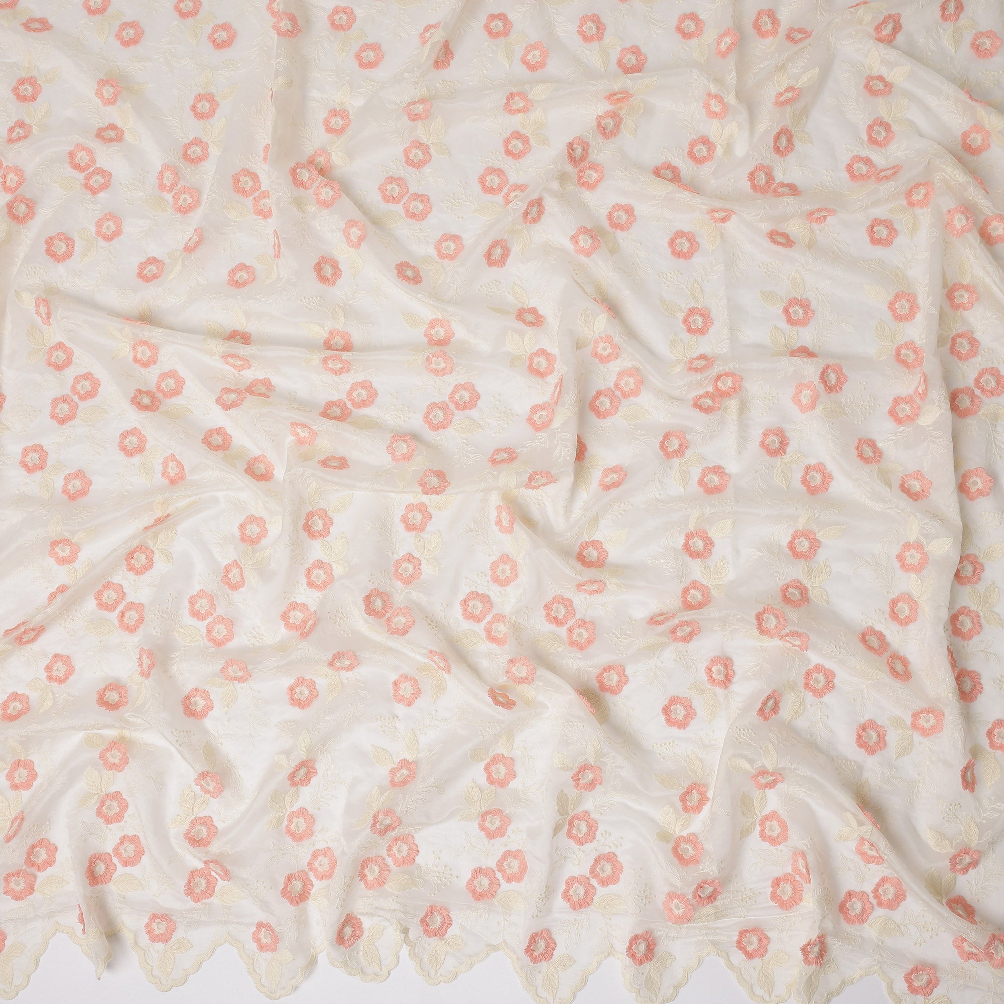 Ivory Floral Embroidered Scalloped-Edge Synthetic Organza Fabric, 110 cm Width, Made in India-D26650