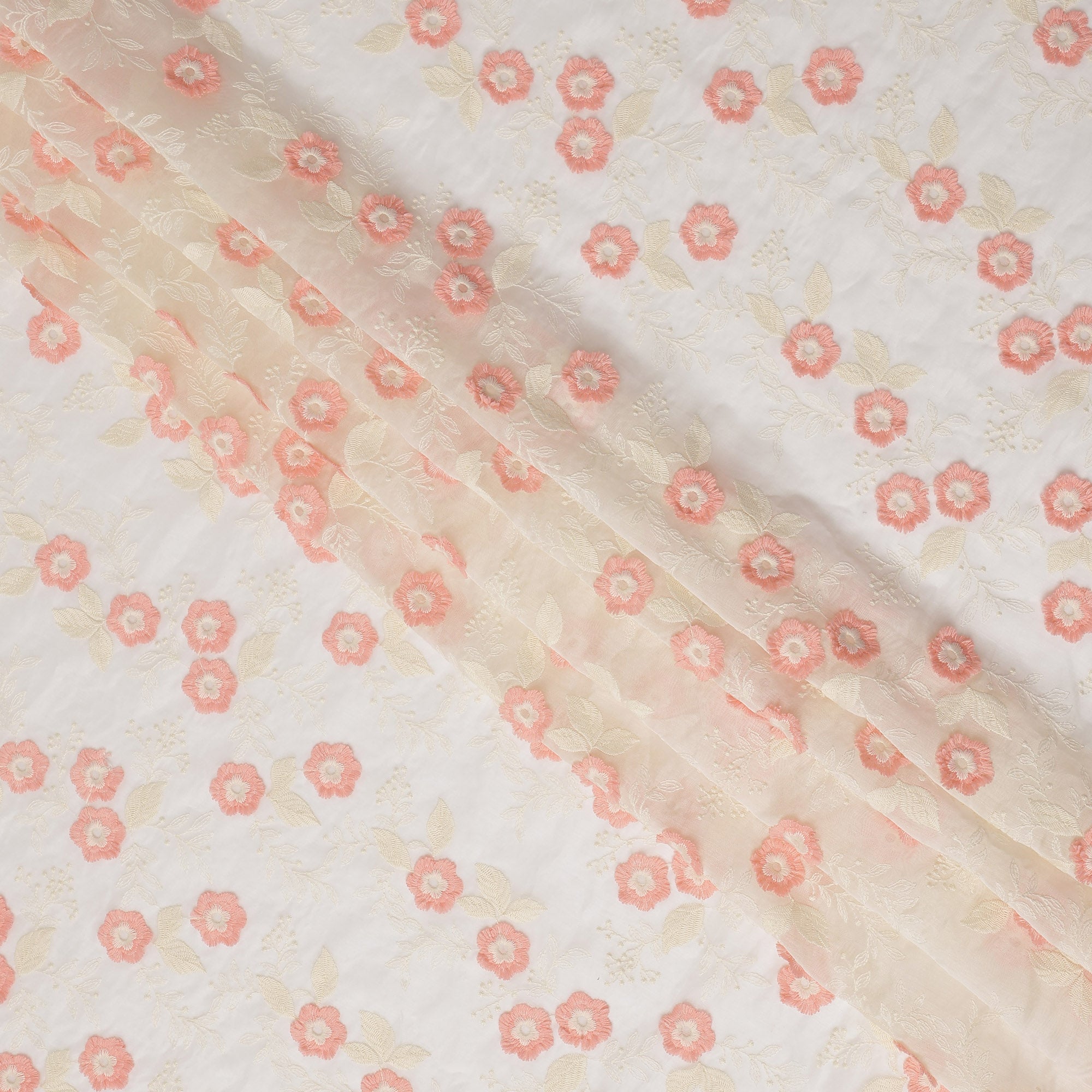 Ivory synthetic organza with peach and cream floral embroidery