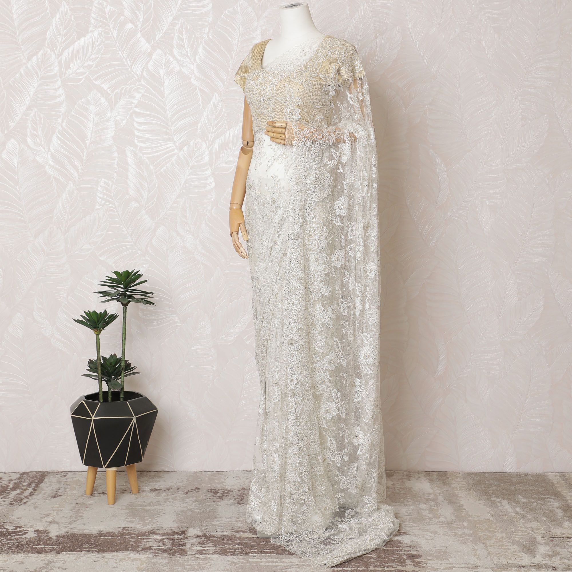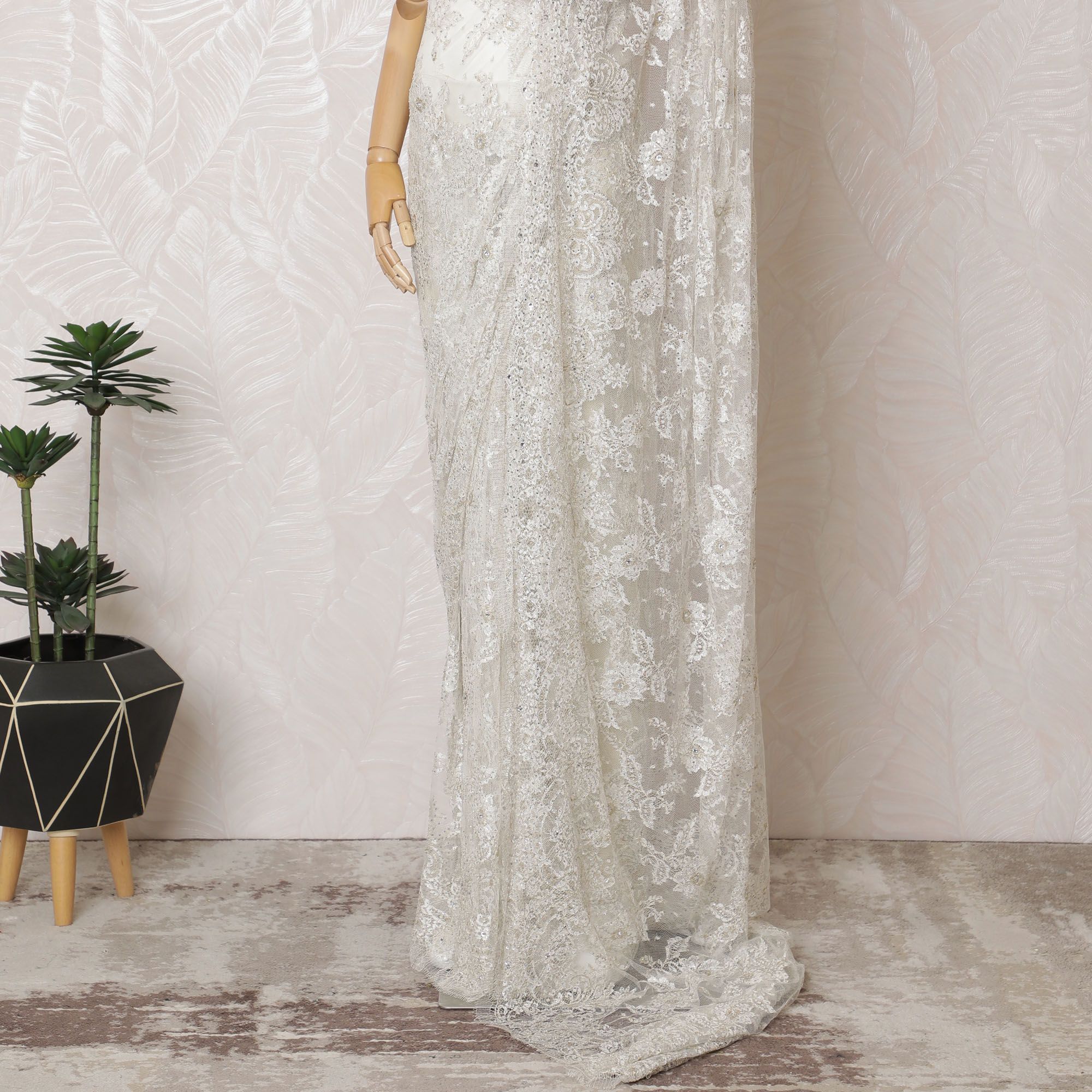Ivory Gleam French Metallic Chantilly Lace Saree with Sparkling Stone Work, 110cm Wide - 5.5m Piece-D18846