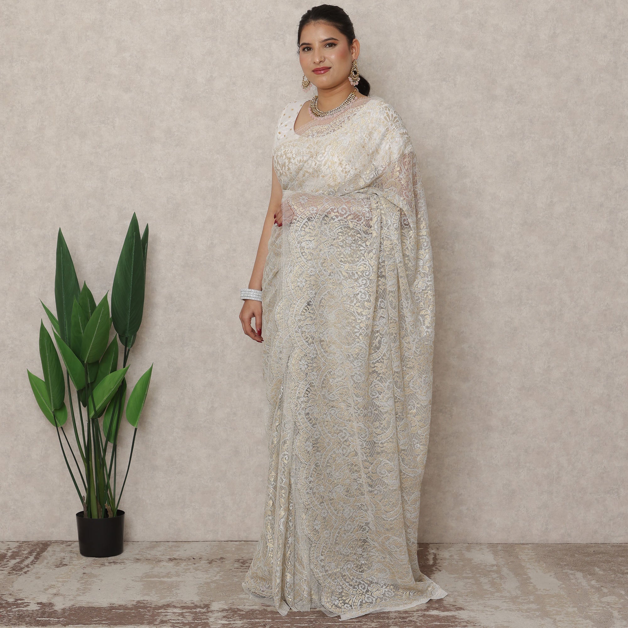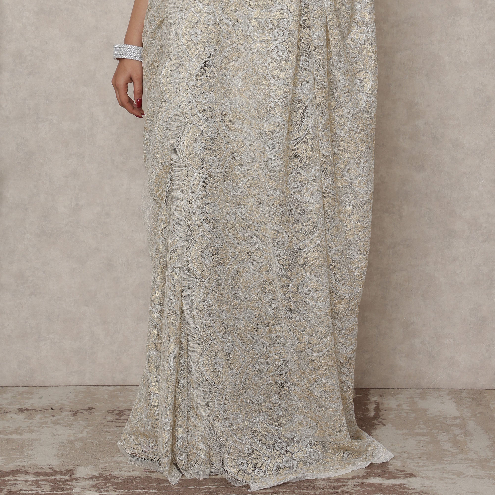 Grace your special occasions with the timeless elegance of this Ivory Gold Premium French Metallic Chantilly saree lace, a 5.5 meters masterpiece with a 110 cms width that embodies the art of French lace-making. The soft ivory base is delicately interwoven with rich gold metallic threads, radiating sophistication and heritage-inspired charm. Intricate floral motifs and paisley elements unfold gracefully across the body, with a wide ornamental border enhancing its grandeur. The fabric’s feather-light texture and luxurious shimmer make it perfect for weddings, receptions, and festive celebrations where you want to shine effortlessly. With its origin rooted in France, this saree promises premium quality and artisanal finesse. Blouse not included. Shop online to add this versatile classic to your curated ethnic wardrobe.