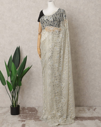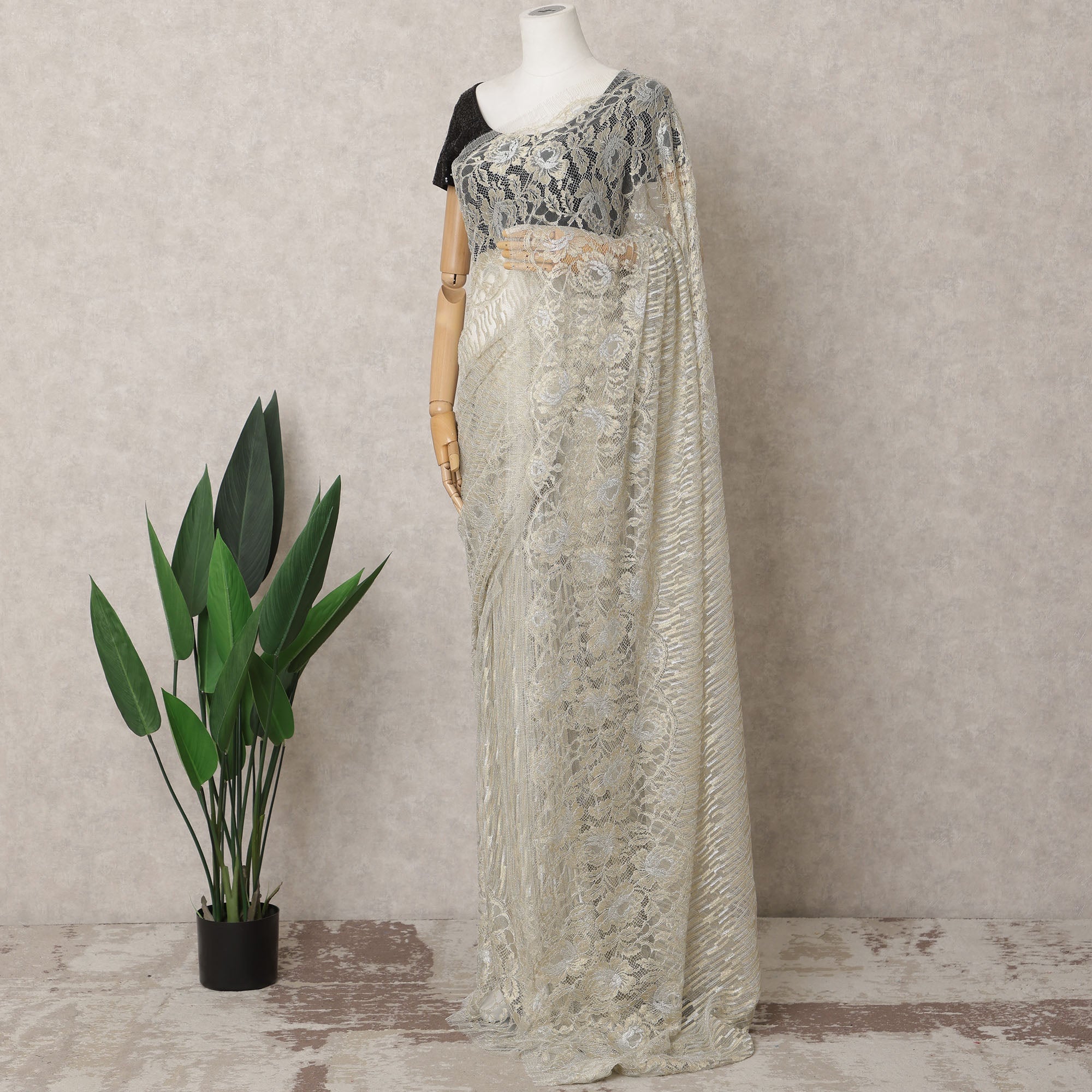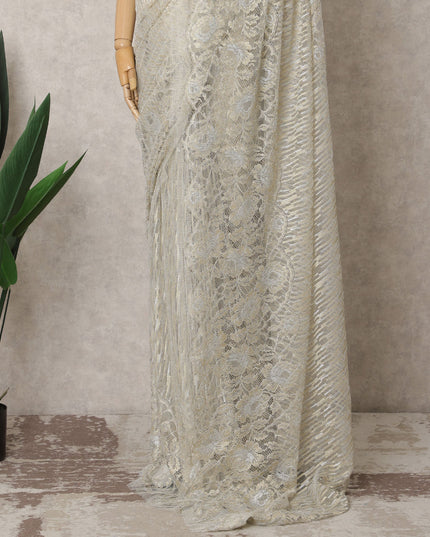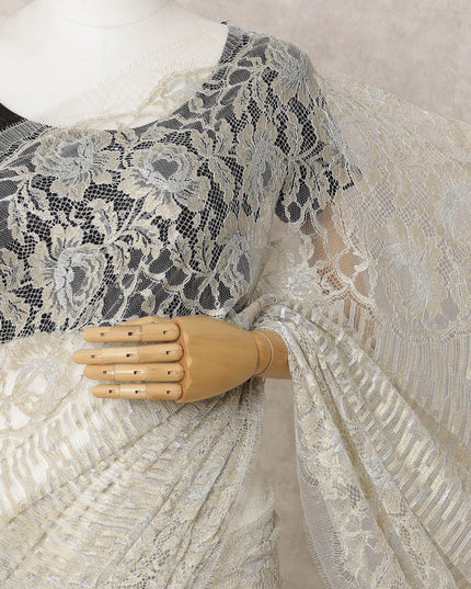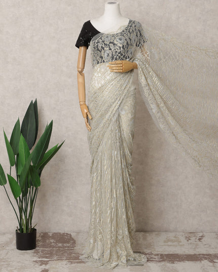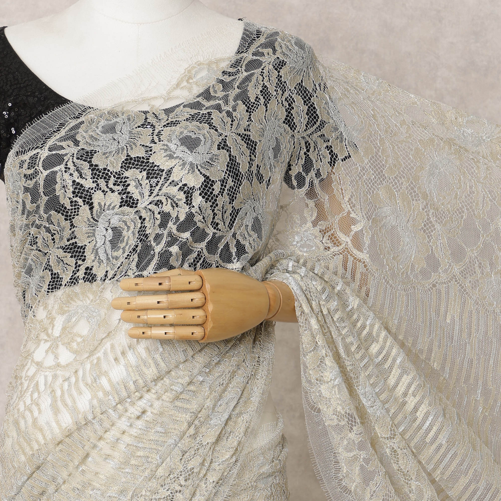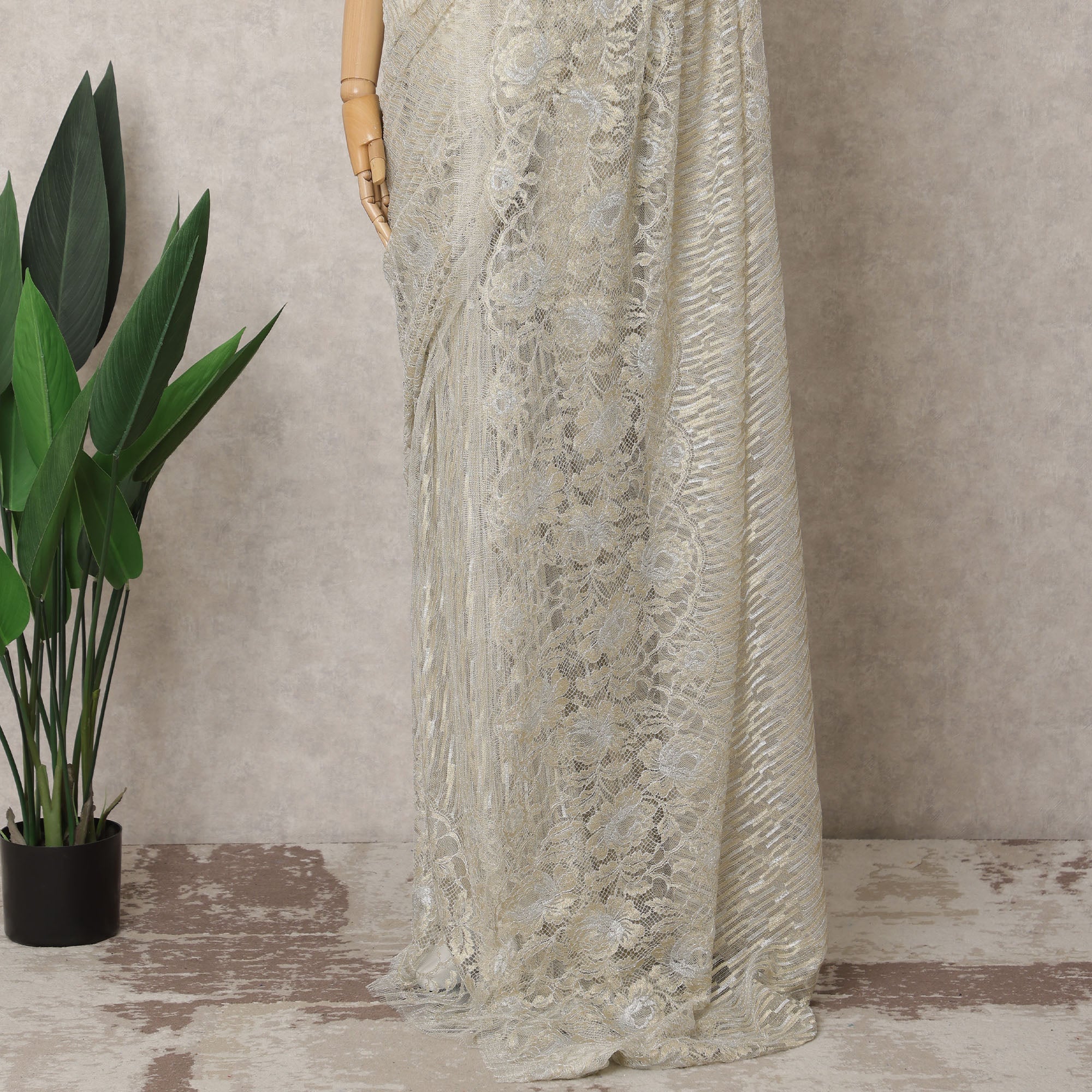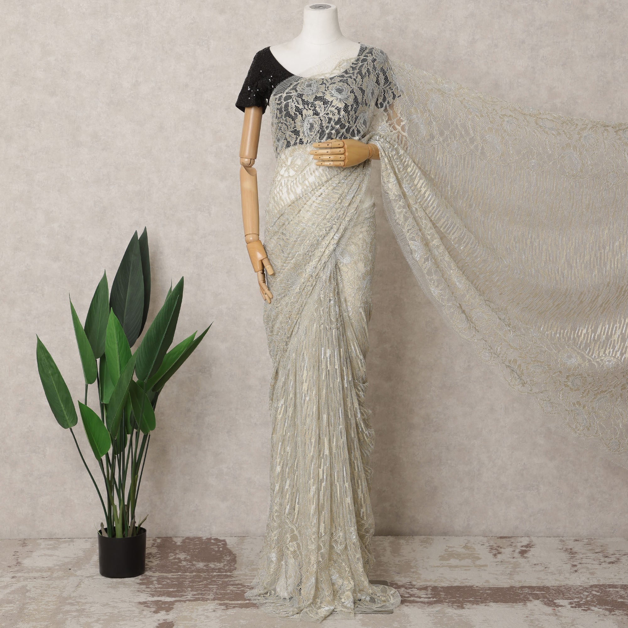 Ivory, Gold, Silver Premium French Metallic Chantilly Lace Saree – 5.5 Meters, Elegant Design-D21868