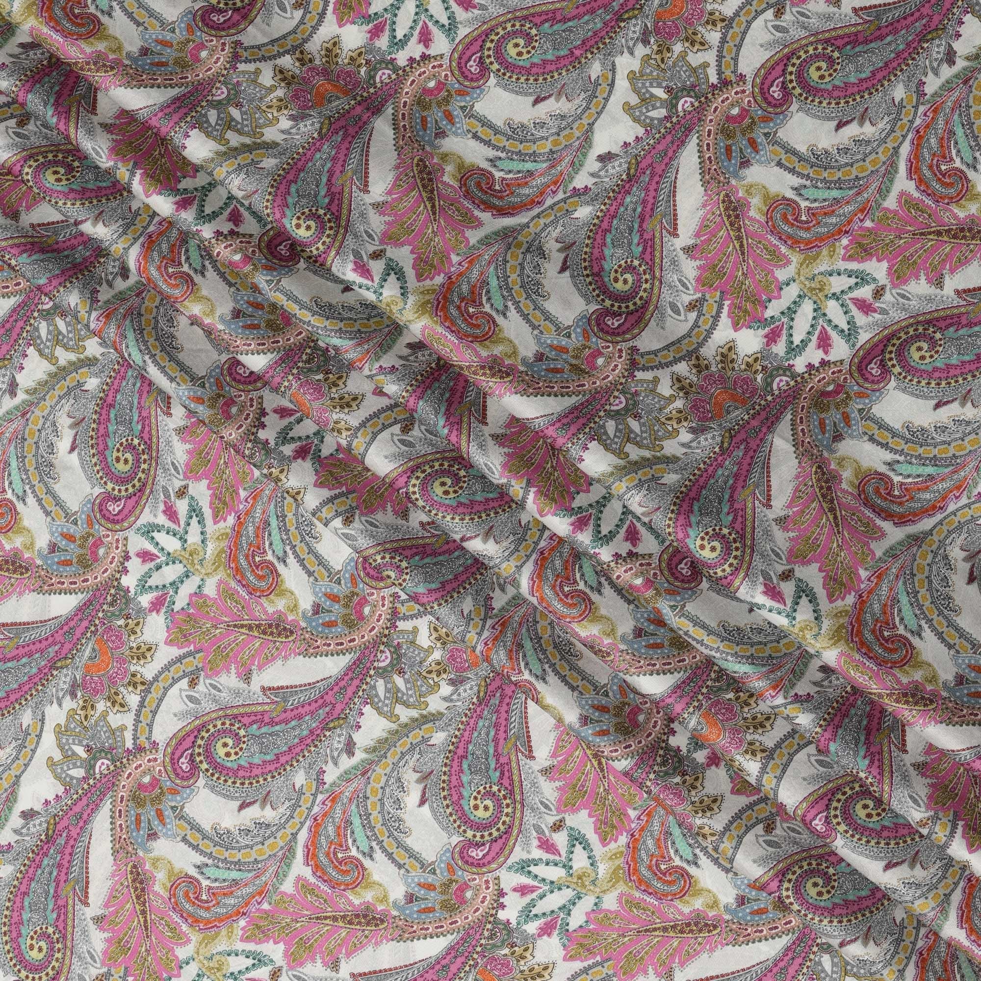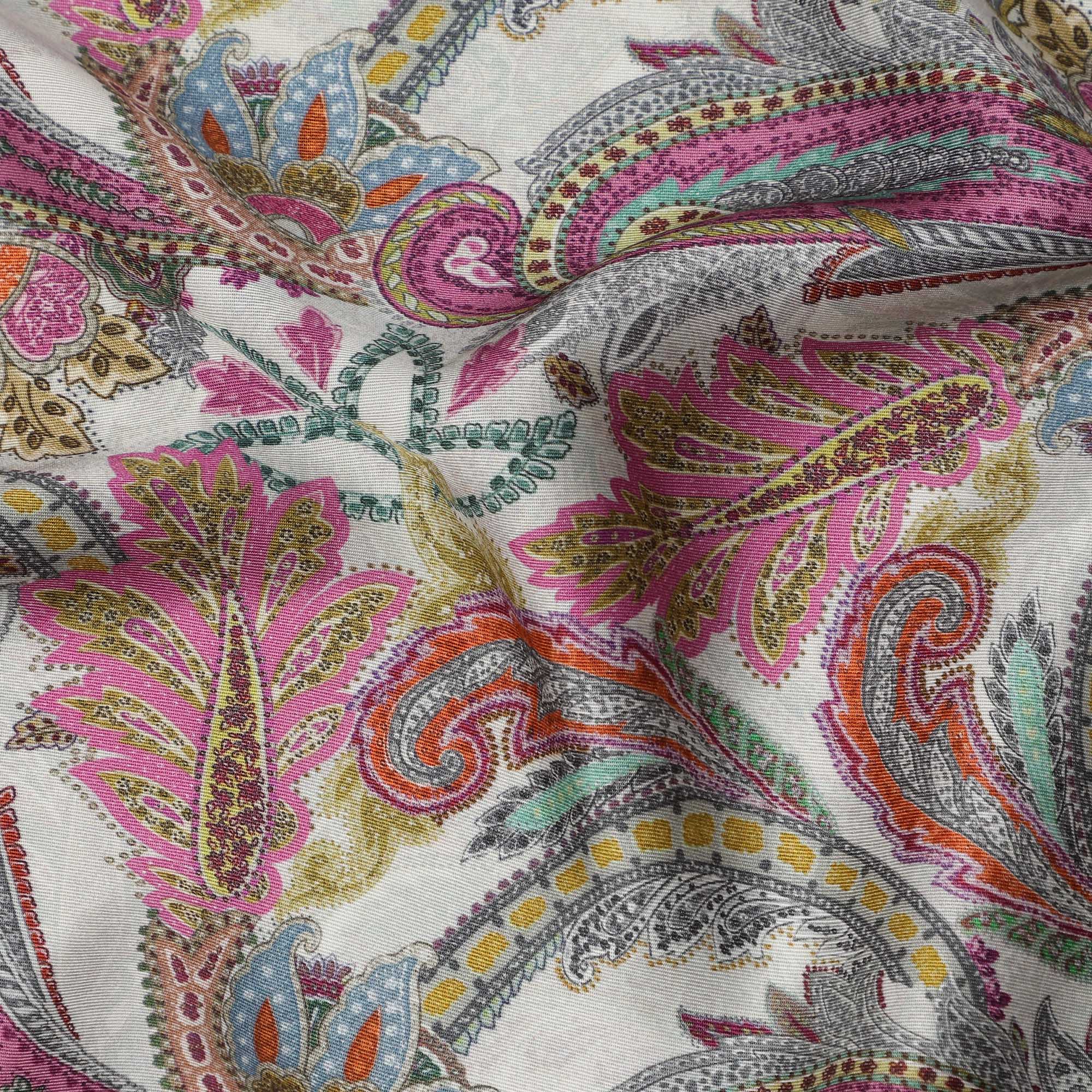 Ivory Multicolor Paisley Print Viscose Modal Satin Fabric, 110 Cms Width, Made in India-D23304