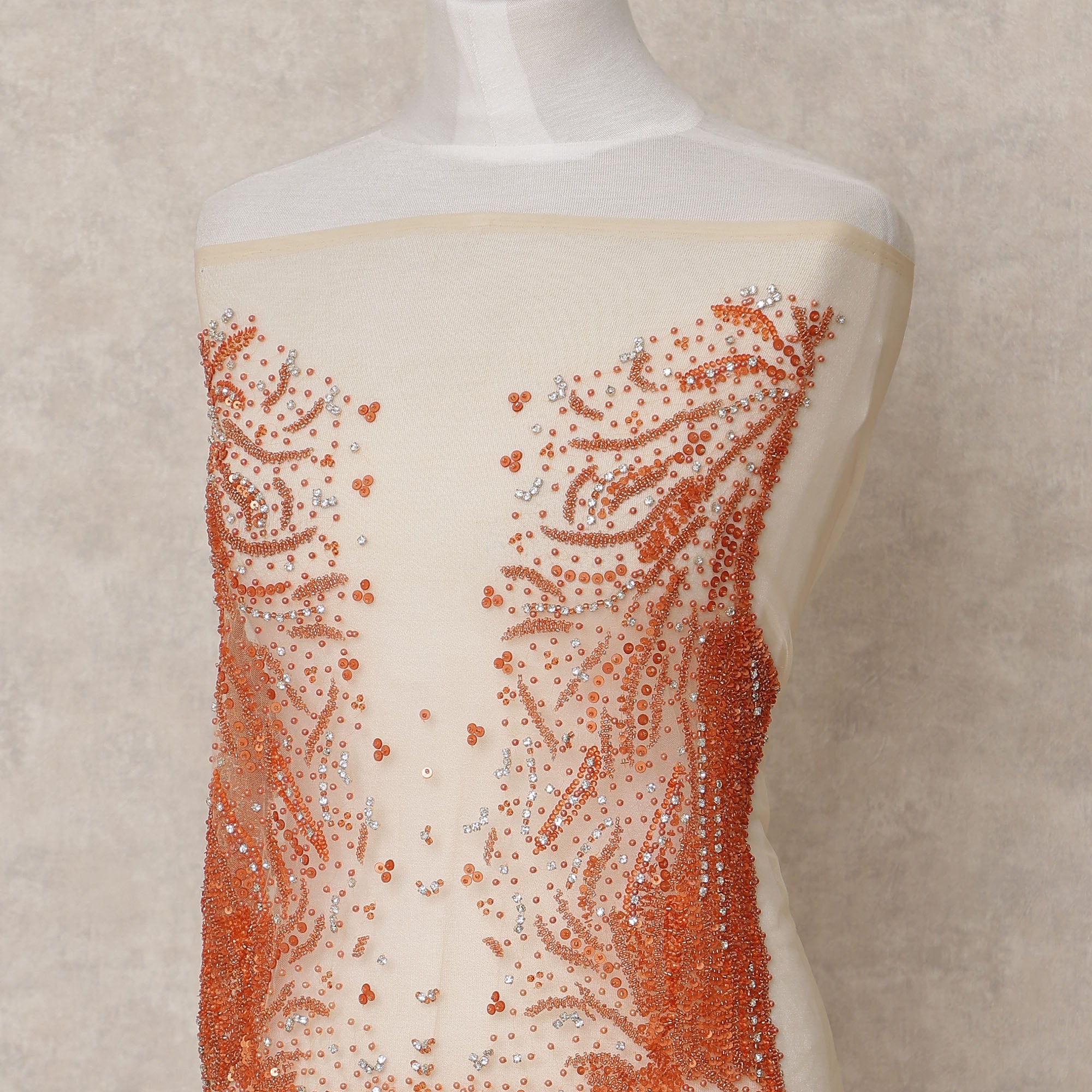Infuse brilliance into your designs with this elegant Ivory Net Fabric adorned with vibrant orange and silver sequin embroidery. Crafted to perfection, this fabric features intricately arranged sequins and beadwork forming fluid, branch-like patterns that cascade across the bodice area. The ivory net base adds a soft, sheer elegance while providing the perfect backdrop for the dazzling embellishments. This fabric is ideal for bridal blouses, festive gowns, couture dupattas, or luxury overlays that demand attention. With a generous width of 140 cm and sold in running meters, this fabric allows freedom in custom tailoring. The blend of fiery orange with shimmering silver accents reflects a bold yet sophisticated charm—perfect for making a style statement. Buy online now and transform your ethnic or contemporary silhouettes with this high-fashion embroidered net fabric.