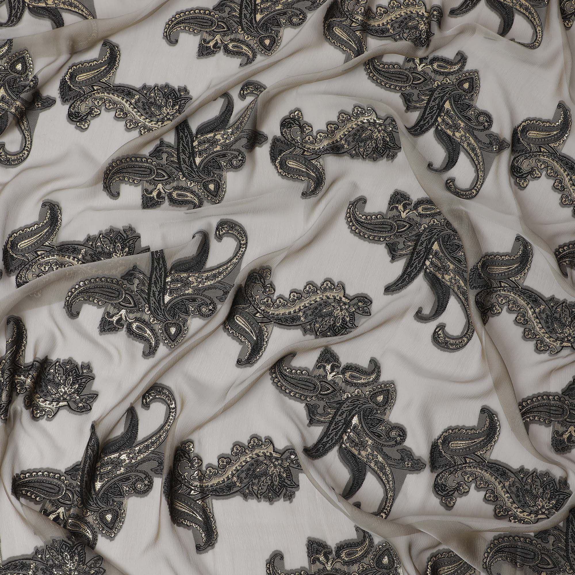 • Sale -30% Ivory Opulence Pure Fransawi Silk Chiffon Fabric with Intricate Black Paisley Embroidery, 110cm Width - Traditional Garbasaar, Piece of 2.0 Mtrs-D18647