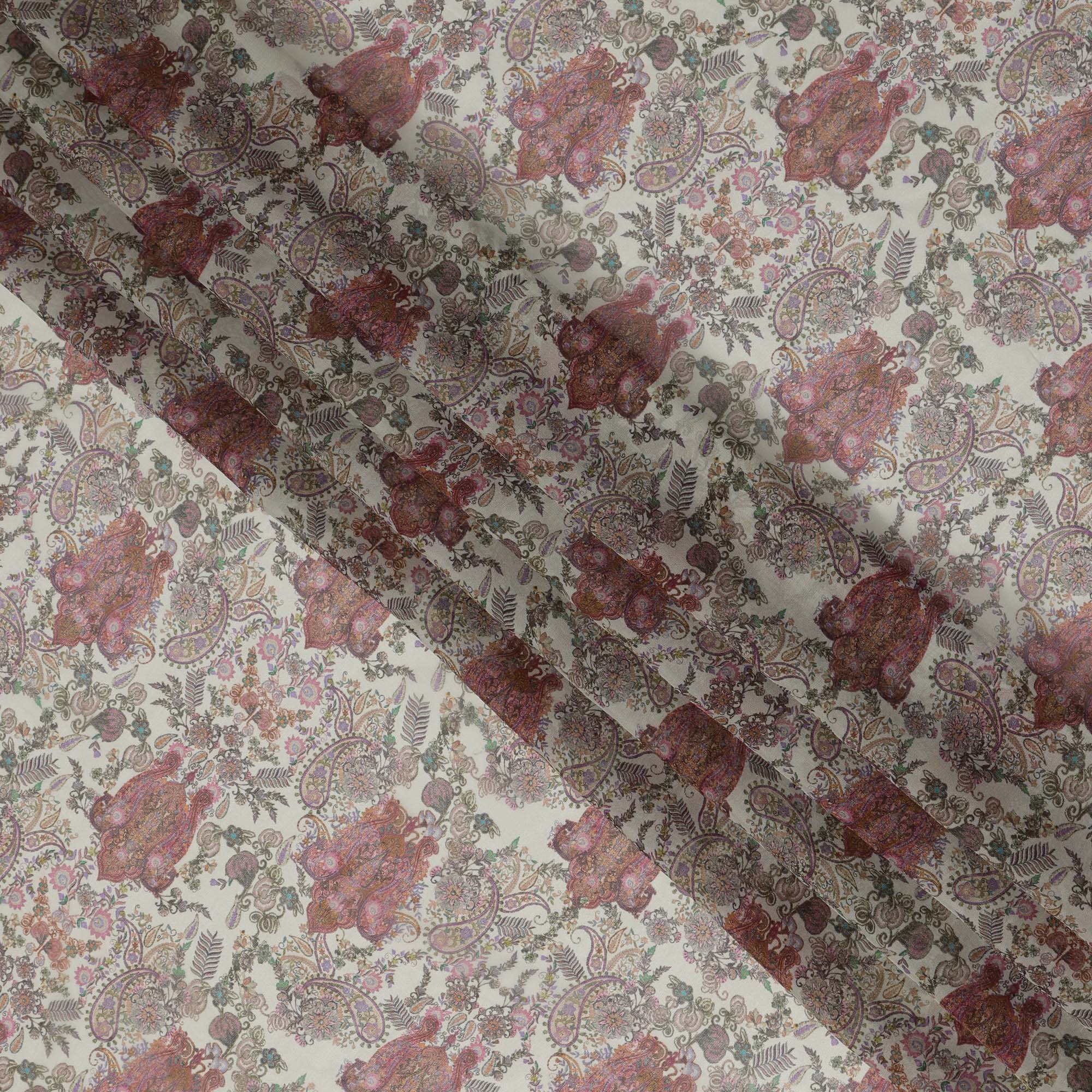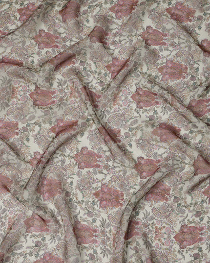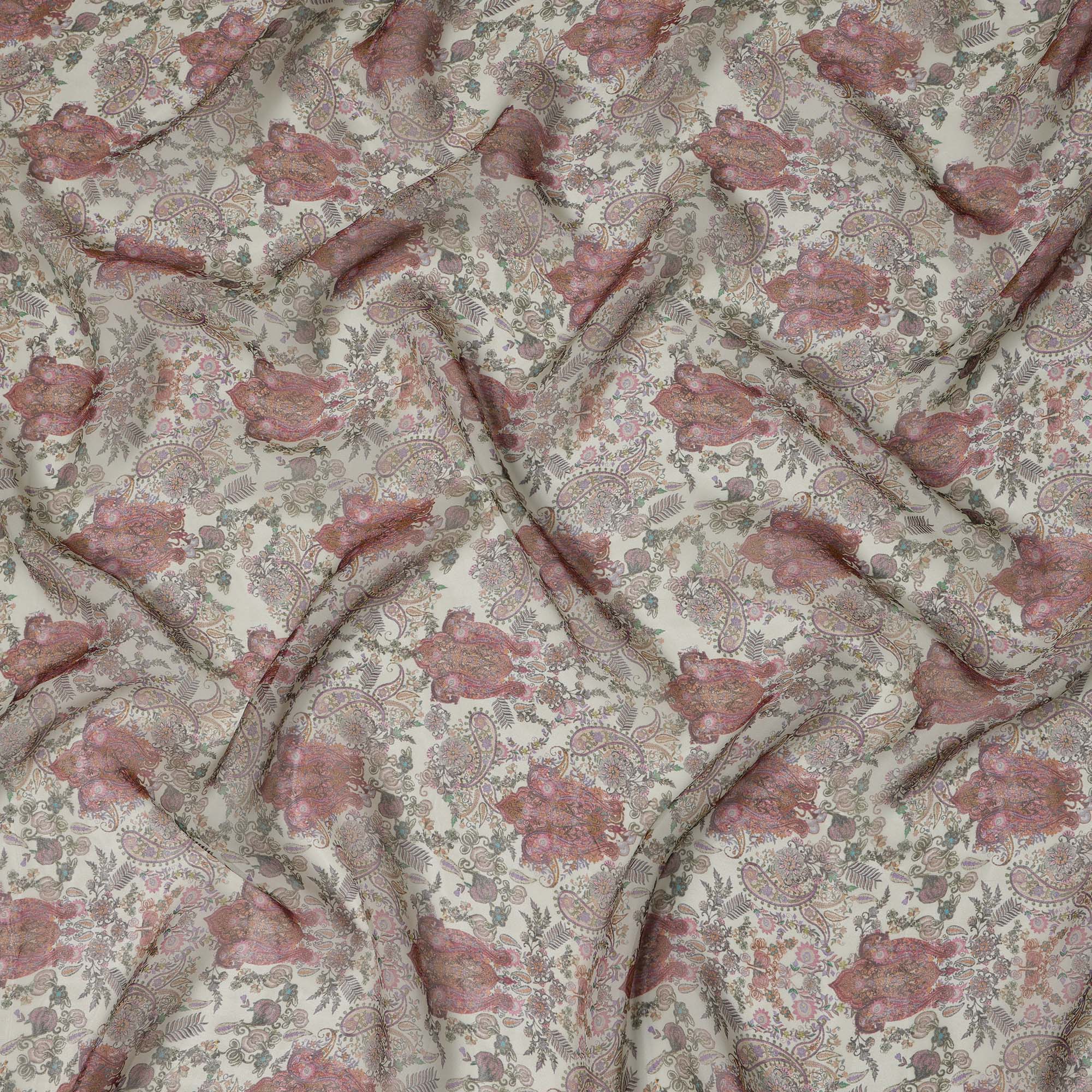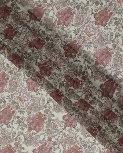 Ivory Paisley and Floral Printed Synthetic Organza Fabric with Maroon and Olive Accents, Width 110 Cms, Made in India -D23329