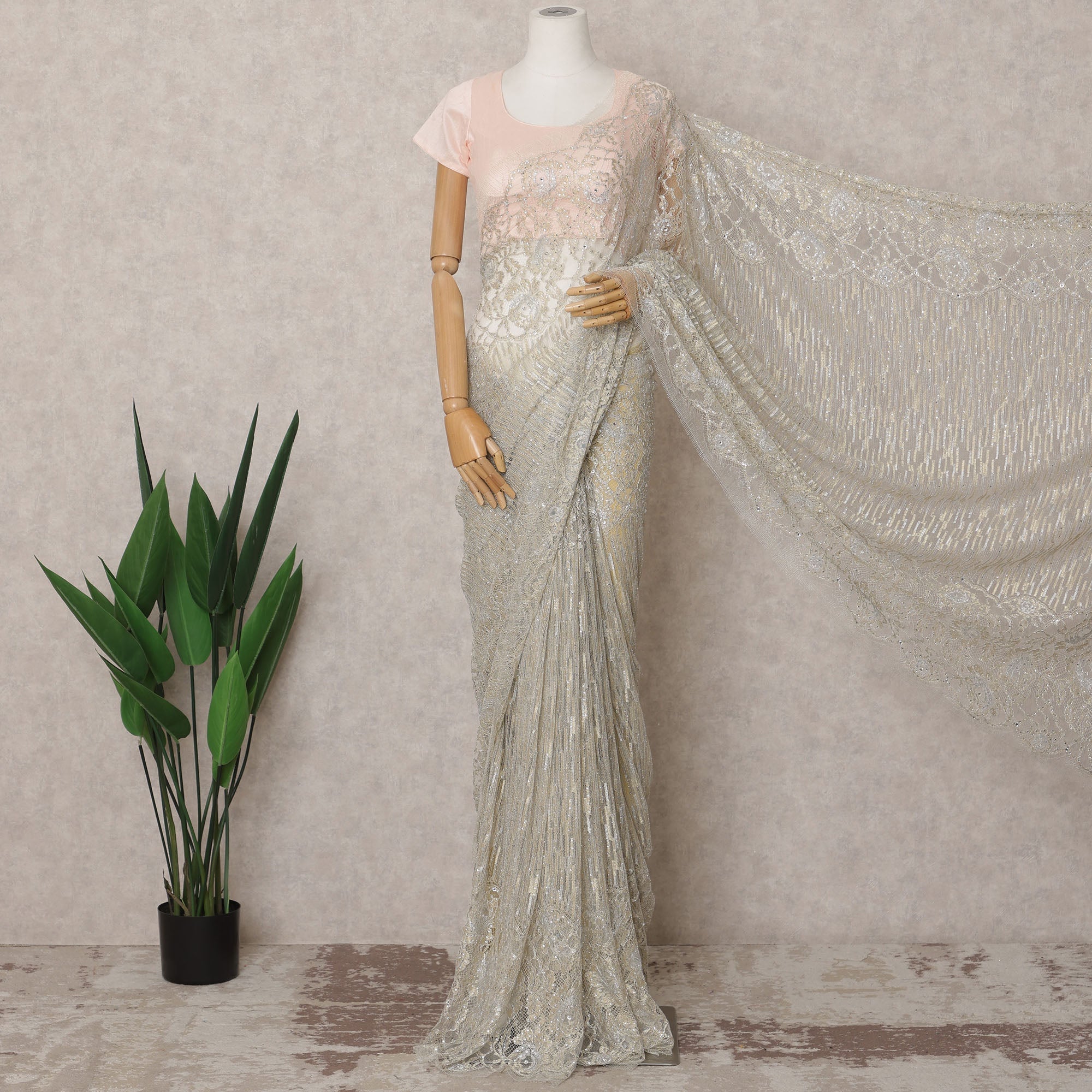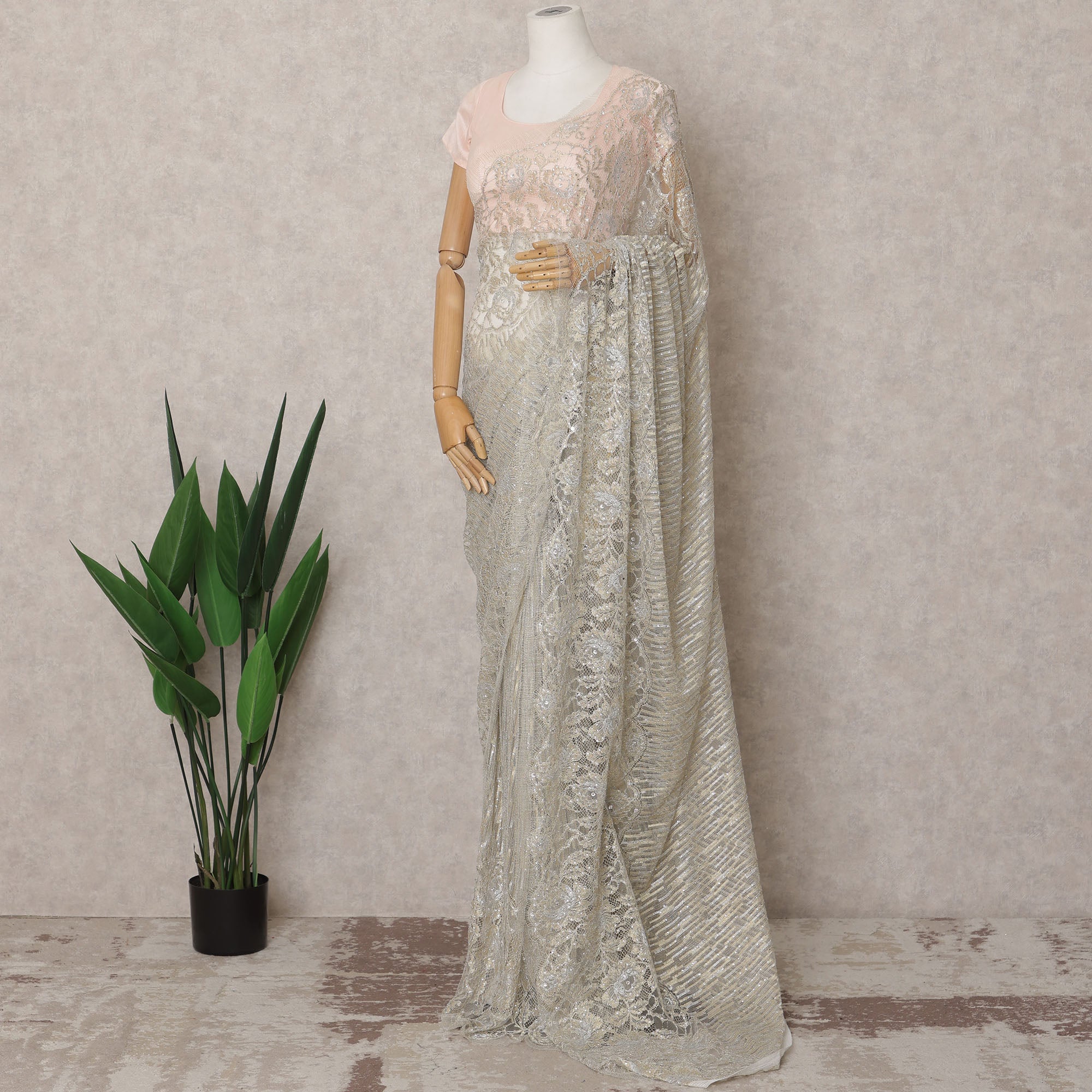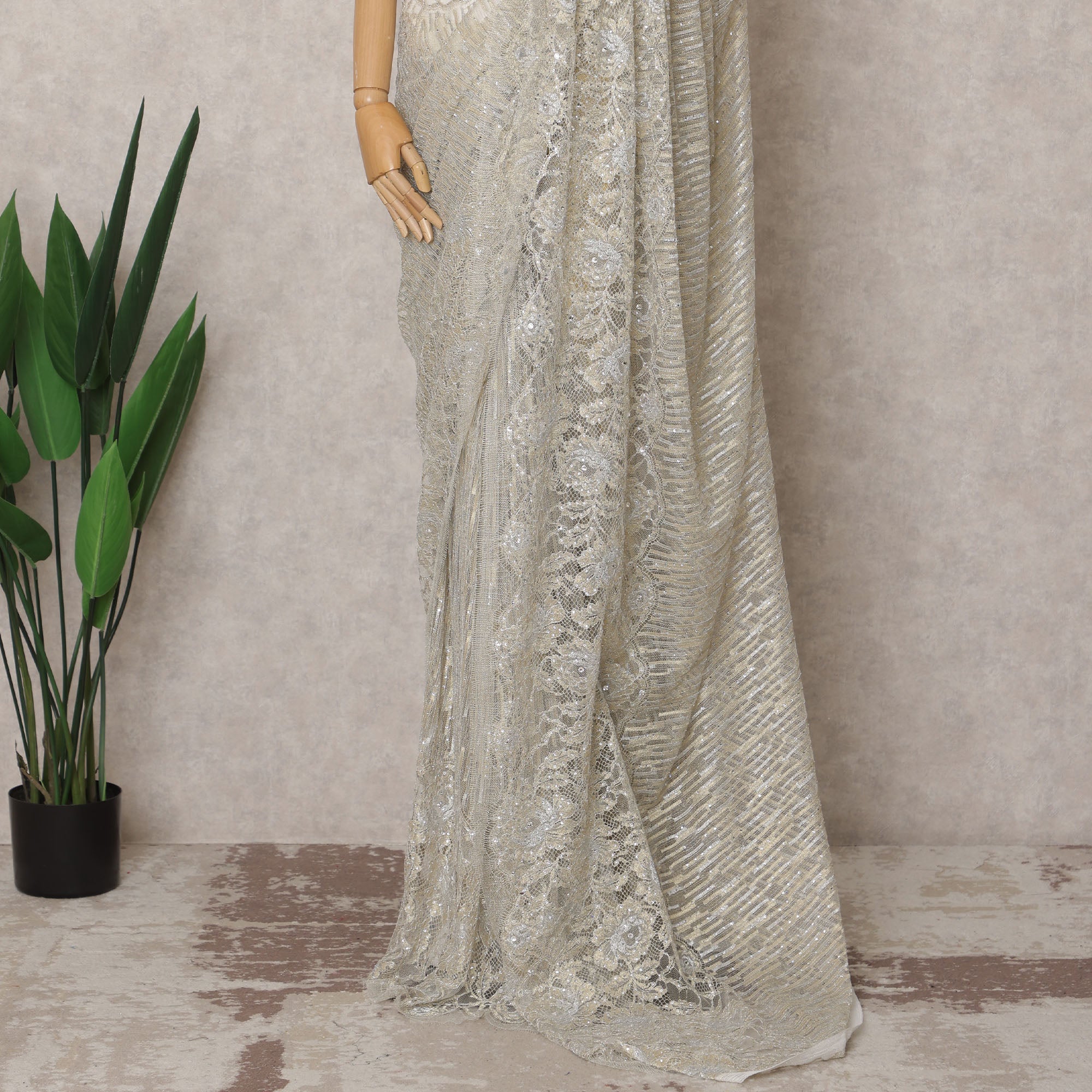 Ivory Premium French Metallic Chantilly Lace Saree Fabric with Stone Work – 5.5 Meters Length & 110 Cms Width – Imported from France-D22930