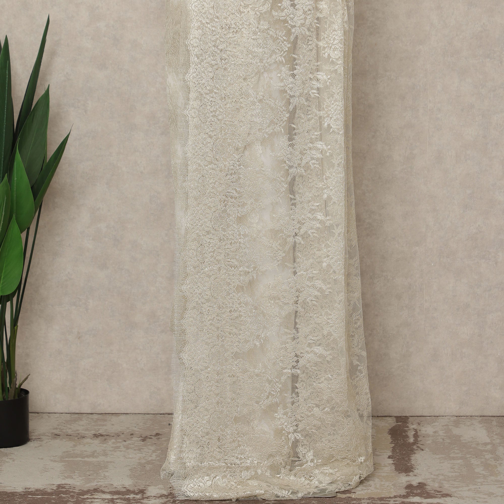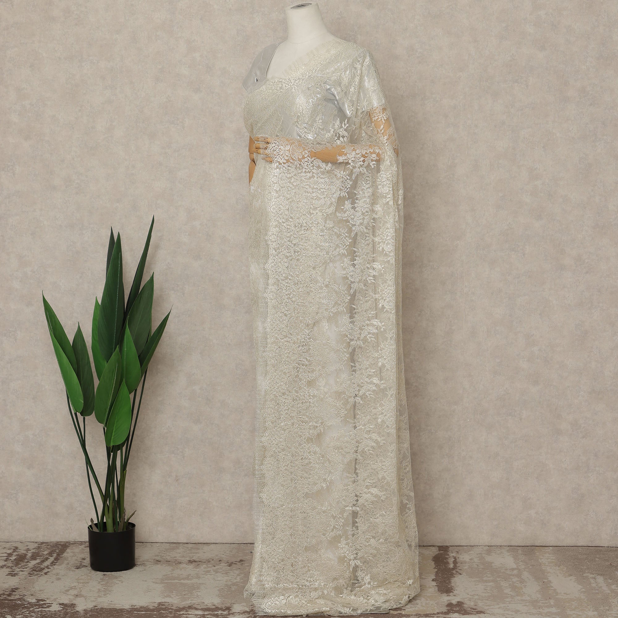 Ivory Premium French Metallic Chantilly Saree Lace, 5.5 Mtrs Length, 110 Cms Width, Crafted in France -Blouse Not Included-D26735