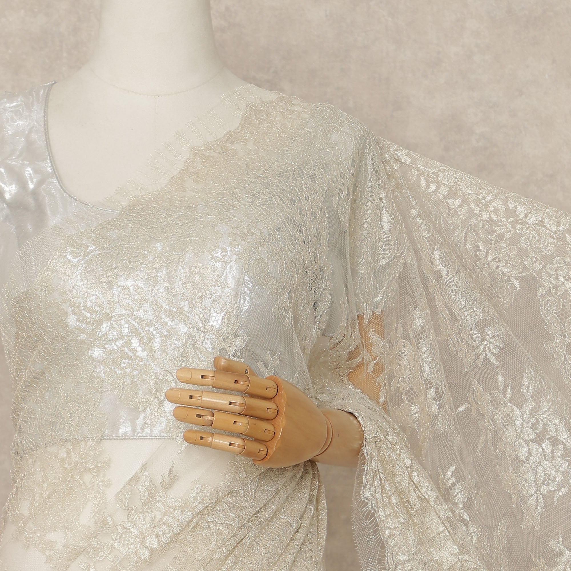 Premium French Chantilly lace with delicate metallic detailing offers a luxurious and elegant appearance.