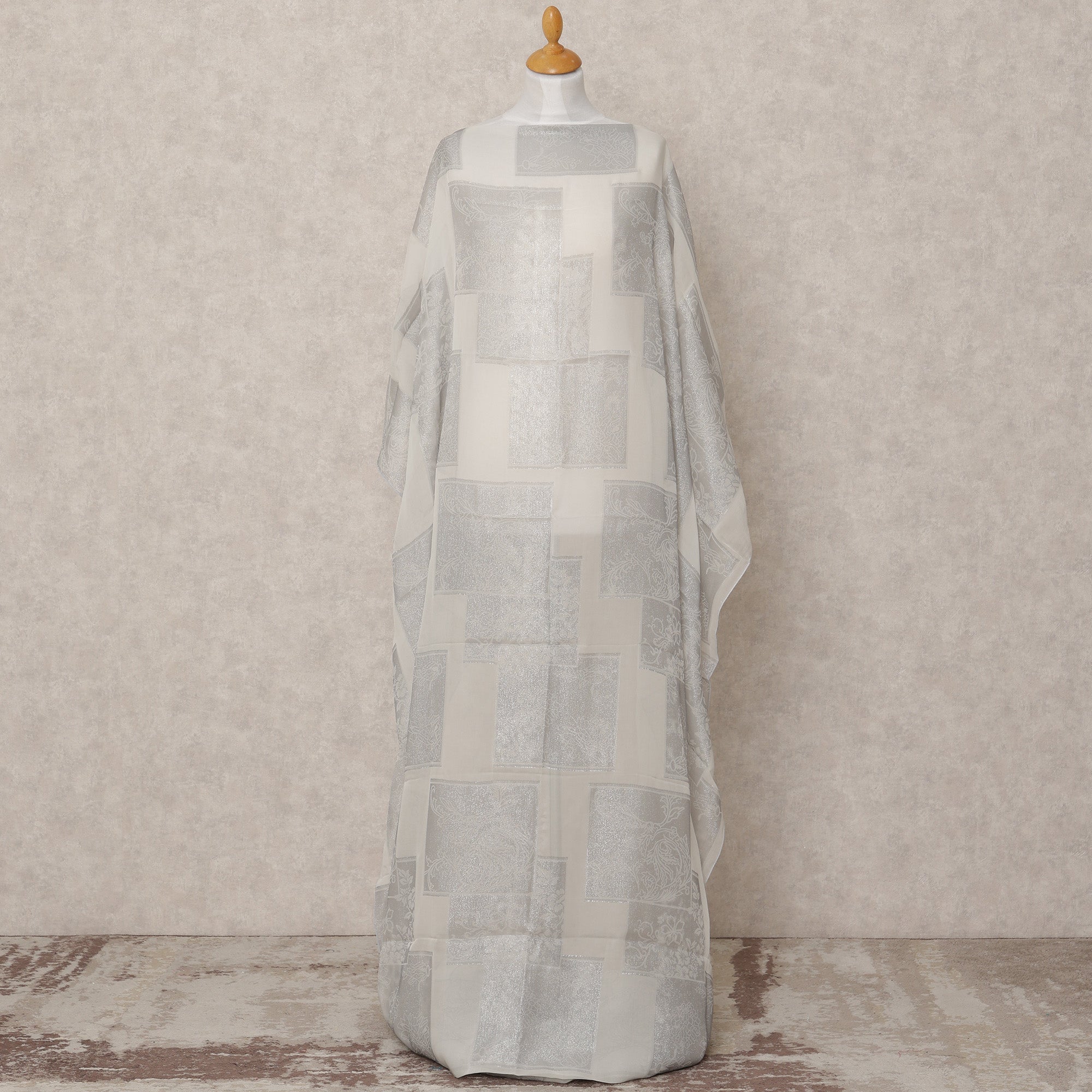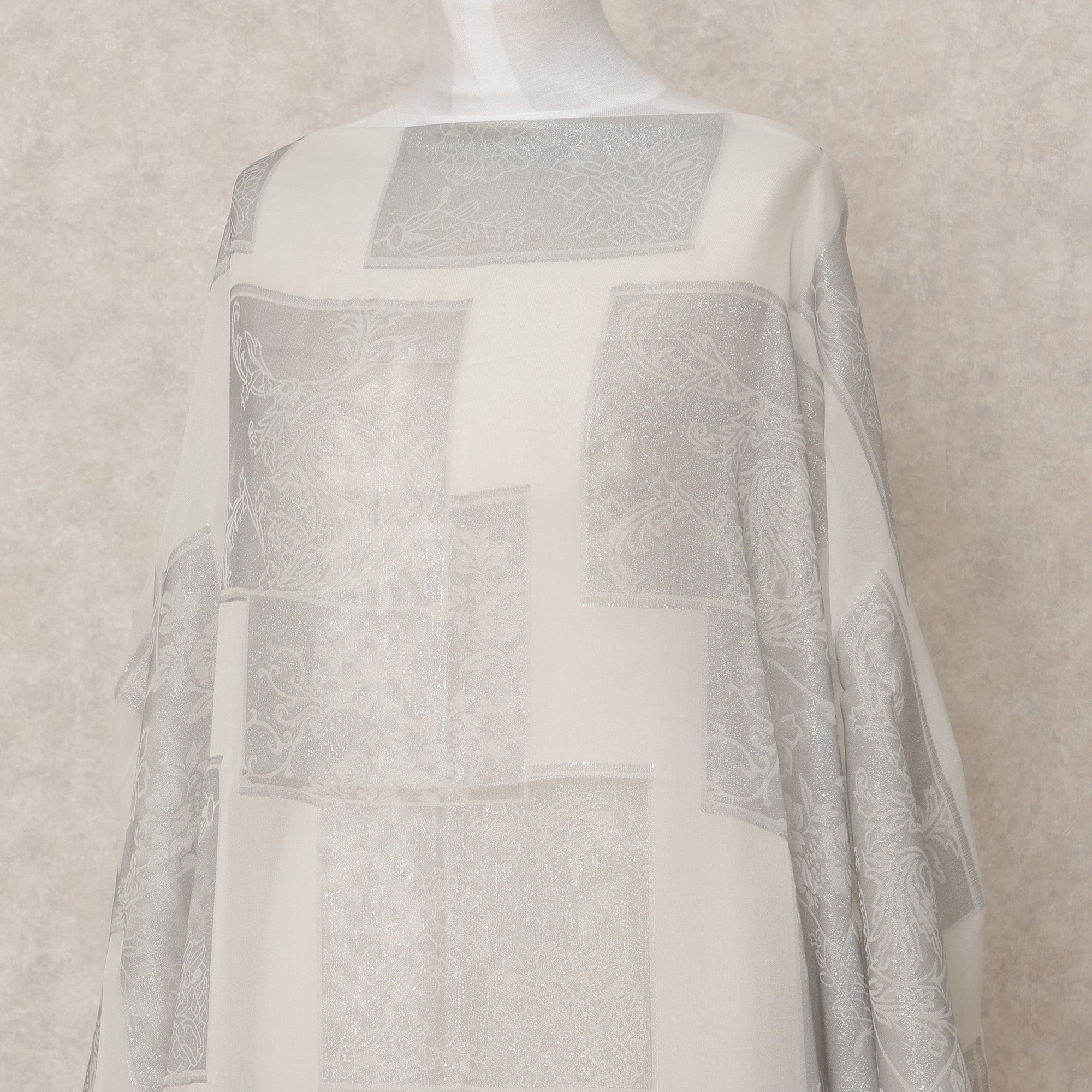 This ivory pure silk chiffon Somali dirac fabric with metallic silver lurex brings together timeless elegance and modern sparkle, ideal for graceful traditional attire. Crafted in South Korea, the semi-sheer silk chiffon base is delicately woven with silver lurex in a geometric box motif, adding shimmering sophistication to its lightweight and airy feel. With a 3.5-meter length and a width of 140 cm, this fabric provides generous coverage for creating dirac, abayas, or occasion wear that flows effortlessly. The soft texture, luxurious drape, and luminous detailing make this fabric a stunning choice for festive, bridal, or cultural ensembles.