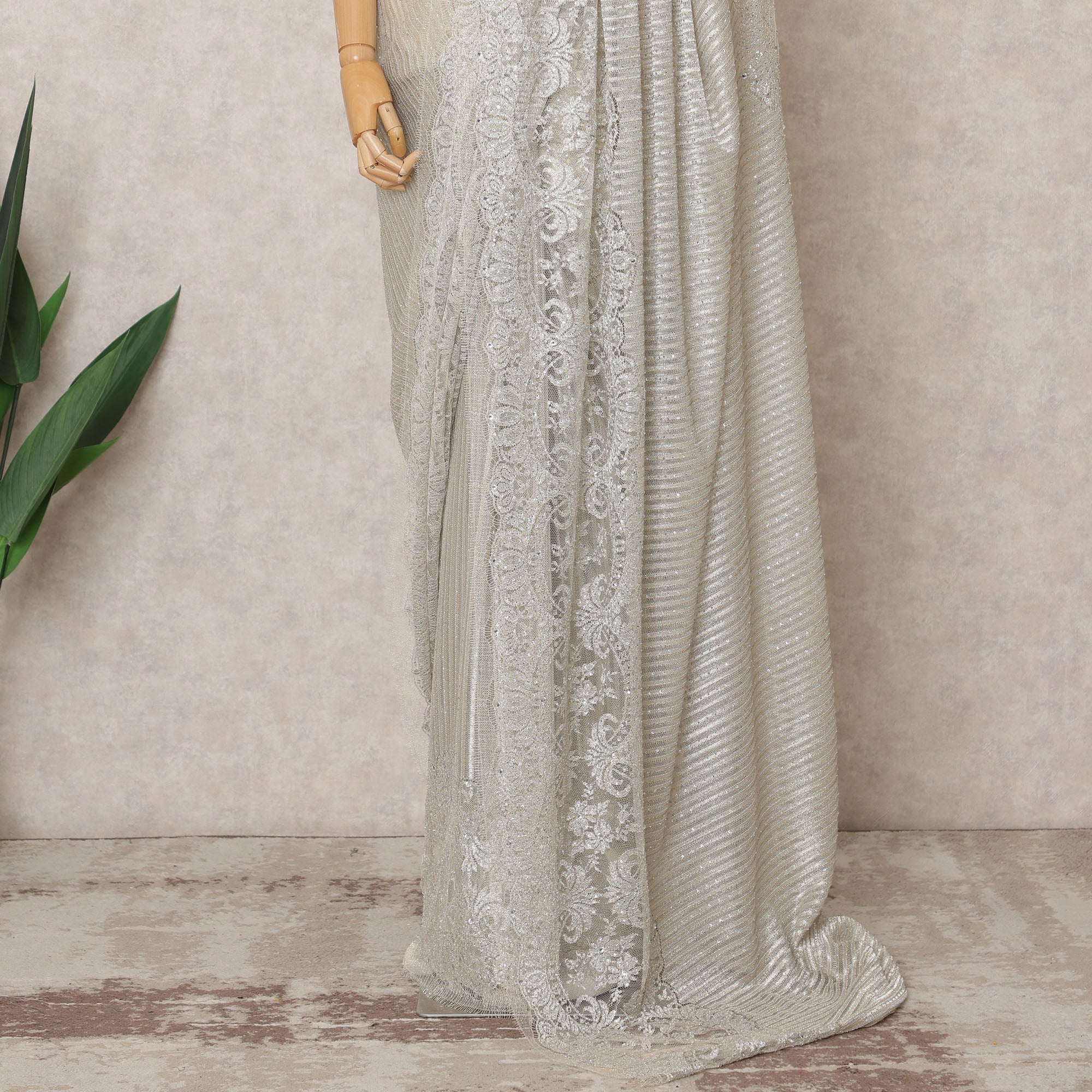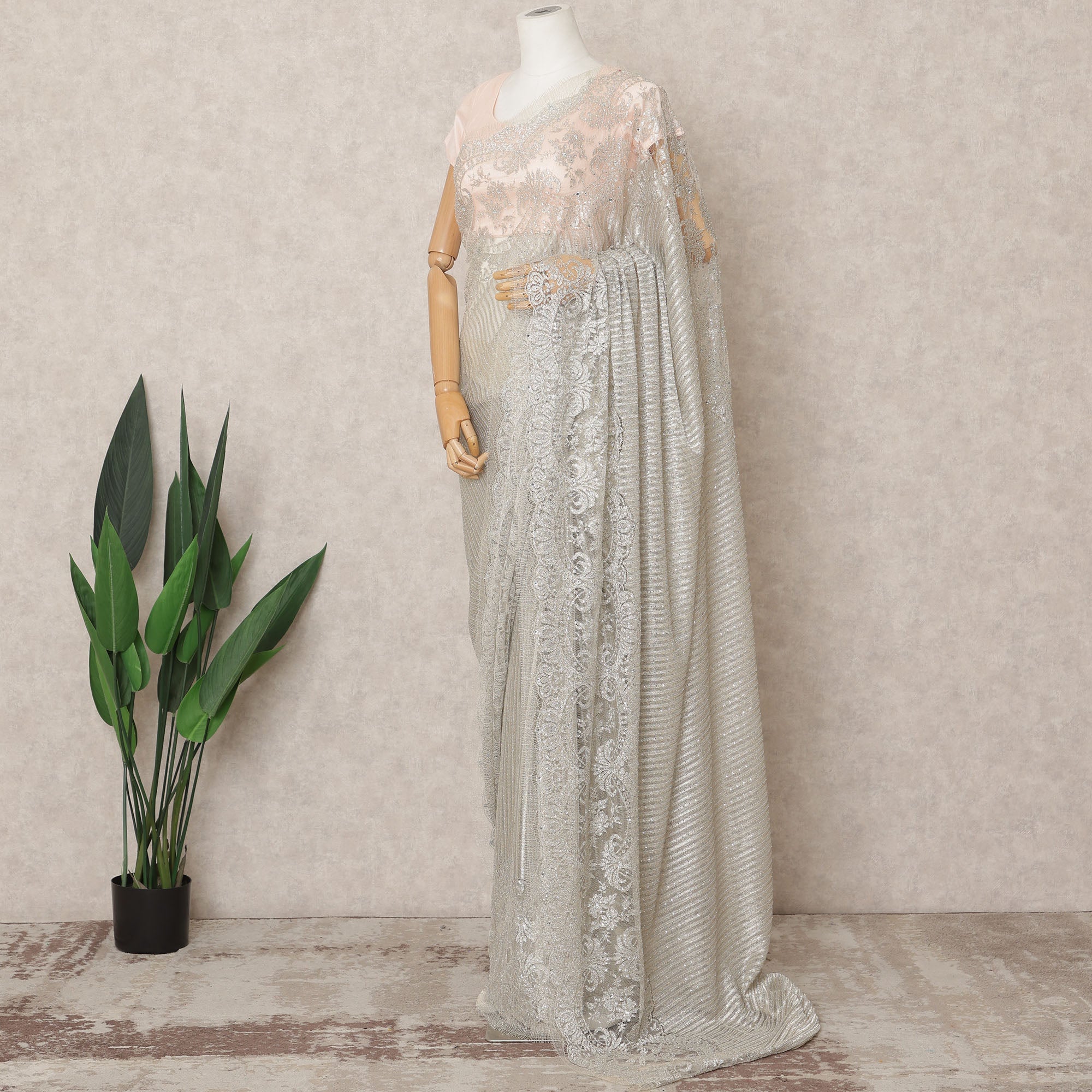 Ivory Silver Premium Metallic Chantilly Lace Saree with Stone Work, 5.5 Meters Length, 110 Cms Width, Made in France-D23888