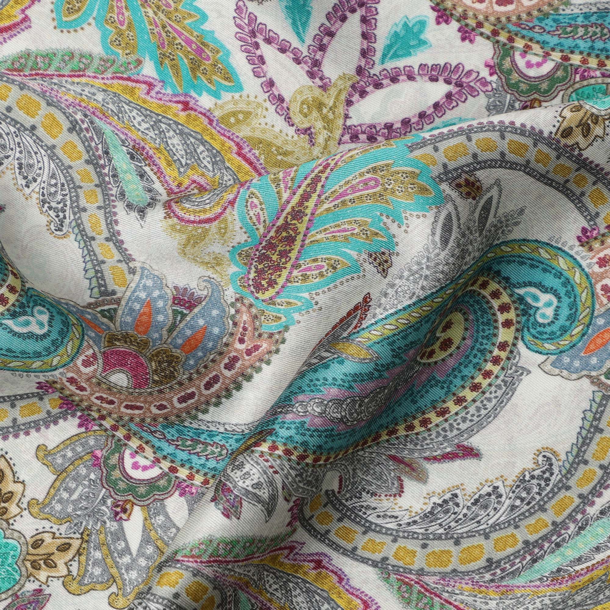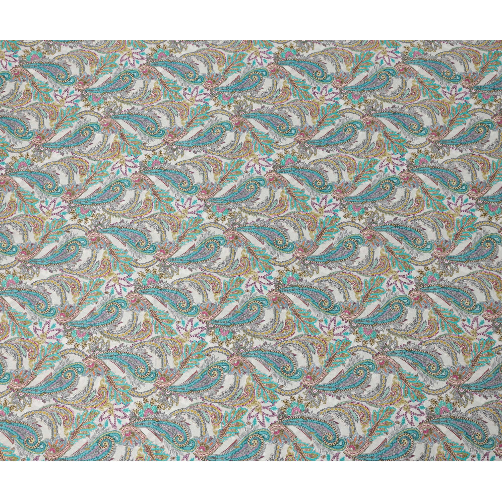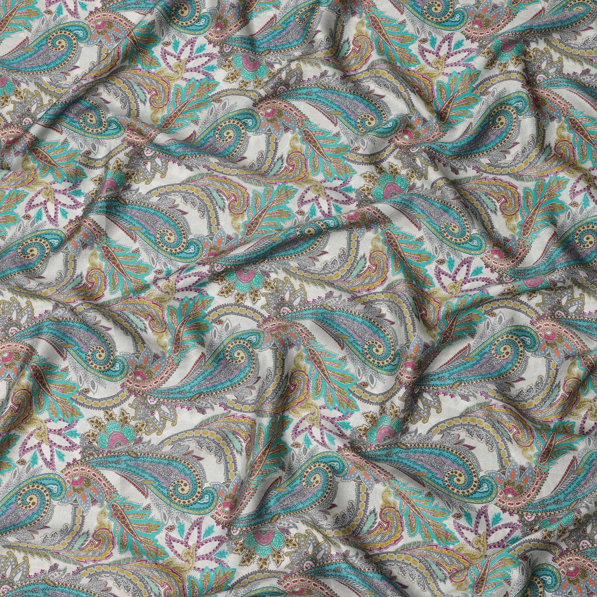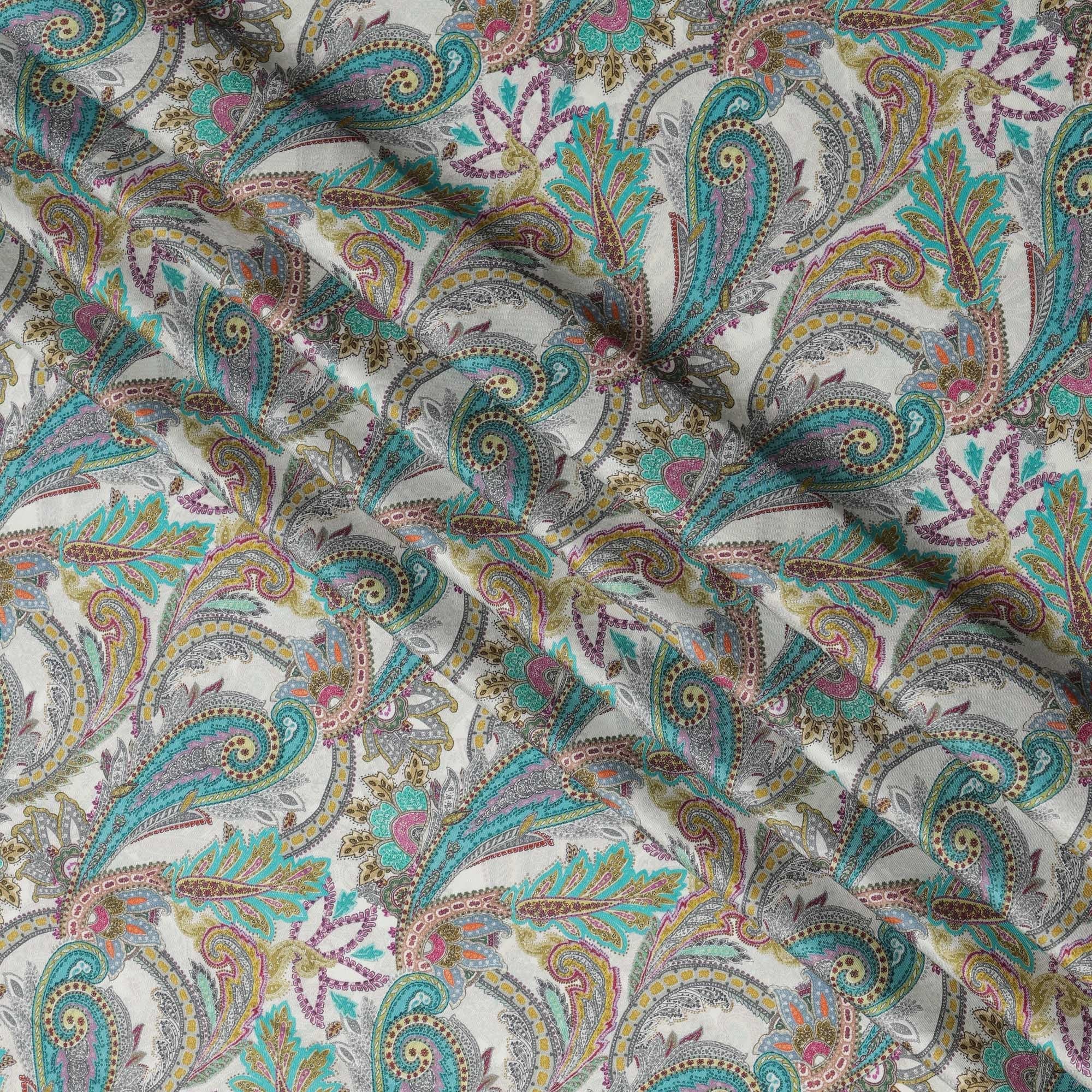 Ivory Teal and Magenta Paisley Print Viscose Modal Satin Fabric, 110 Cms Width, Made in India-D23311
