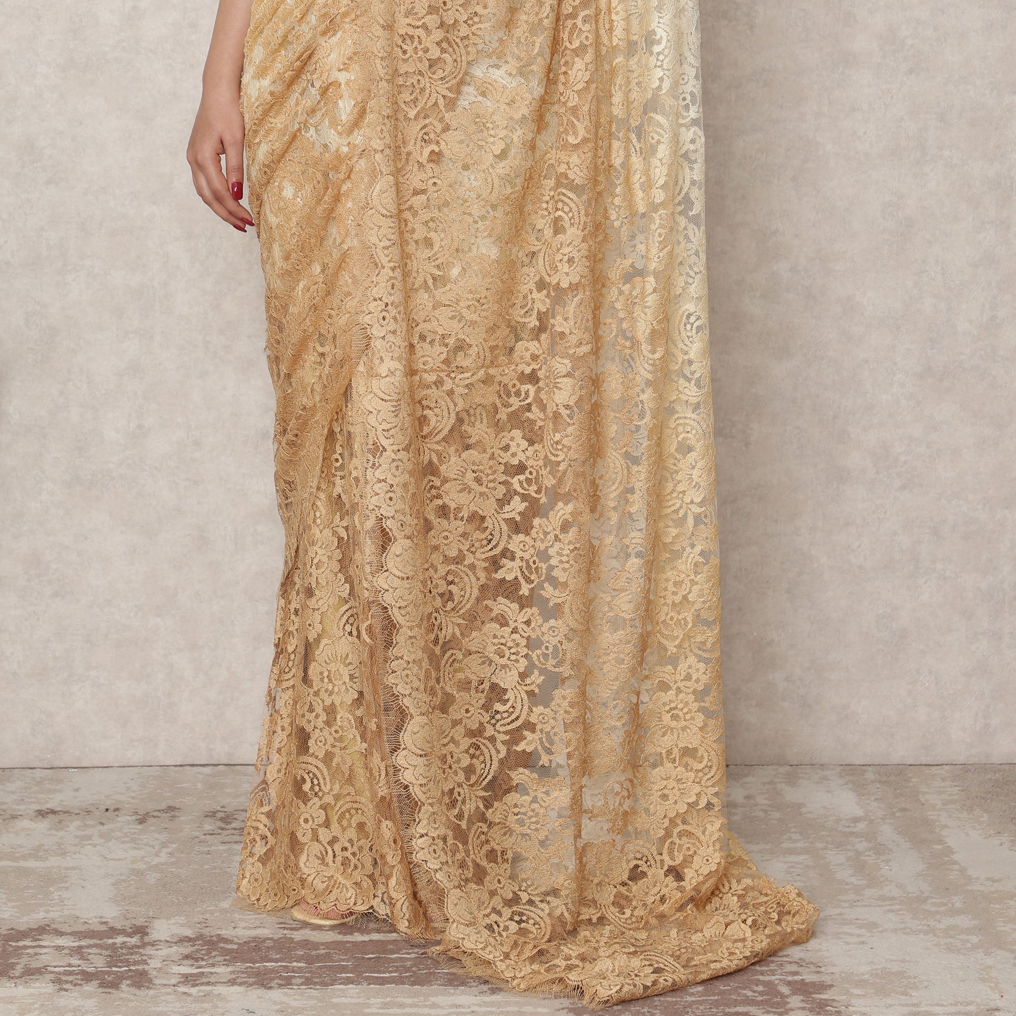 Ivory to Golden Beige Ombre Premium French Chantilly Lace Saree, 5.5 Mtrs Length, 110 Cms Width, Made in France-D24426