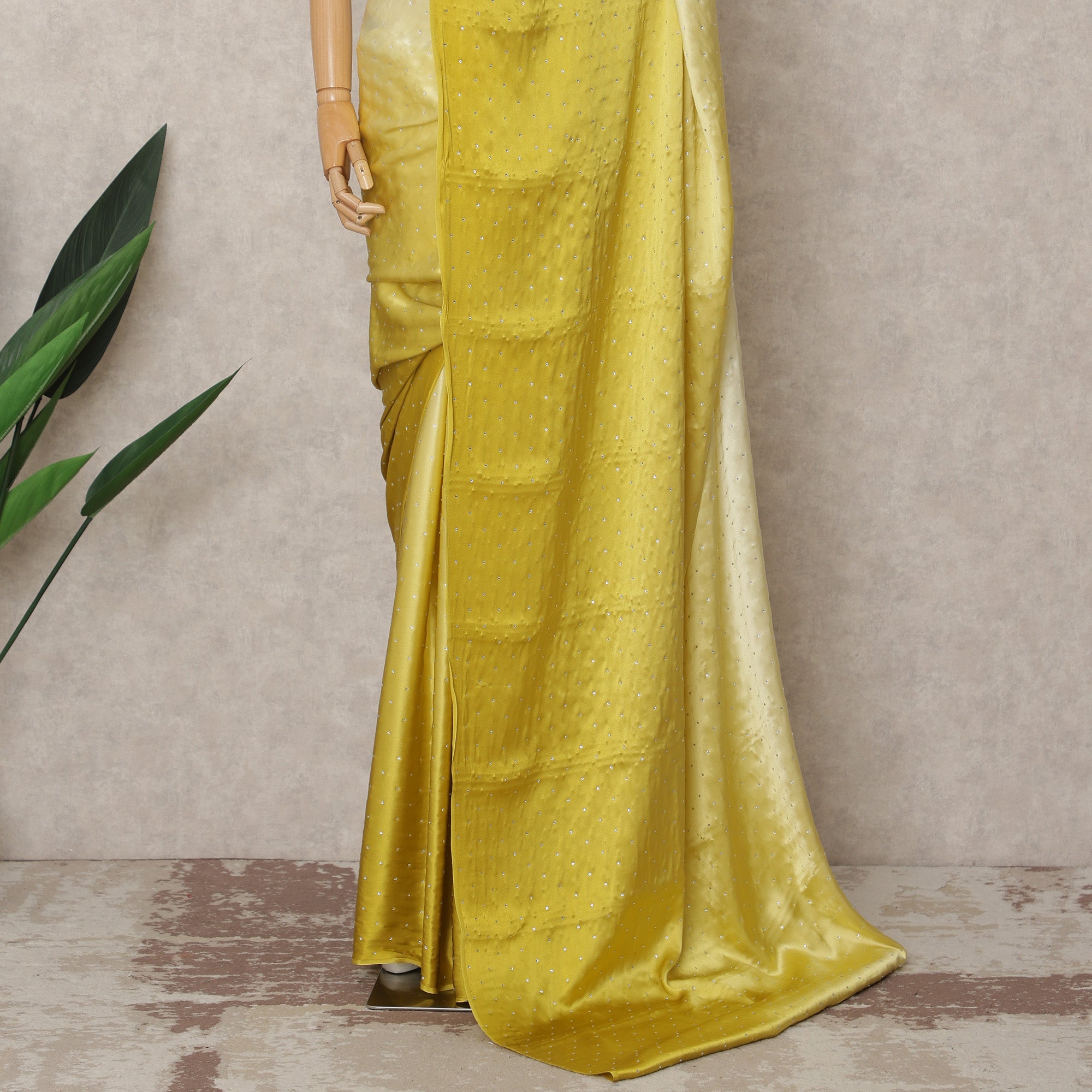 Ivory to Mustard Yellow Ombre Premium Silk Satin Saree with Stone Work, 5.5 Mtrs Length, 110 Cms Width, Made in South Korea-D24293