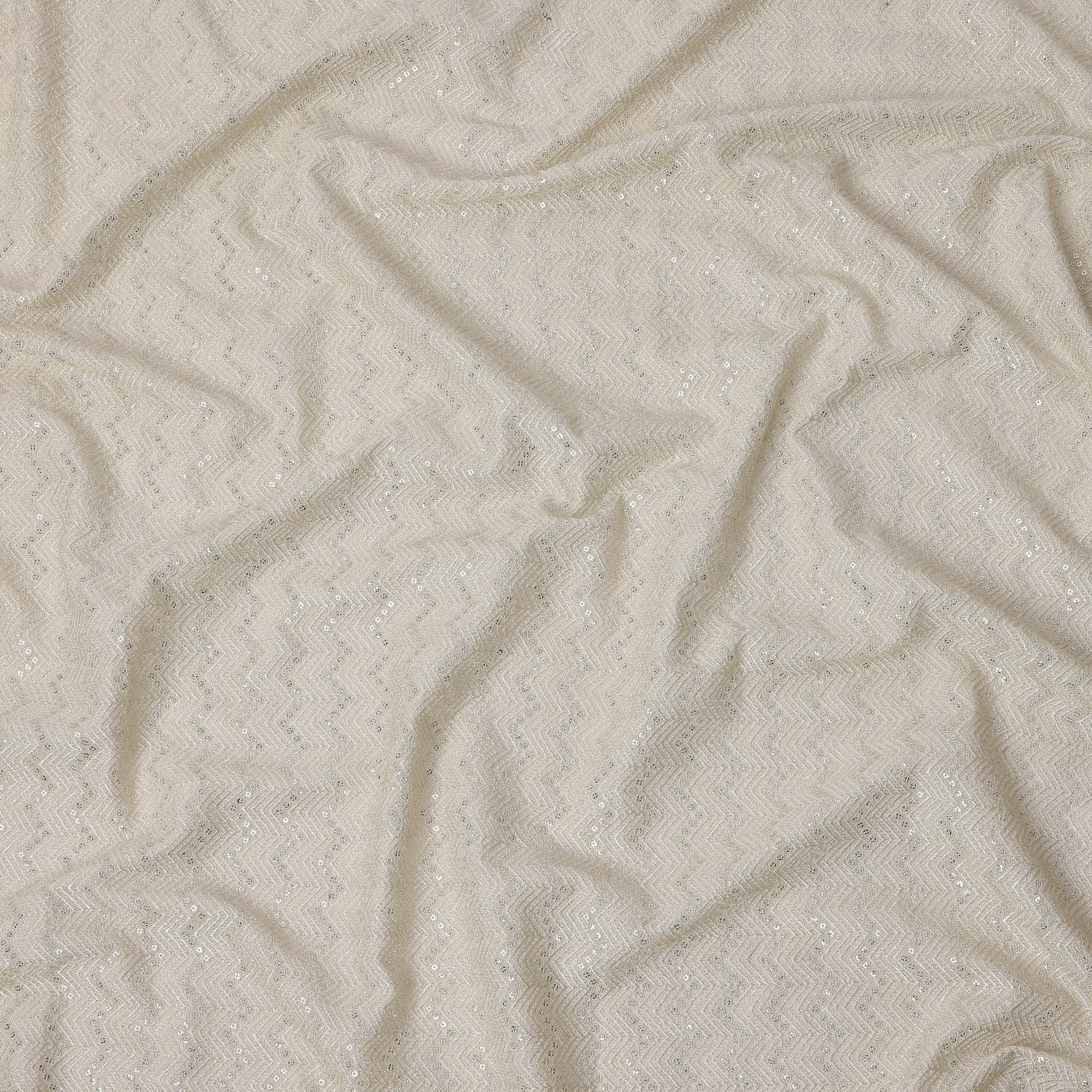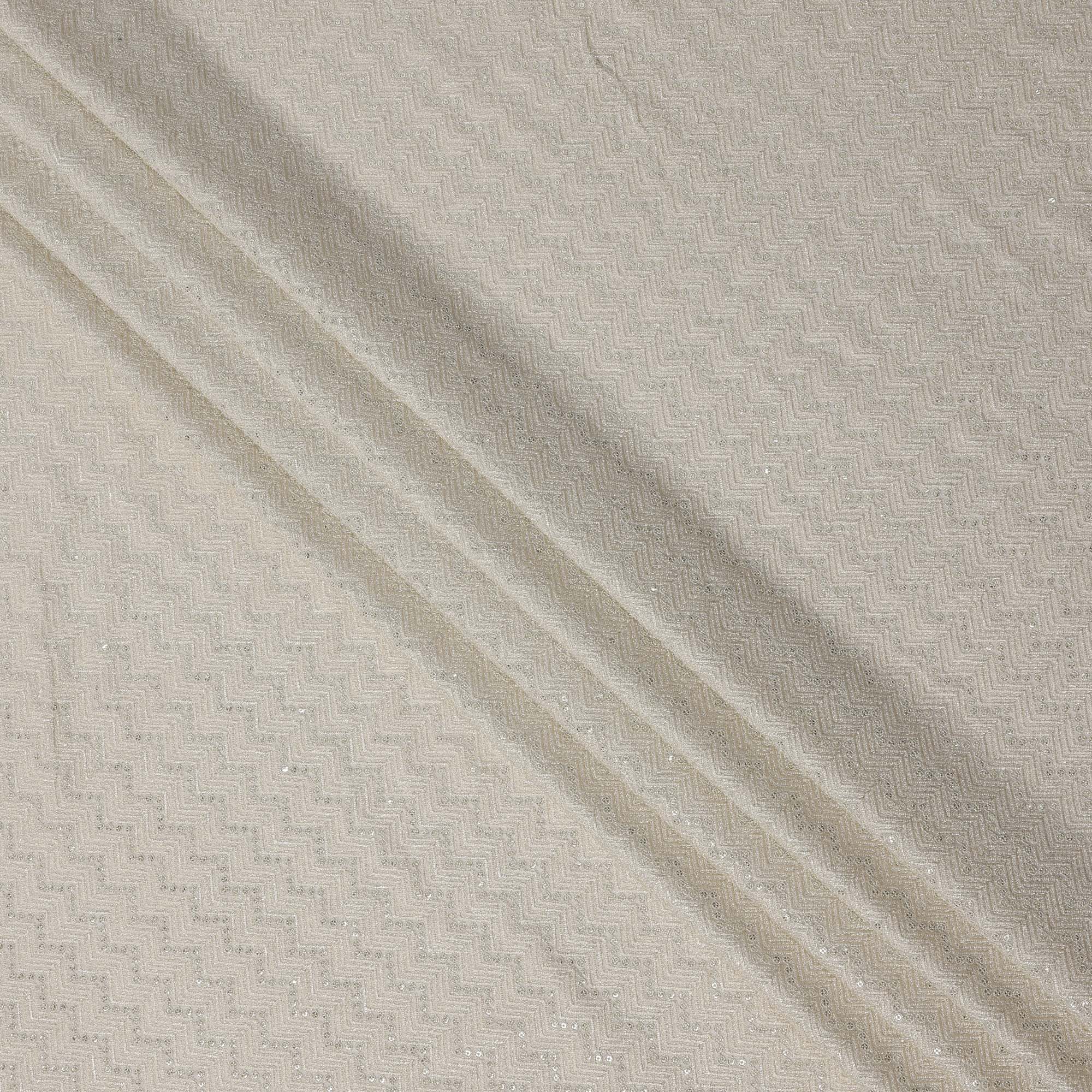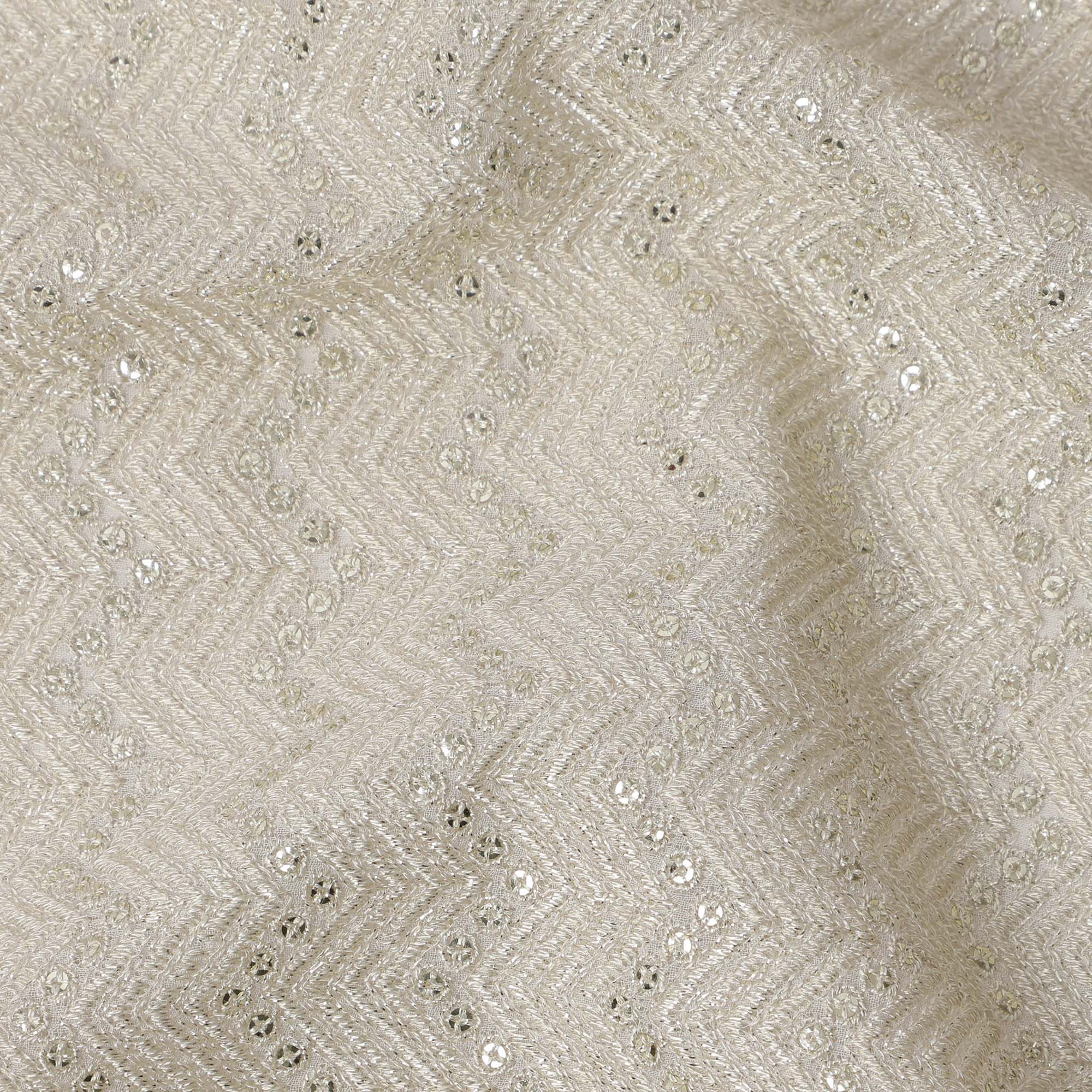 Ivory white chevron mirror embroidered synthetic blended viscose fabric, 110 Cms, India-D23829
