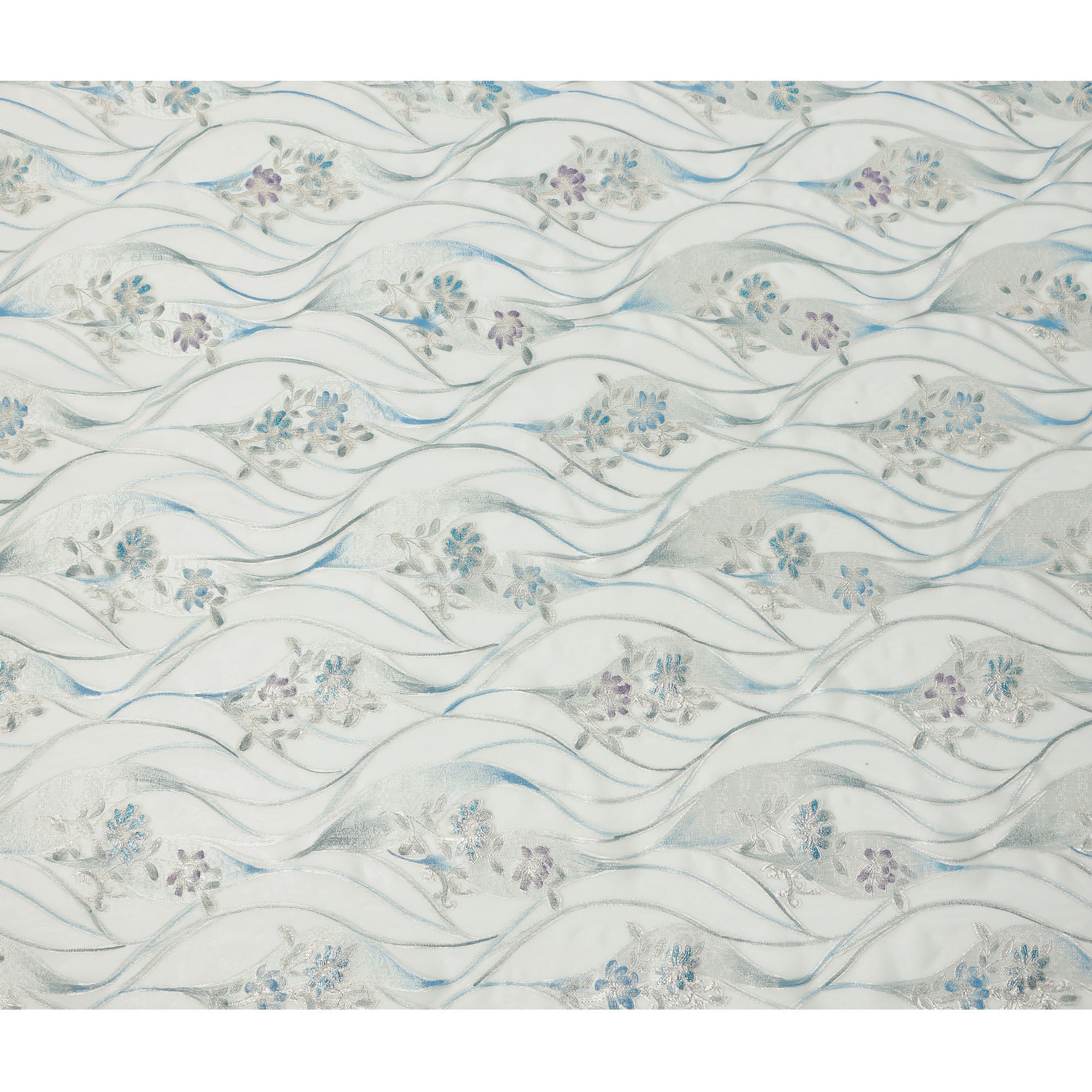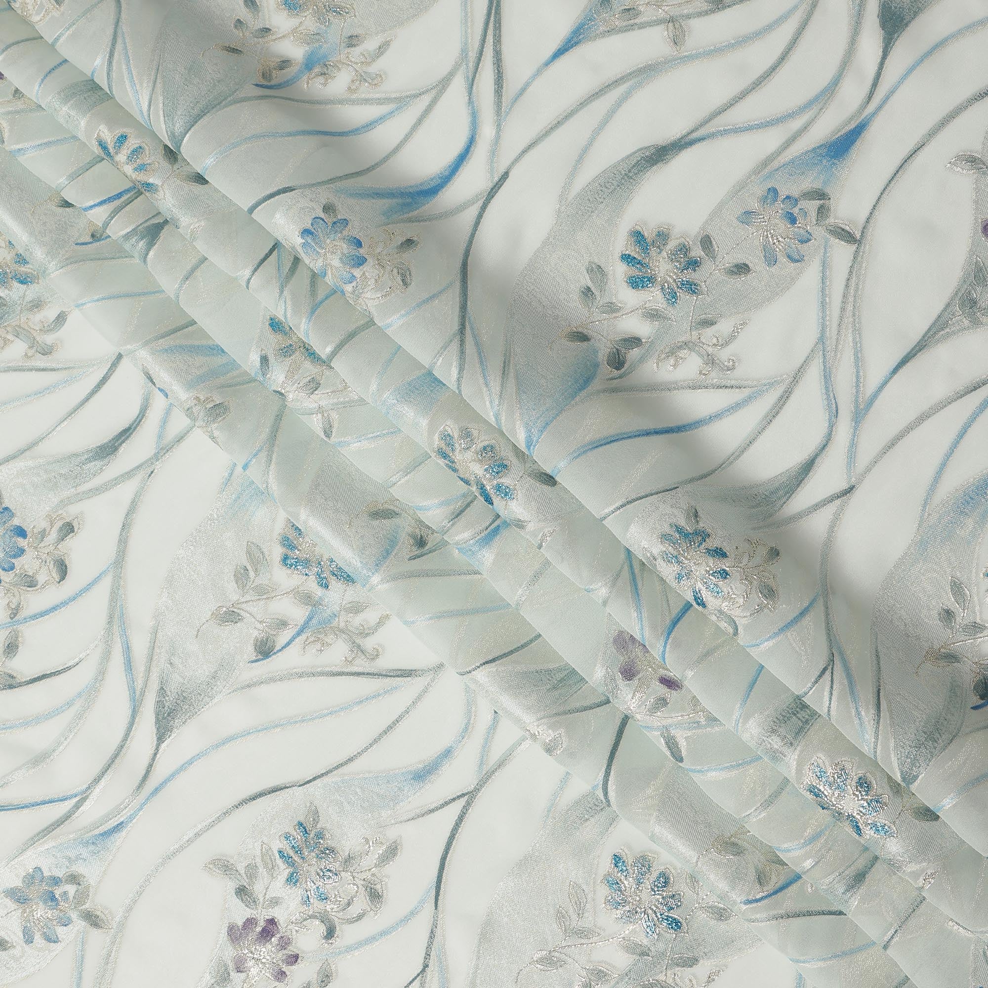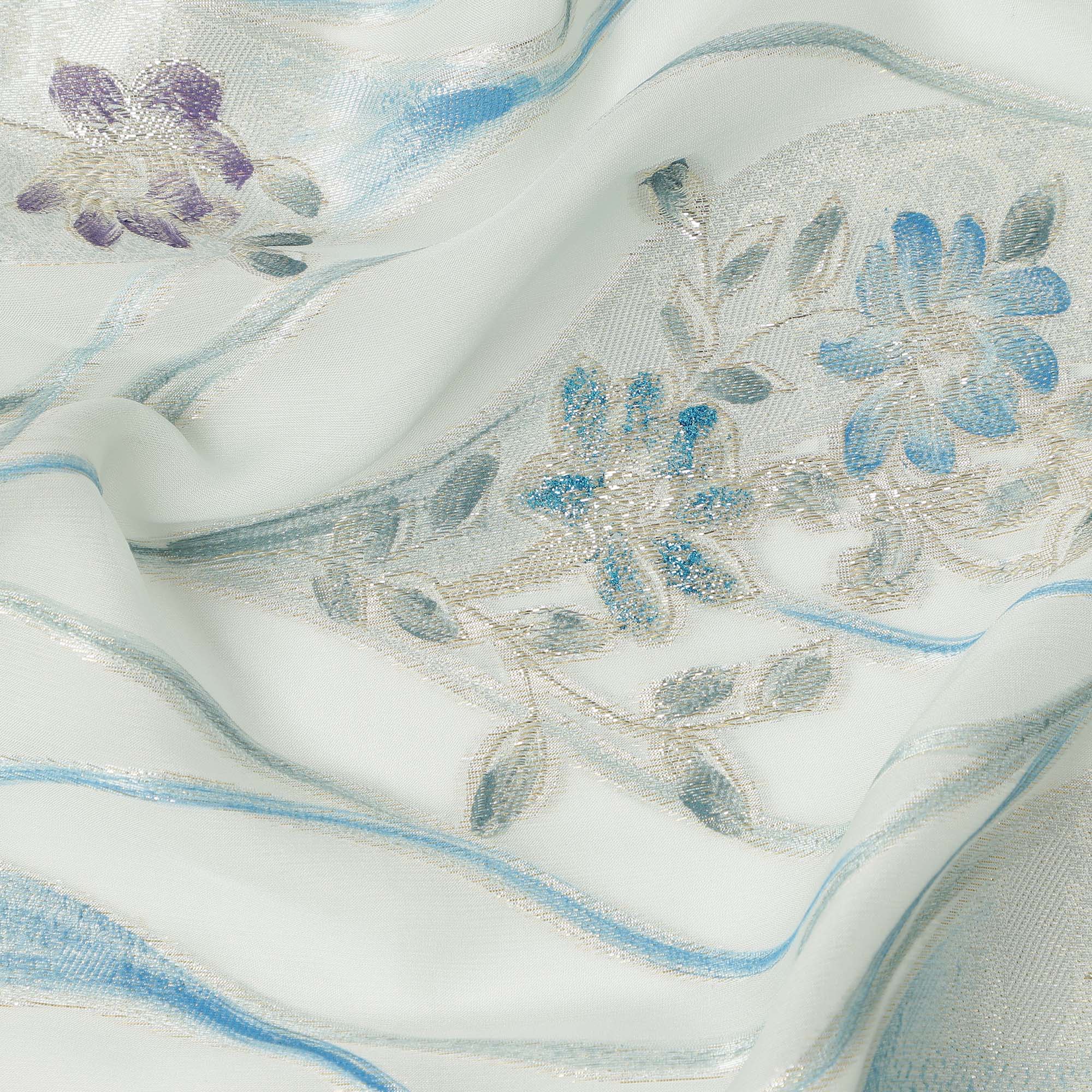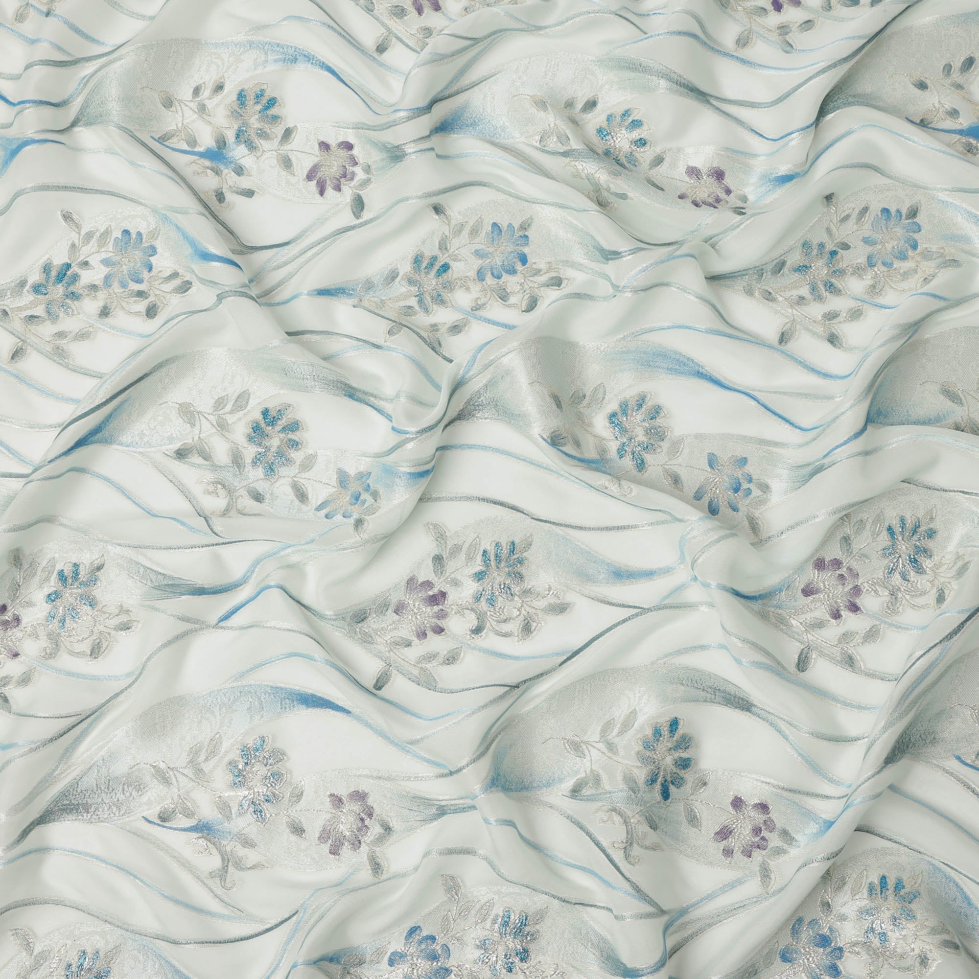 This premium pure silk chiffon fabric in an elegant ivory white shade exudes timeless sophistication and delicate charm. Adorned with a refined floral metallic hand print, the design features soft wave-like patterns highlighted with shimmering silver tones and subtle accents of blue and lavender florals that add depth and graceful movement. The lightweight and sheer silk chiffon base offers a fluid drape, airy comfort, and a smooth luxurious touch, making it ideal for high-end fashion creations. Perfect for crafting designer sarees, flowing gowns, dupattas, overlays, scarves, and occasion wear, this fabric beautifully balances traditional elegance with contemporary artistry. With a generous width of 110 cms, it allows ease of cutting and seamless pattern placement. Crafted with superior quality and imported from South Korea, this fabric is a refined choice for couture and premium ethnic or western ensembles.