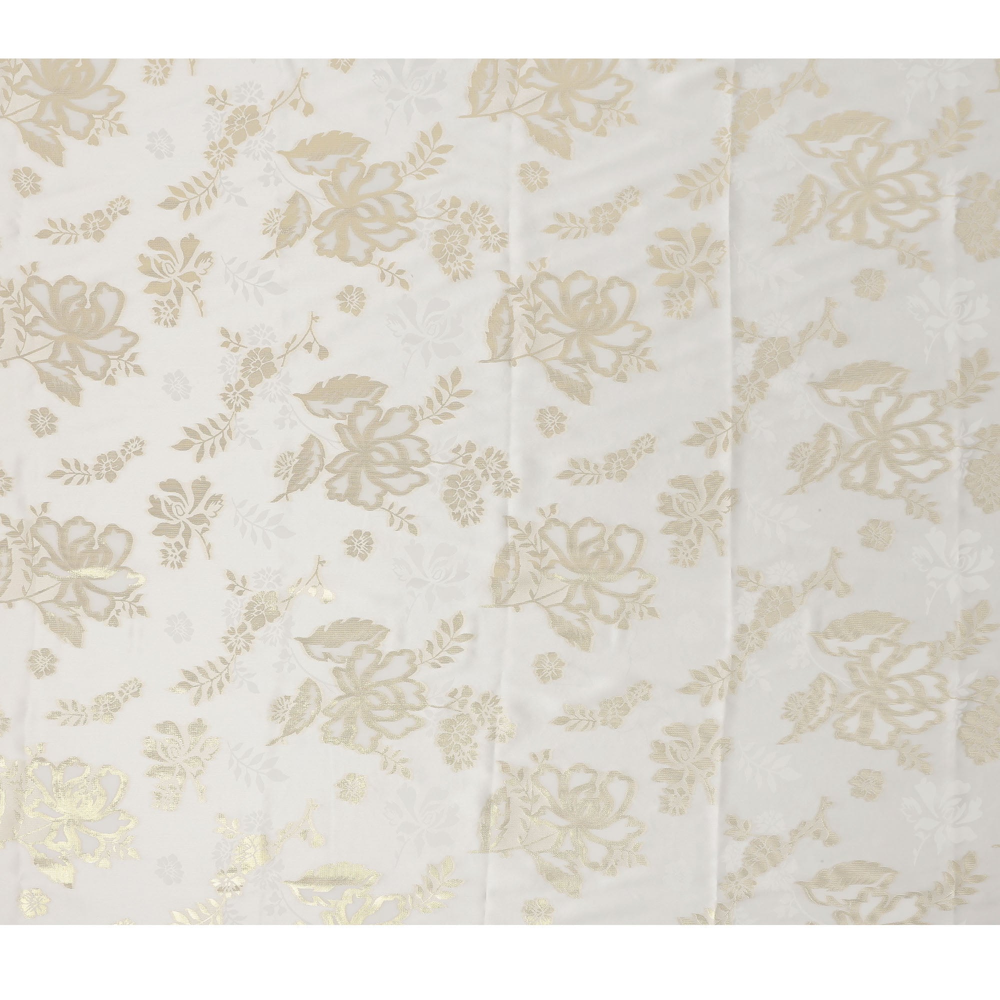 Premium ivory white silk satin fabric with delicate metallic floral jacquard weaving.