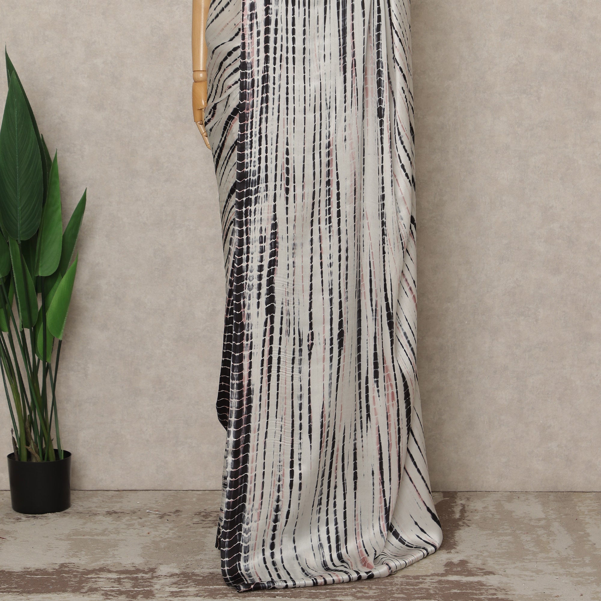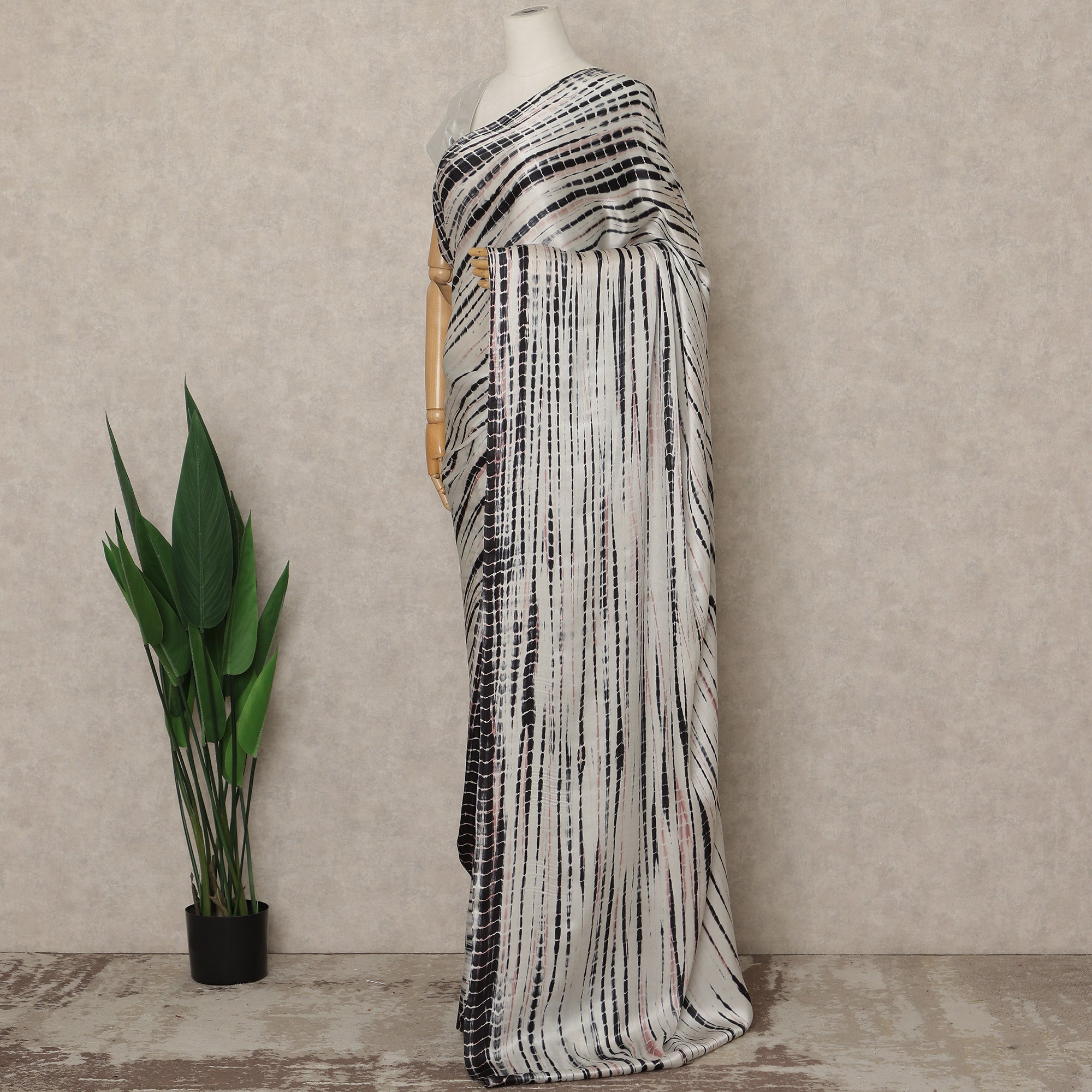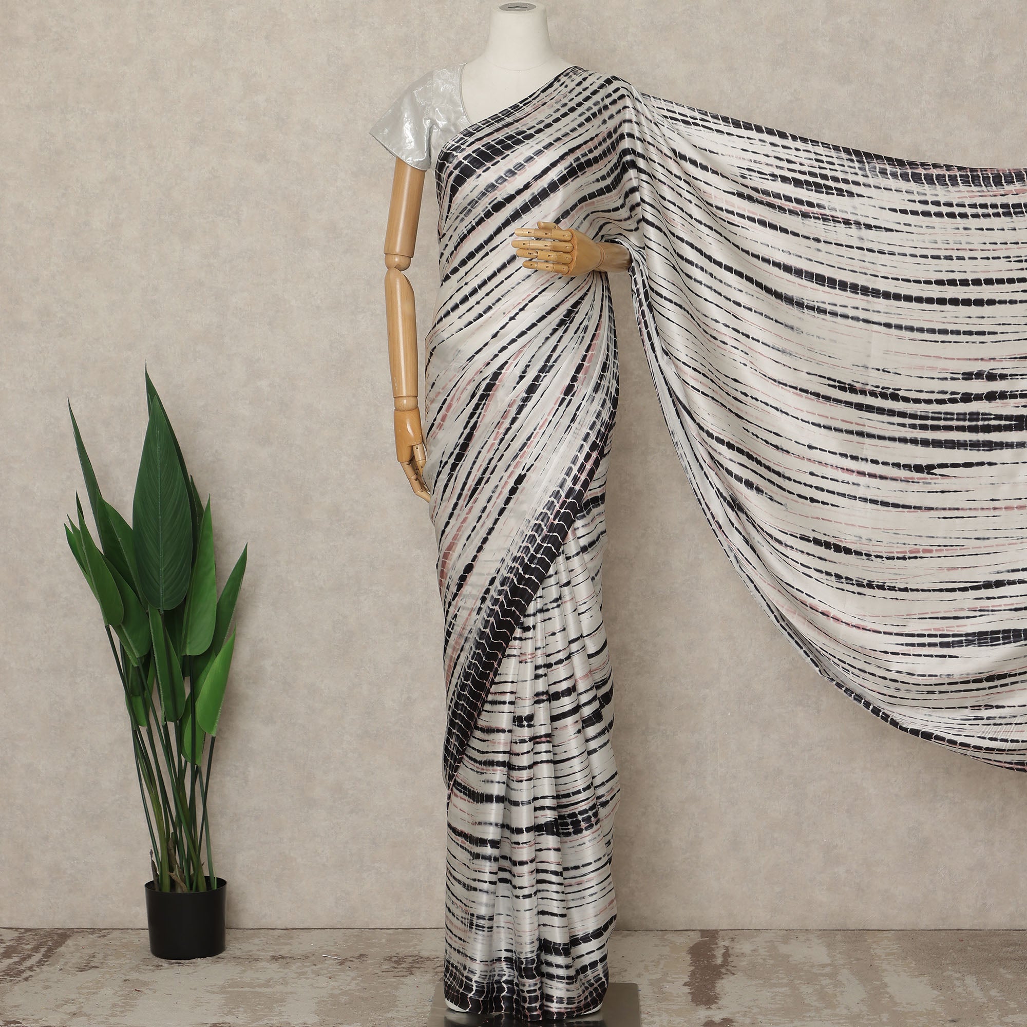 This premium pure silk satin saree features an elegant ivory white base enhanced with bold black abstract striped prints that create a striking and contemporary visual appeal. Crafted in India, the saree showcases a smooth satin texture with a natural sheen that drapes fluidly and feels luxuriously soft against the skin. Measuring approximately 5.5 meters in length and 110 cms in width, it offers ample fabric for classic pleating and graceful styling, making it suitable for formal gatherings, evening events, festive occasions, and sophisticated day wear. The refined contrast of ivory and black gives this saree a timeless yet modern character, perfect for women who value understated elegance and premium craftsmanship. Blouse piece is not included.