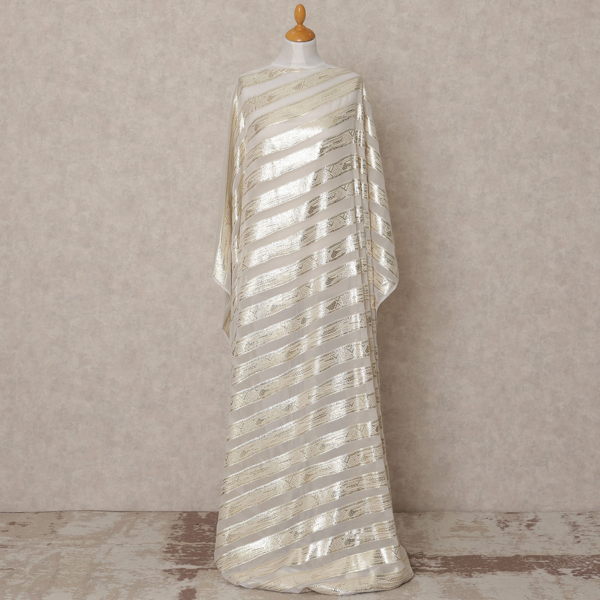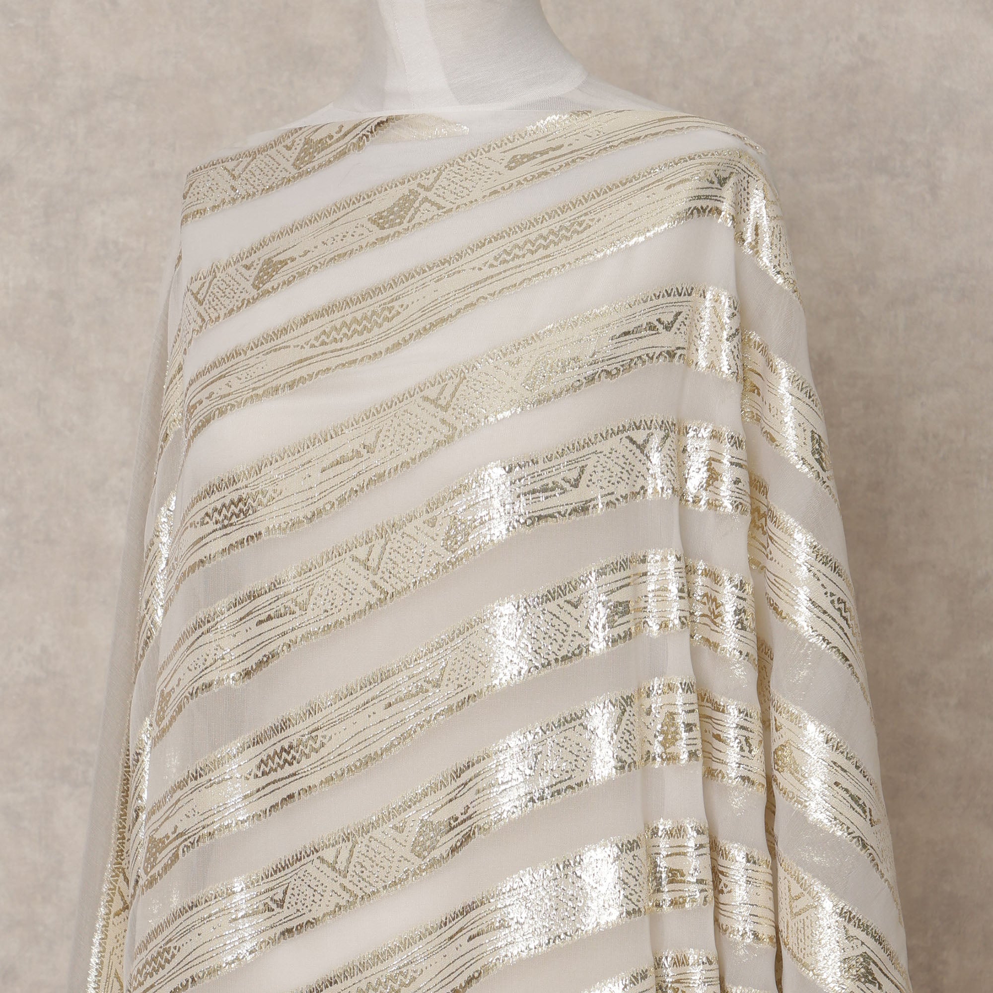 Ivory white chiffon base paired with luminous gold diagonal lurex stripes