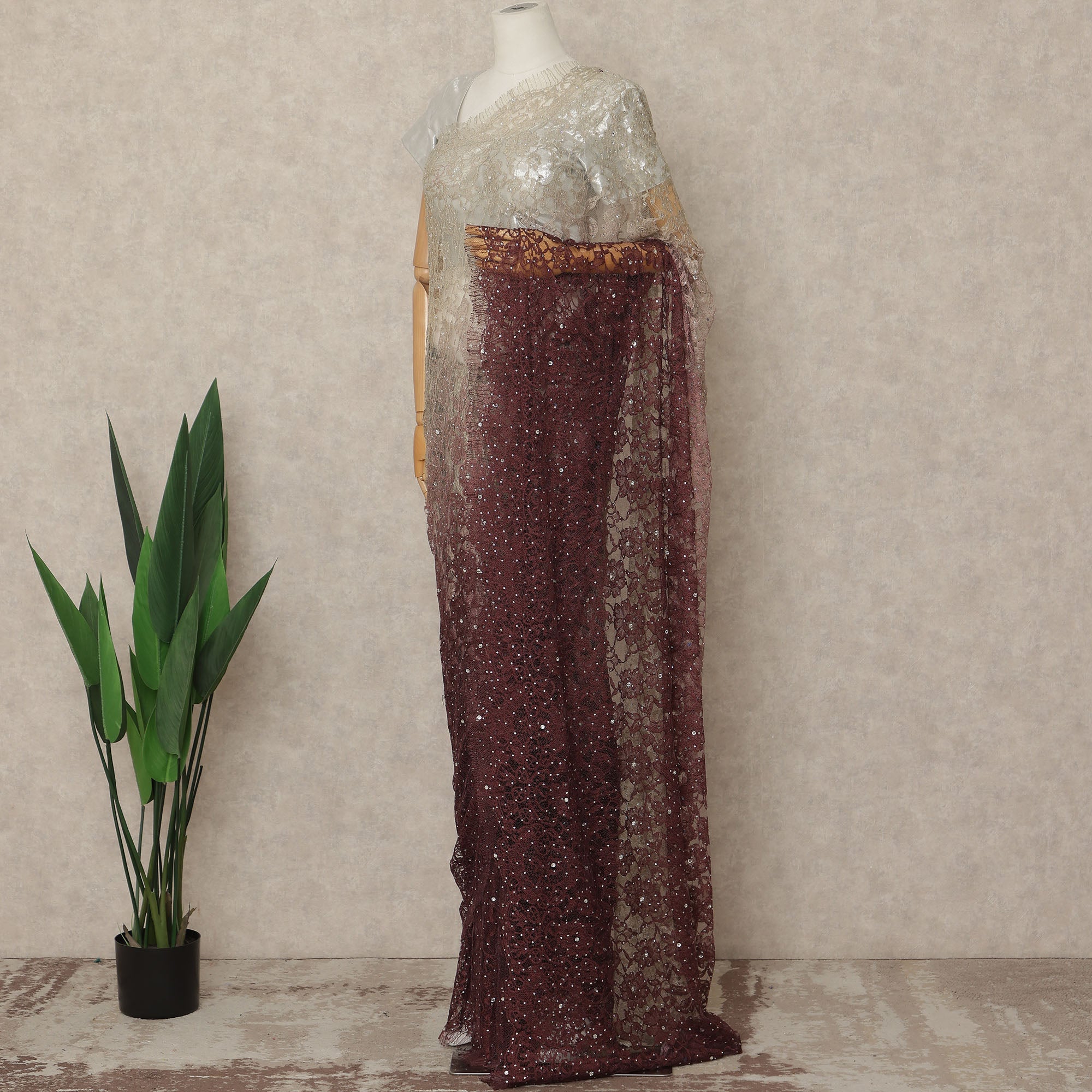 Ivory Wine Premium French Ombre Chantilly Saree Lace With Stone Work 5.5 Mtrs Length 110 Cms Width Designer Net Fabric Made In France, Blouse Not Included-D28102