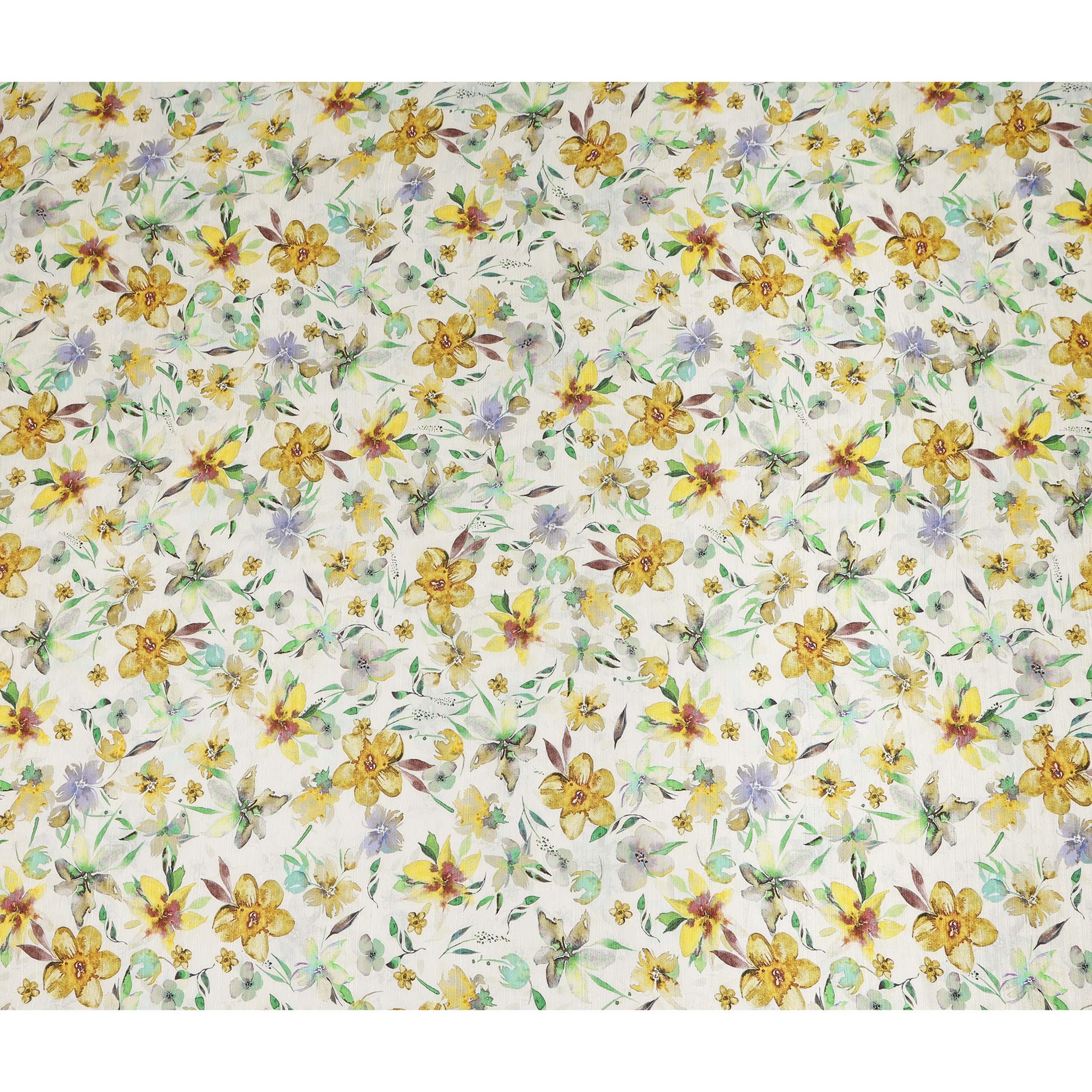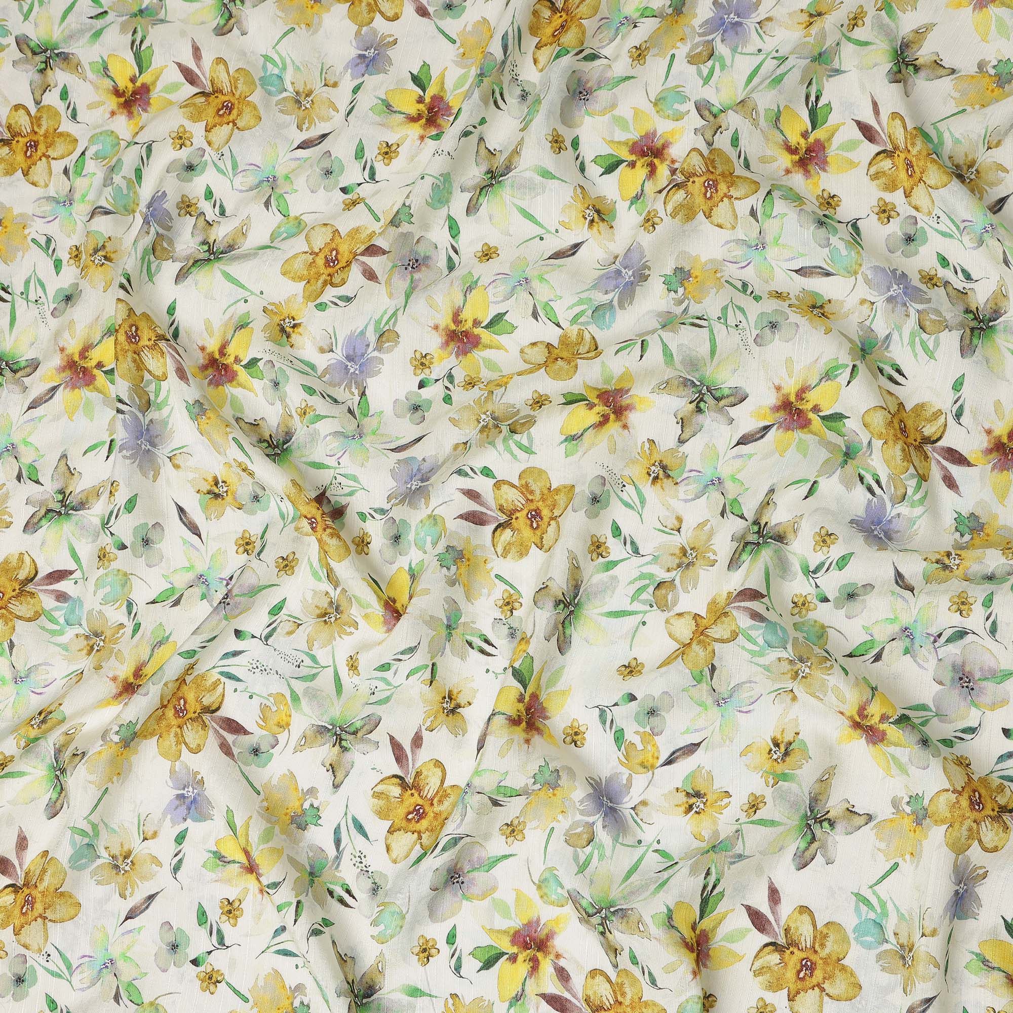 Ivory base with watercolor yellow floral print creates a fresh botanical look suitable for modern fashion garments.
