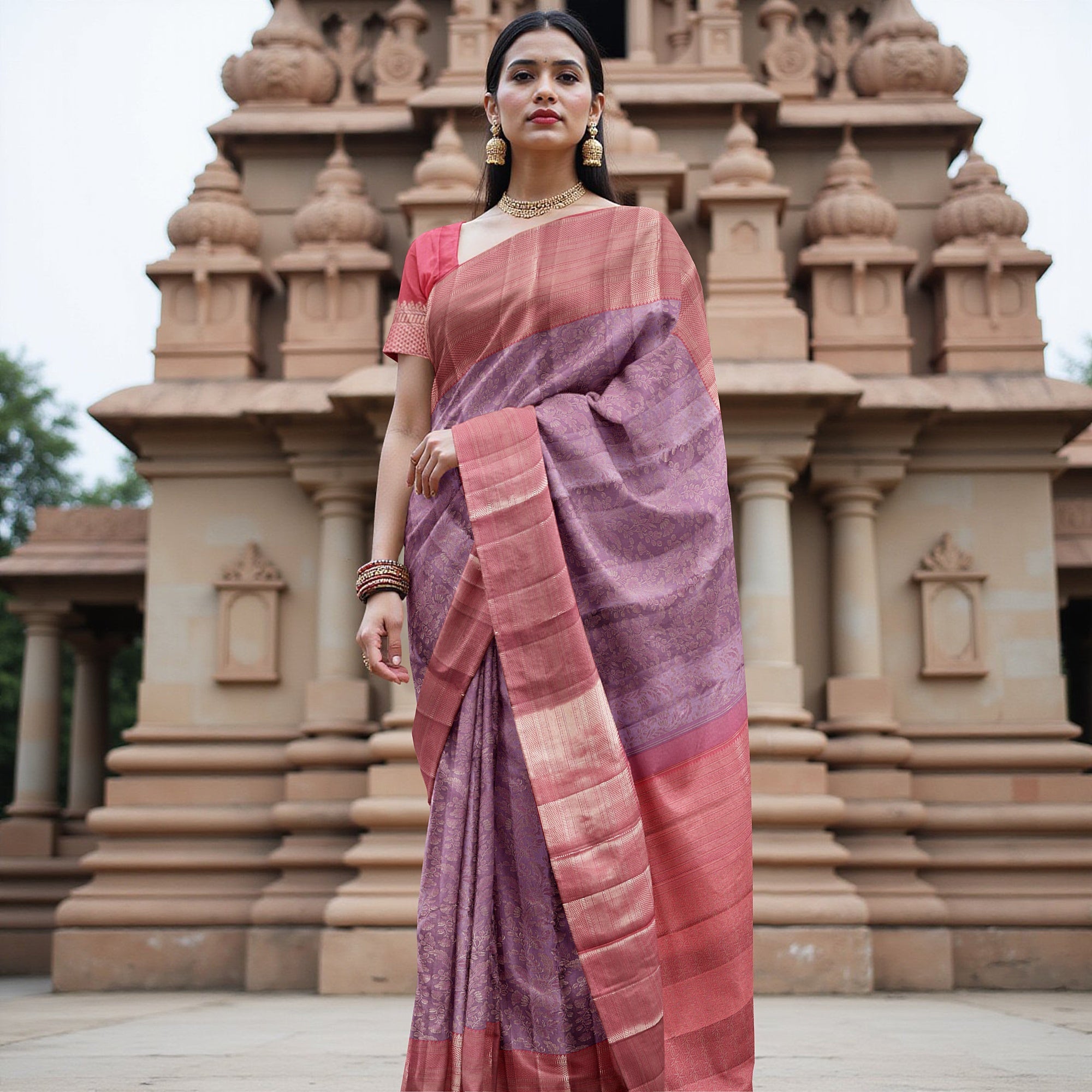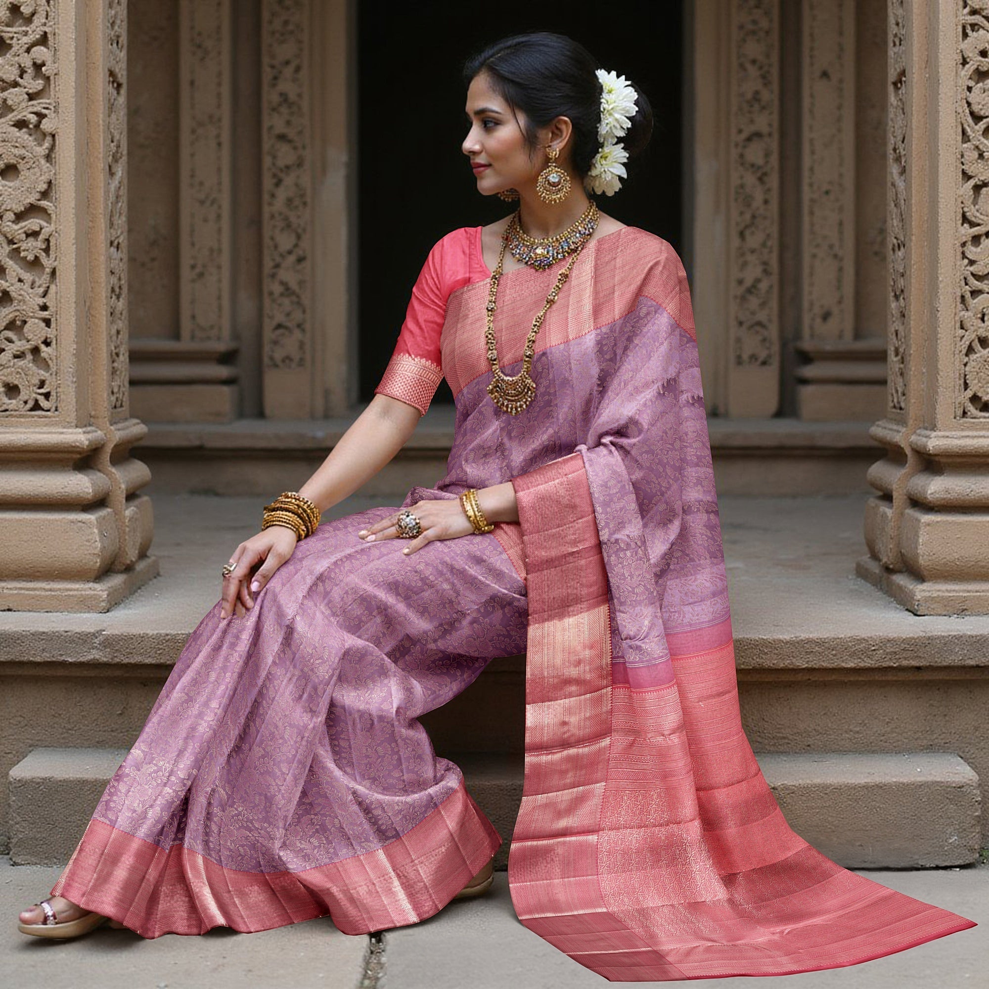 This Lavender and Coral Pure Silk Kanjeevaram Saree is a graceful fusion of artistic storytelling and heritage weaving. Woven with... Read more Read more