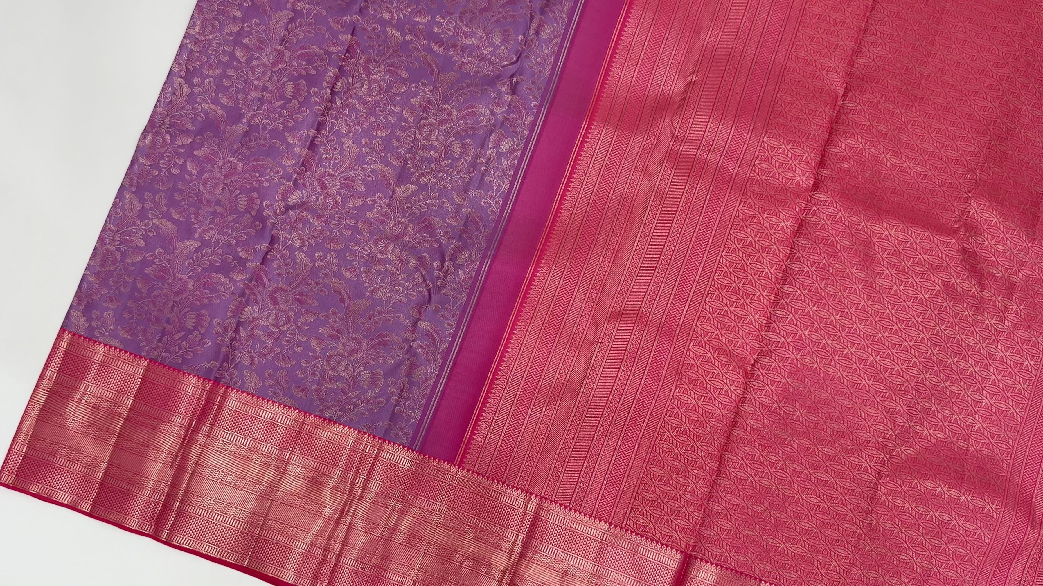 This Lavender and Coral Pure Silk Kanjeevaram Saree is a graceful fusion of artistic storytelling and heritage weaving. Woven with premium Regal Fabrics silk, the saree features a detailed lavender panel intricately handwoven with ornamental motifs that echo the decorative flourishes of South Indian mural traditions. The soft coral base and border offer a striking contrast, enriched with traditional zari elements that add elegance and warmth to the composition. Taking 48 hours to weave by hand, each saree is a result of enduring dedication passed through generations of expert artisans. This saree is an ideal choice for weddings, temple occasions, and festive celebrations—each drape a blend of heritage and grace. Shop online to embrace a handwoven treasure of timeless beauty. Dry clean only to retain the silk’s brilliance and delicate craftsmanship.