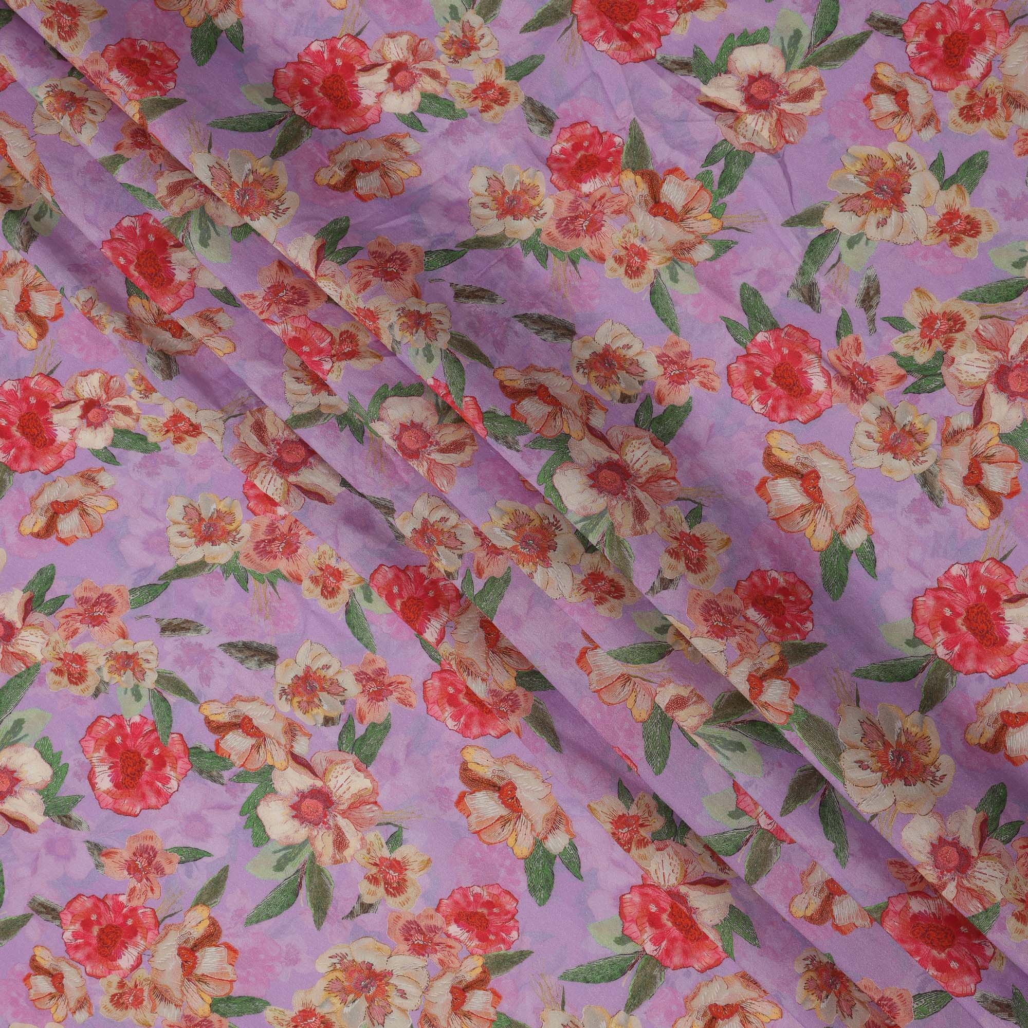 Infuse your creations with vibrant floral elegance through this Lavender Base Red and Ivory Floral Printed Viscose Crepe Fabric, thoughtfully... Read more Read more
