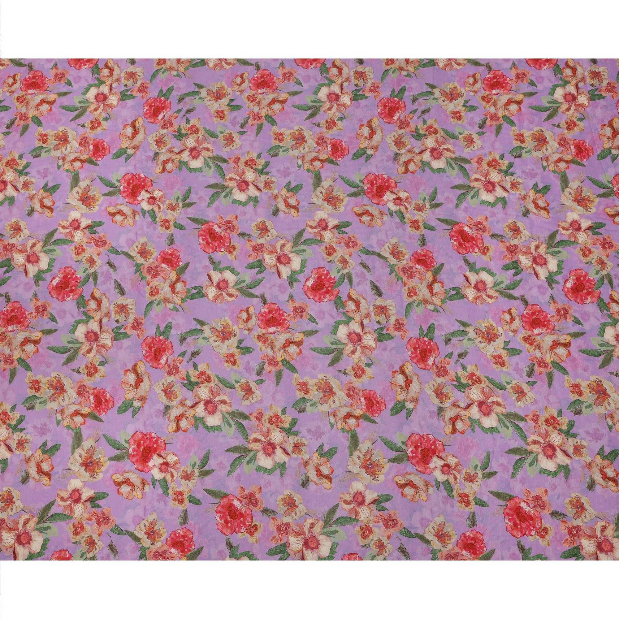 Infuse your creations with vibrant floral elegance through this Lavender Base Red and Ivory Floral Printed Viscose Crepe Fabric, thoughtfully designed for contemporary yet culturally rooted fashion. The soft lavender base is enriched with painterly red blossoms and ivory florals, interspersed with leafy green accents that lend the fabric a fresh and spirited aura. Digitally printed with fine detailing, the design appears vivid and lifelike on smooth viscose crepe that drapes effortlessly. Lightweight and breathable, this 110 cms wide fabric is ideal for stitching breezy summer kurtas, dresses, palazzos, or dupattas with a fashionable flair. Its slightly crinkled crepe texture enhances visual depth while offering comfort in warm weather. Digitally printed in India, this fabric is a stylish choice for anyone looking to shop online for vibrant floral prints on soft, flowing materials that stand out in both everyday and semi-formal ensembles.