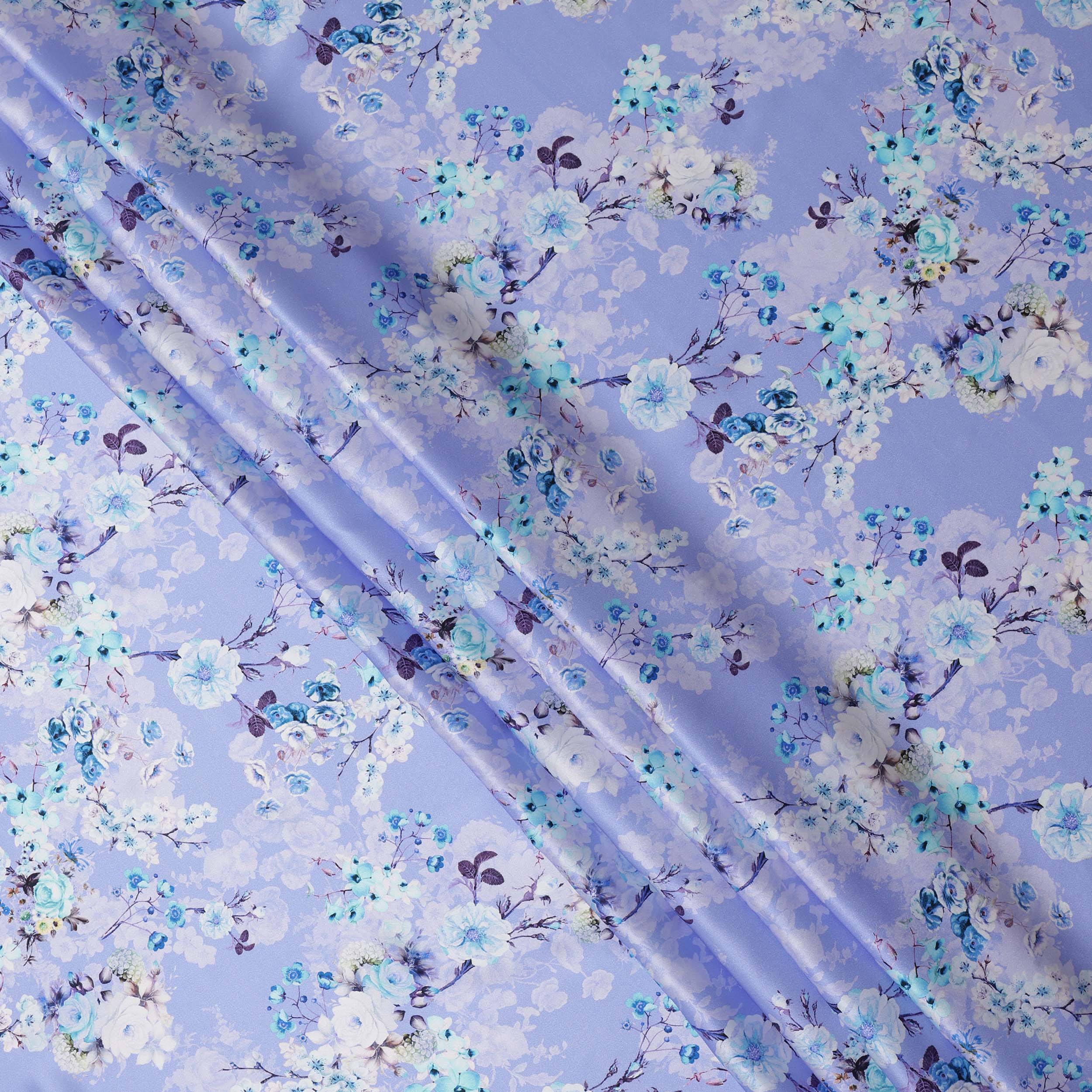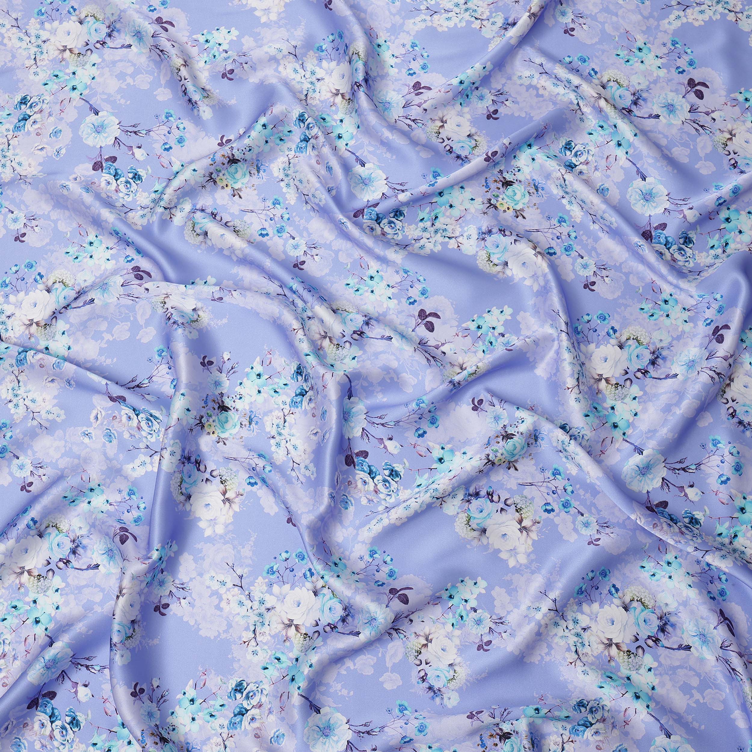 Premium lavender blue pure silk satin fabric with elegant floral print.