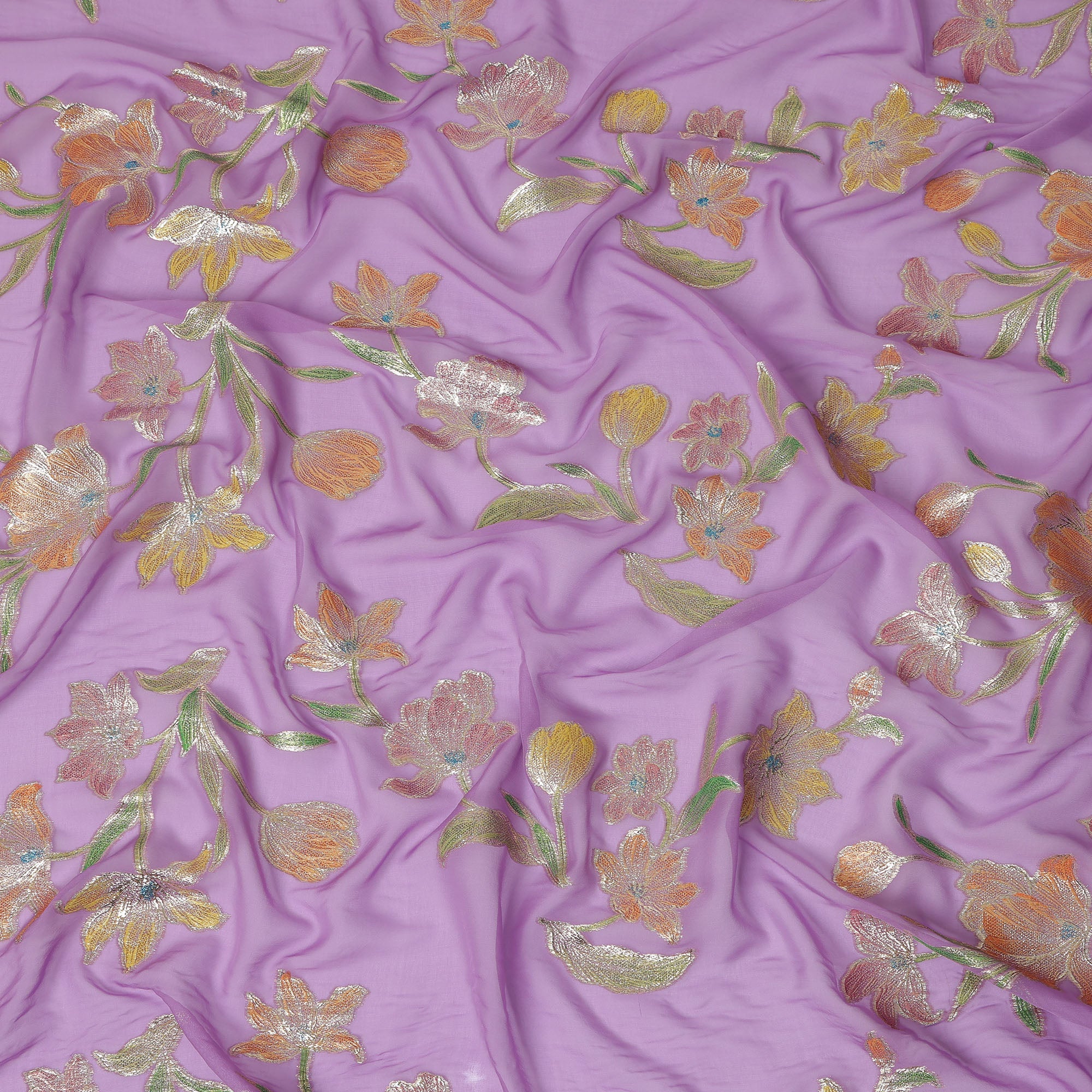 Lavender Floral Embroidered Metallic Lurex Design Premium Silk Chiffon Fabric, 110 Cms Width, Made in South Korea-D25751