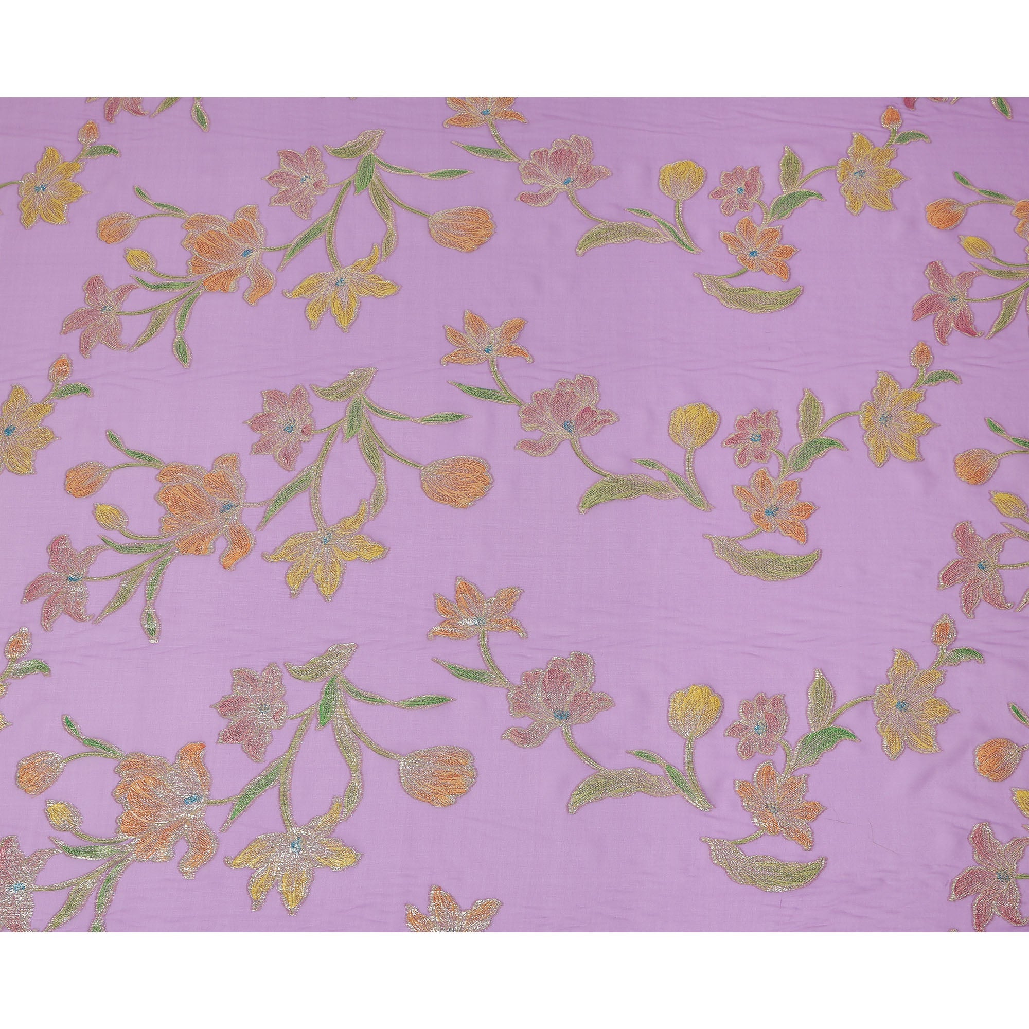 Exude elegance and sophistication with this Lavender Premium Silk Chiffon fabric, delicately embroidered with floral motifs highlighted by metallic lurex threads that add a radiant sheen. Crafted in South Korea, this exquisite fabric combines timeless grace with modern artistry, featuring a soft lavender base that enhances the vibrant hues of peach, yellow, and gold embroidery. The intricate floral design reflects meticulous craftsmanship, while the metallic accents add a subtle sparkle that elevates its charm. Lightweight, airy, and smooth to the touch, this chiffon fabric drapes beautifully, making it ideal for sarees, gowns, dupattas, and couture creations. Its luminous finish and fine detailing make it perfect for festive, bridal, and elegant evening wear. Designed for discerning fashion enthusiasts, this Korean silk chiffon redefines luxury through precision and creativity. To preserve its brilliance and texture, dry clean only. Shop online now to experience the perfect harmony of color, sheen, and sophistication.