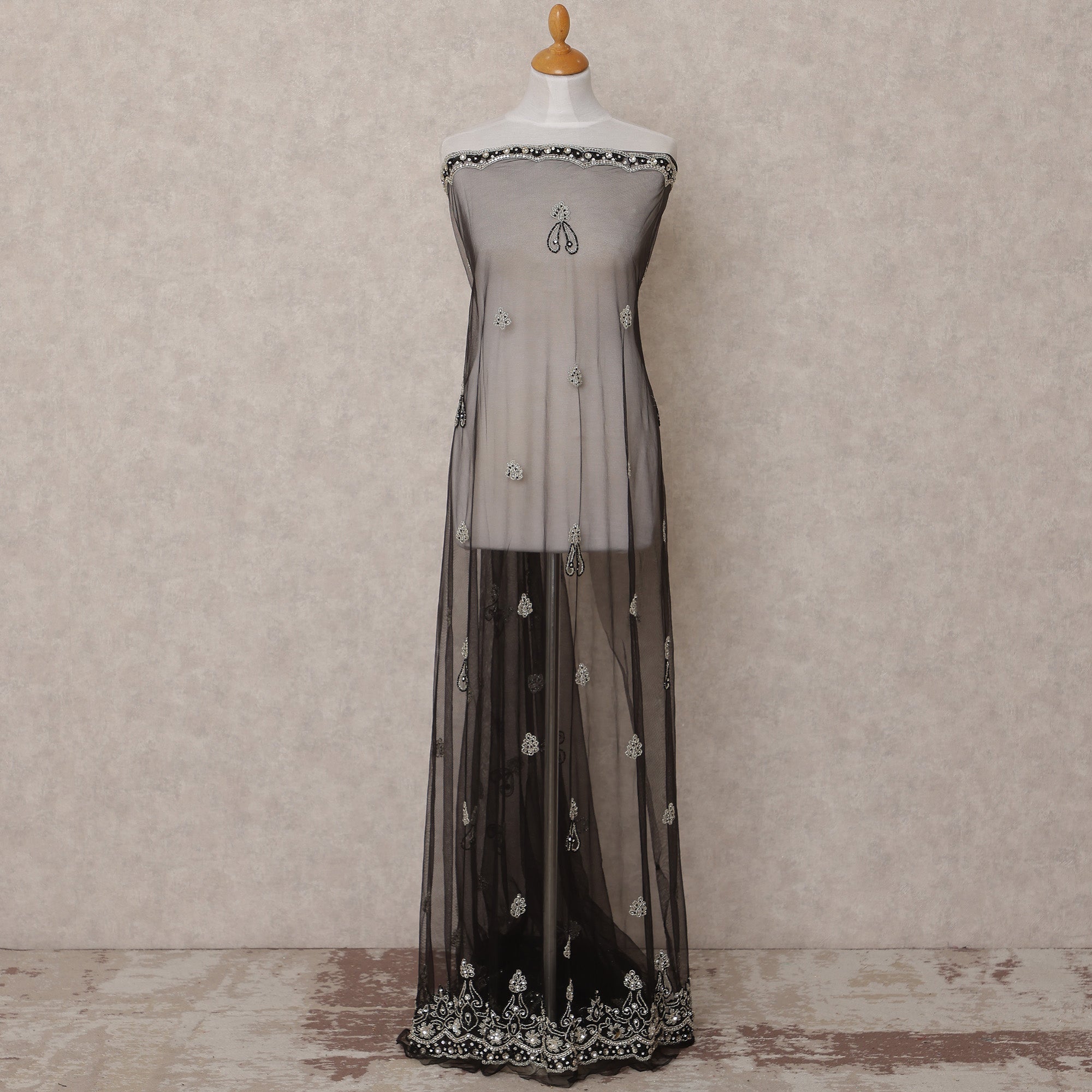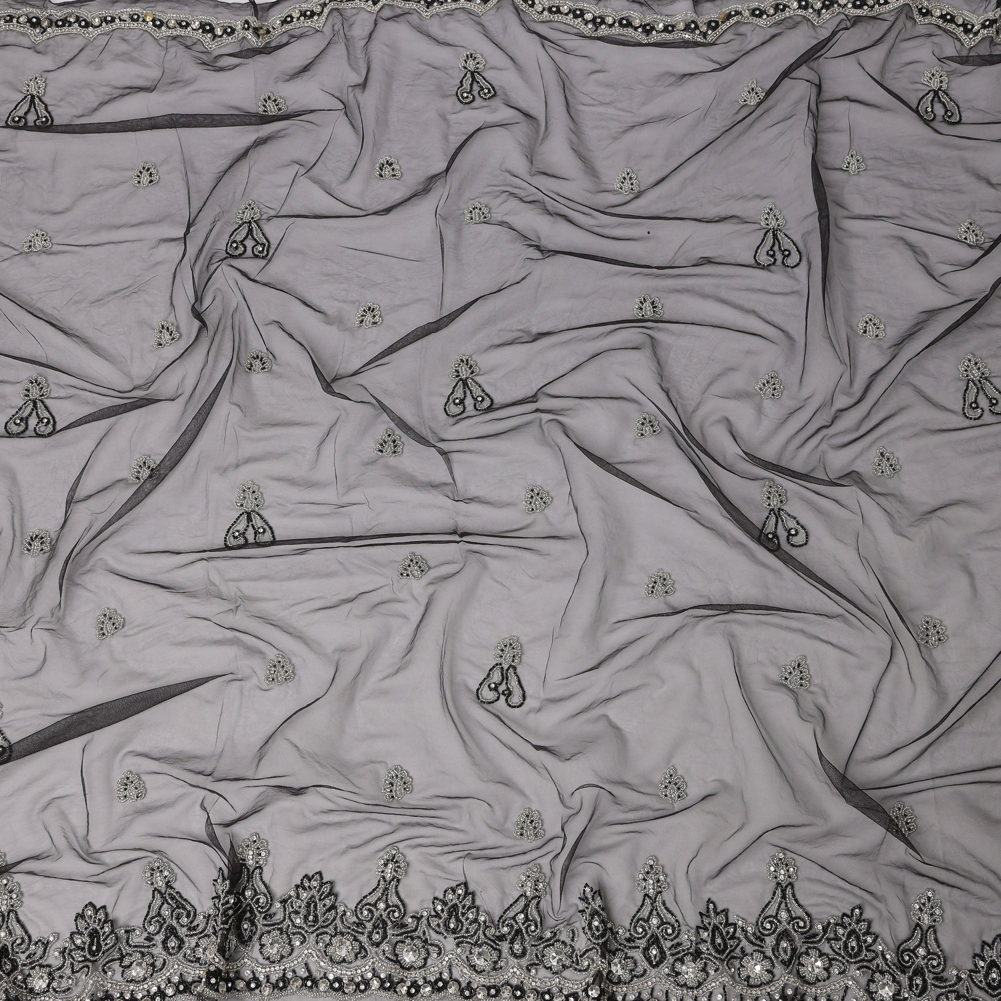 Lavender Grey Embroidered Nylon Tulle Fabric with Sequin and Thread Buti & Border Work, 140 cm Width, Made in India-D23484