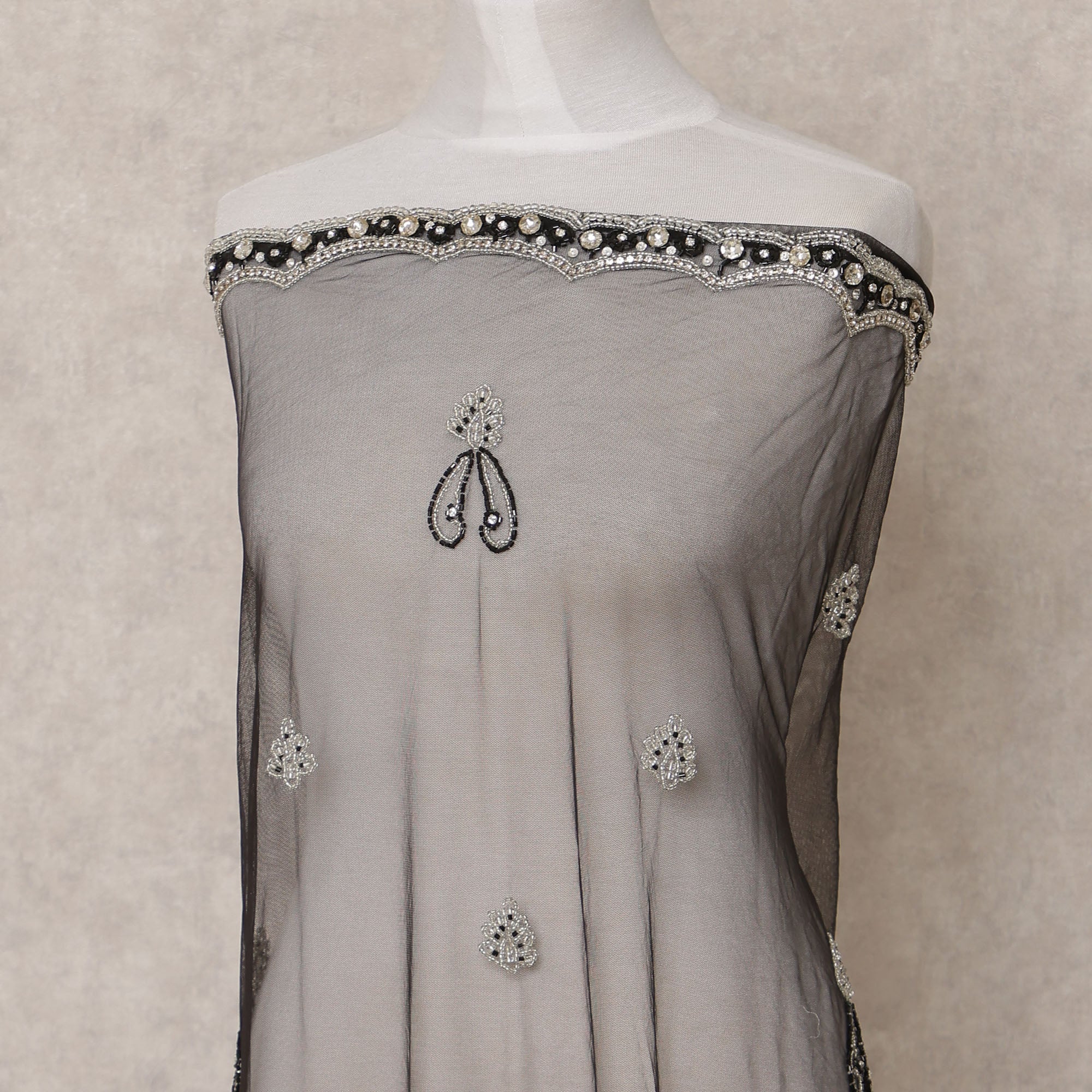 Immerse yourself in the understated elegance of this Lavender Grey Nylon Tulle Fabric, intricately adorned with a mix of thread-embroidered butis and elaborate sequin-studded border work. With its luxurious sheer finish and delicate craftsmanship, the fabric presents a refined yet festive appeal perfect for fashioning dupattas, gowns, overlays, or festive ethnic wear. Measuring 140 cm in width and offered in a 3-meter piece, it provides generous material for creative projects while maintaining lightweight breathability. Hand-embroidered by skilled artisans in India, the fine detailing of traditional motifs and embellishments make this fabric a statement of cultural artistry and premium quality. Shop online to elevate your wardrobe or design collection with this timeless, graceful fabric choice.