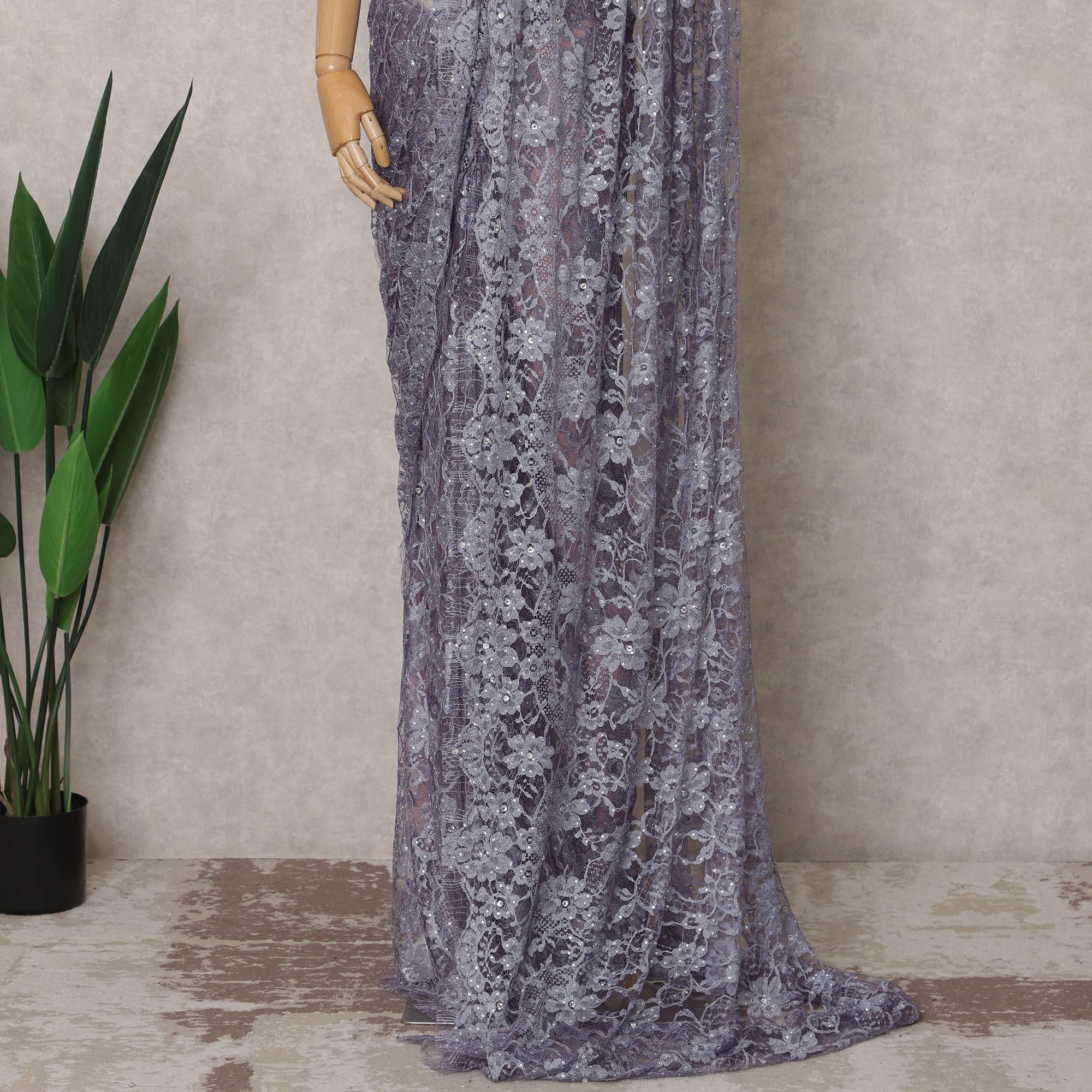 Lavender Grey Premium French 2-Tone Chantilly Lace Saree Fabric with Stone Work – 5.5 Meters Length & 110 Cms Width – Imported from France-D22956