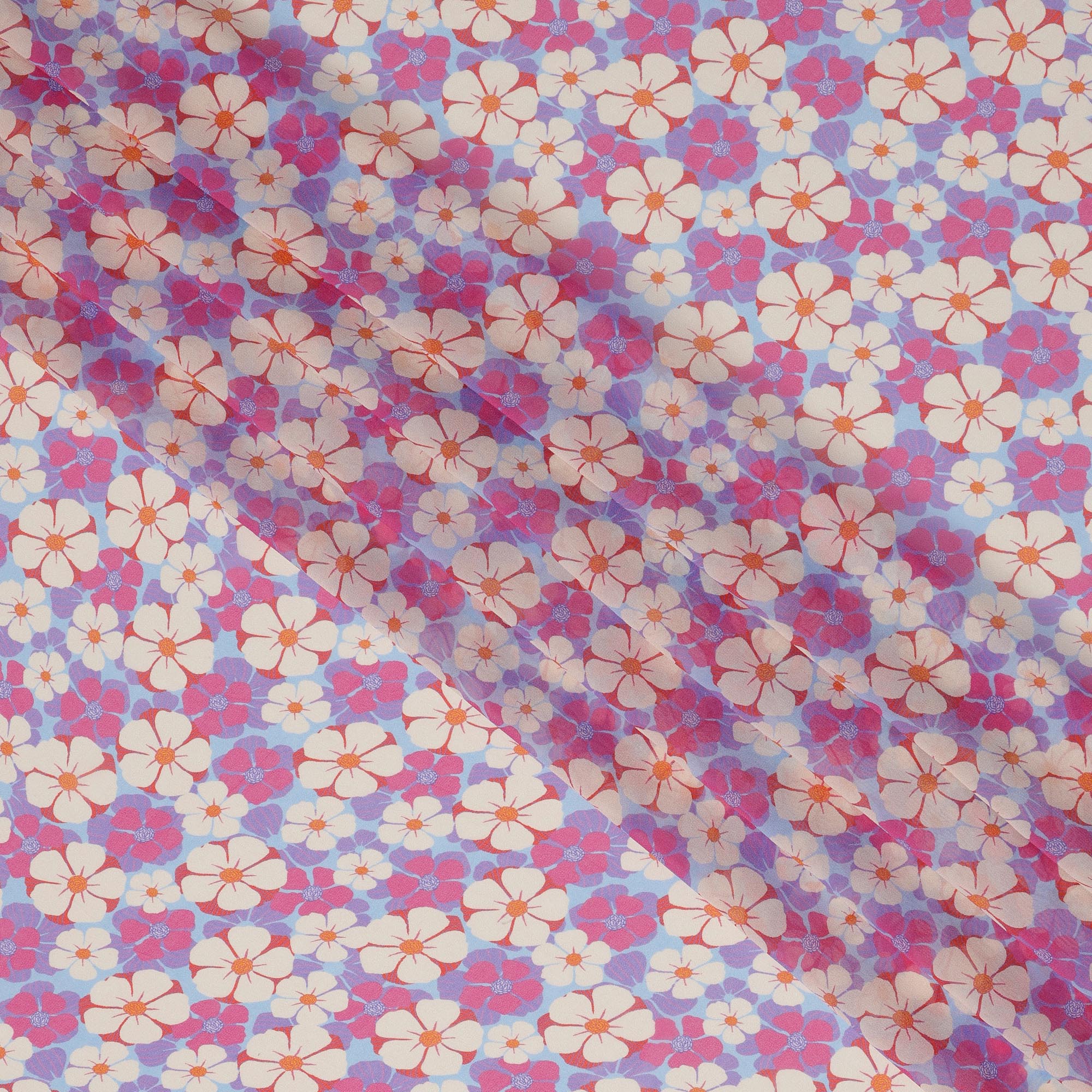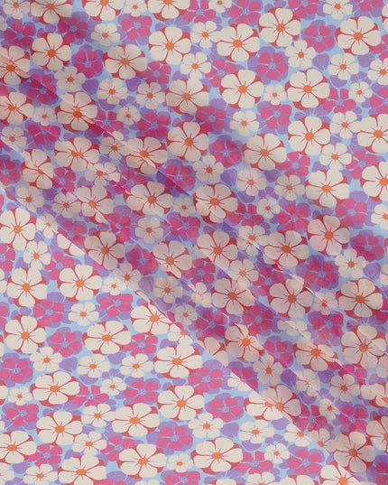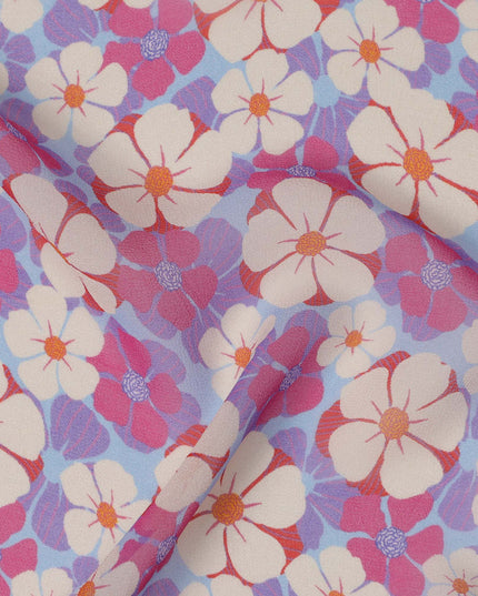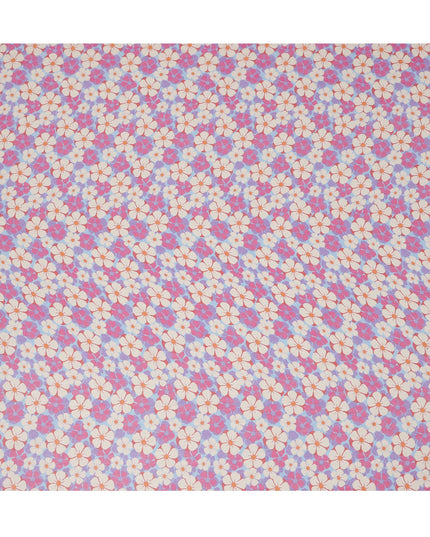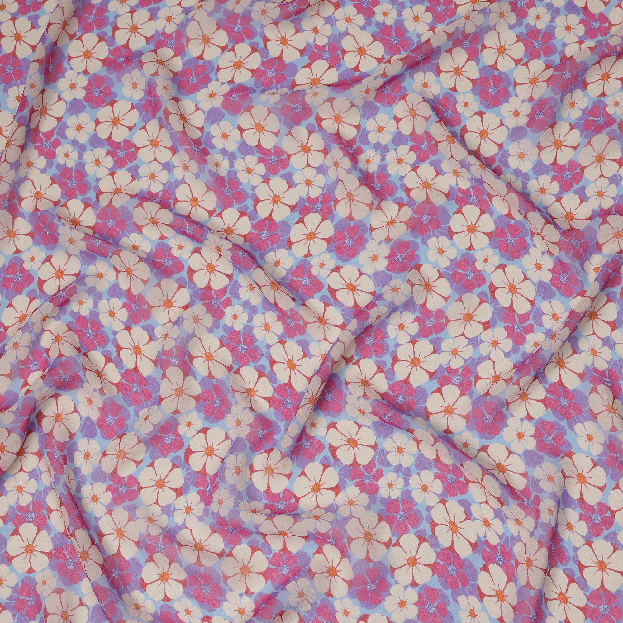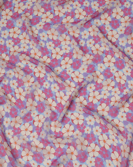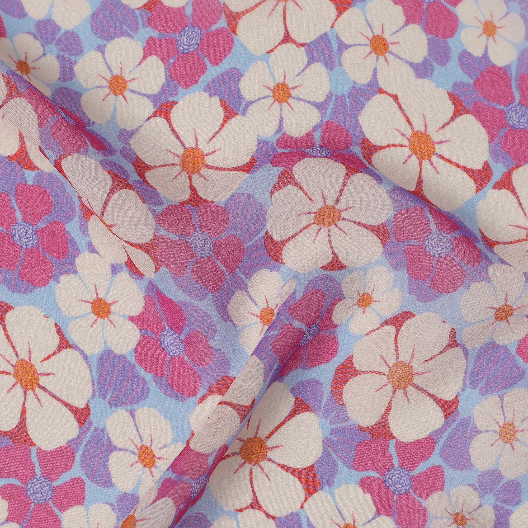Add a playful pop of color to your wardrobe with this lavender pink synthetic georgette fabric featuring a vibrant all-over floral print in off-white, violet, and soft red-orange hues. The dense arrangement of bold blossoms across the pastel base creates a fresh and cheerful aesthetic that’s perfect for breezy sarees, trendy kurtis, and festive fusion wear. Made from lightweight and semi-sheer synthetic georgette, it offers a soft, flowing drape ideal for summer-friendly ethnic styles. With a width of 110 cms, this fabric ensures creative flexibility for a variety of silhouettes. Crafted in India using high-quality materials and precision printing, it combines durability with a playful design. Shop online to add this bright floral fabric to your collection and turn heads with every outfit.