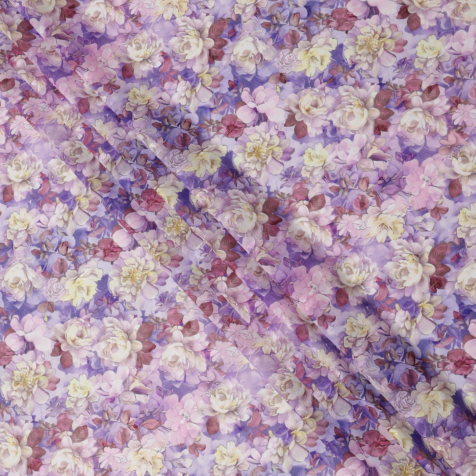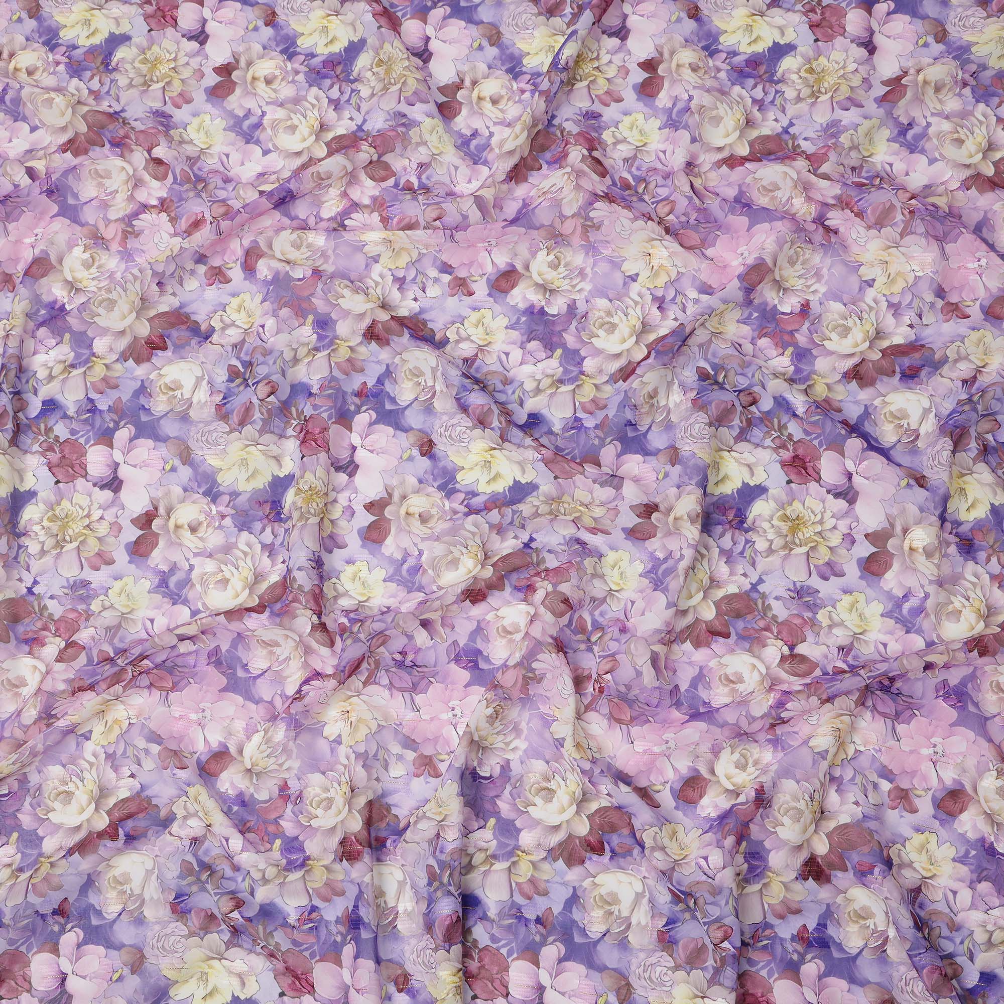Lavender Purple Floral Rose Print Cotton Voile Fabric with Yellow and Cream Accents, 140 Cms Width, Made in India-D24321