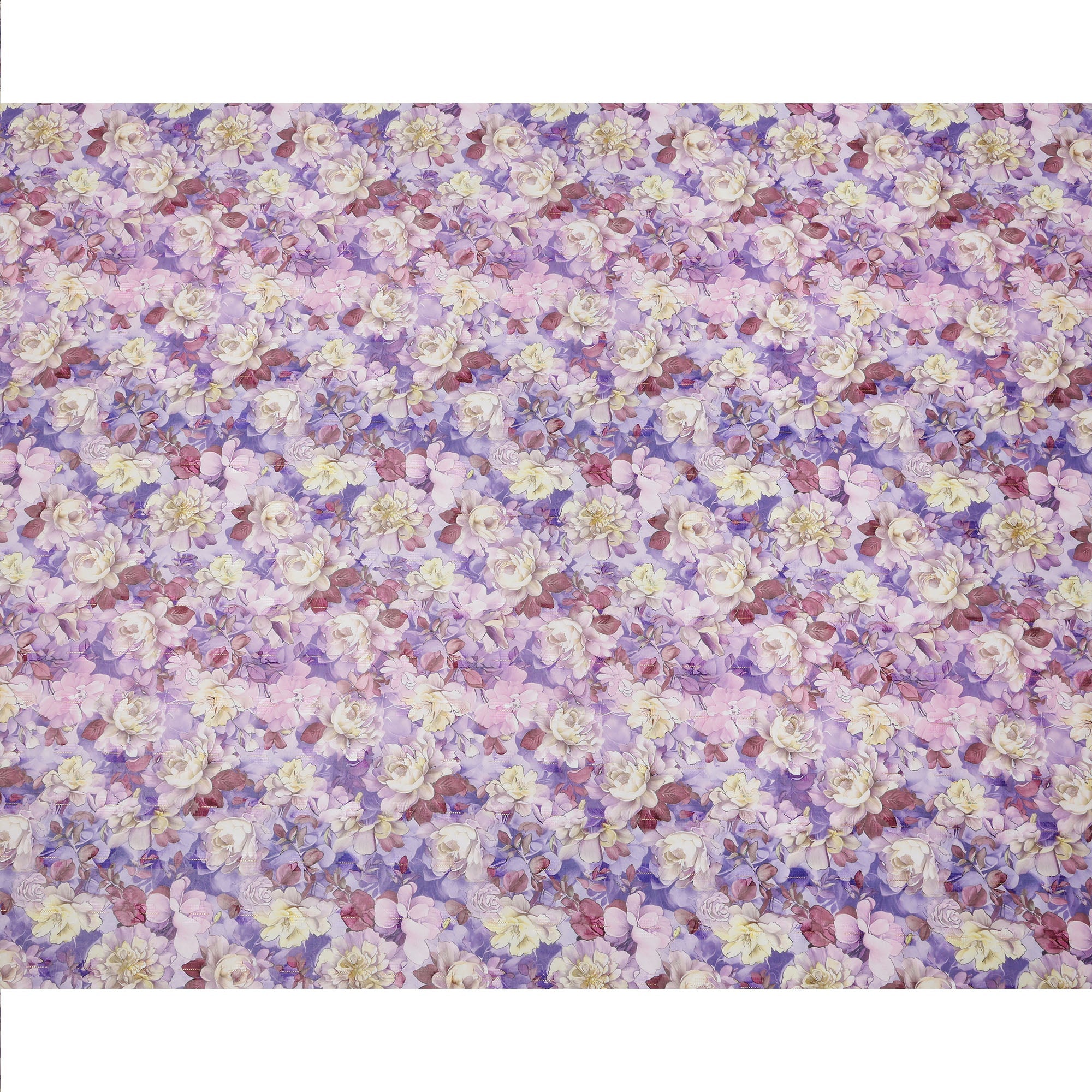 Lavender purple base with soft floral rose prints in cream, yellow, and mauve tones