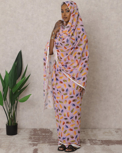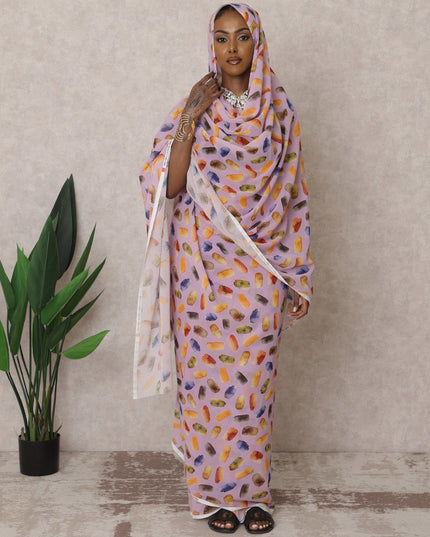 Step into elegance with this stunning lavender traditional Sudanese thobe, crafted from soft and breathable pure cotton voile fabric for unmatched comfort. The 4.5-meter-long fabric drapes gracefully, offering a sophisticated and modest silhouette perfect for cultural gatherings, festive occasions, and daily wear. Featuring a unique abstract print in vibrant shades of orange, blue, and brown, this thobe seamlessly blends tradition with contemporary style. With a width of 110 cm, it ensures full coverage while maintaining a lightweight and airy feel. Expertly crafted in India, this high-quality thobe is easy to wash and retains its vibrant colors and fabric softness over time, making it a timeless and versatile wardrobe essential.