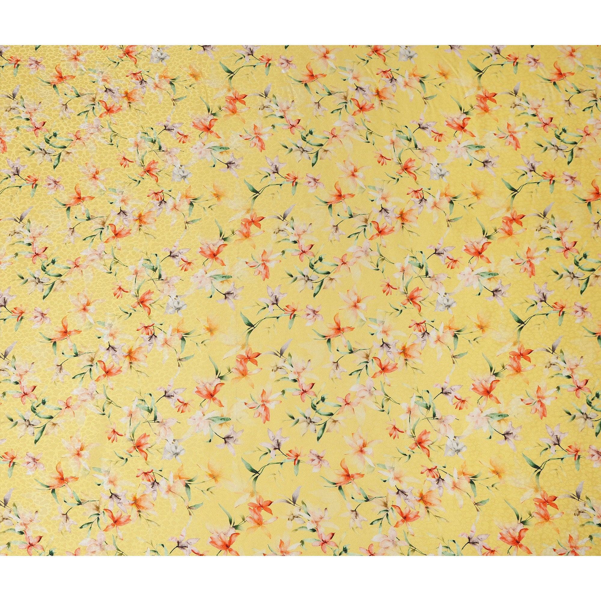 This lemon yellow floral printed viscose crepe fabric features a delicate multicolor blossom design beautifully scattered across a fresh lemon yellow base. Showcasing graceful flowers in soft shades of orange, white, and subtle lavender with gentle green leafy accents, the pattern creates a light, refreshing, and elegant appeal. Crafted from premium viscose crepe, the fabric offers a soft, lightly textured surface with a refined matte finish that enhances its natural charm. Lightweight and breathable, it ensures comfortable wear for long hours while providing a fluid drape that flatters dresses, kurtas, blouses, skirts, and co ord sets. With a width of 110 cms, it offers versatile flexibility for creative tailoring and designer collections. Ideal for summer outfits and sophisticated everyday fashion, this fabric blends vibrant color with graceful floral detailing and effortless comfort.