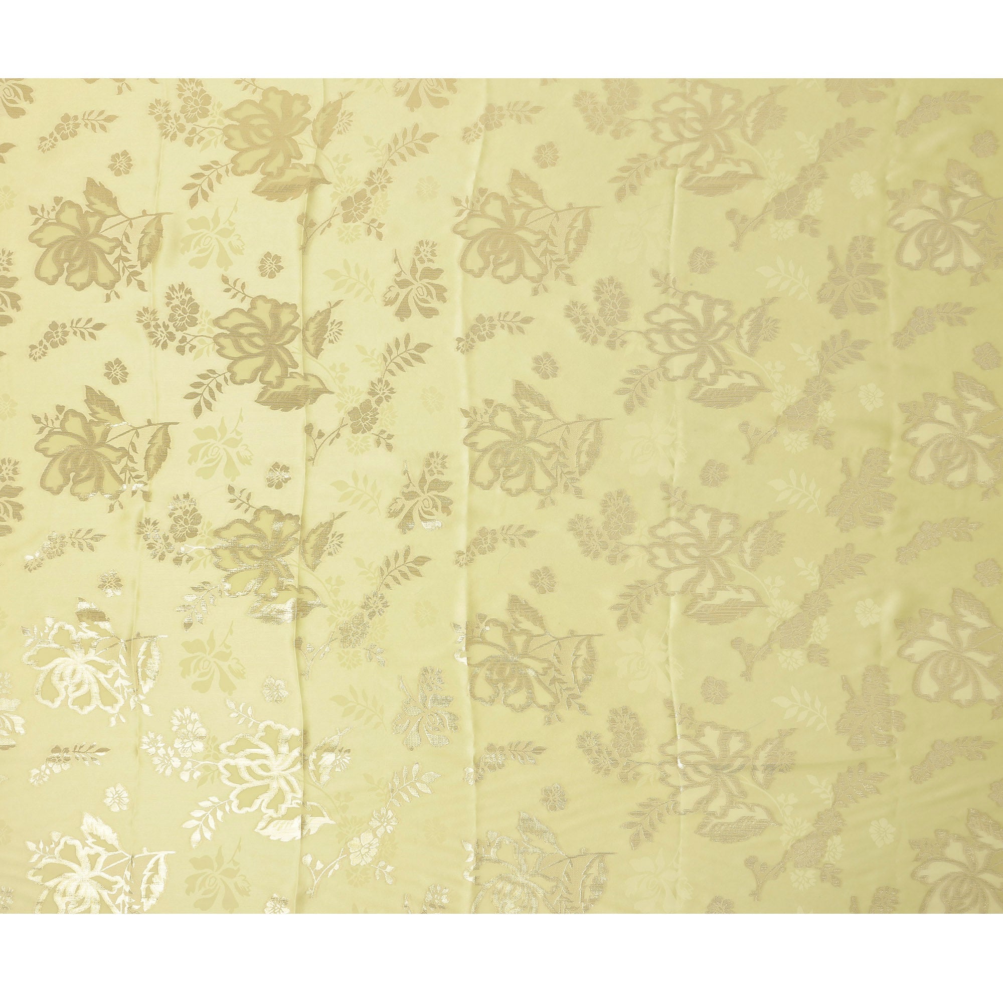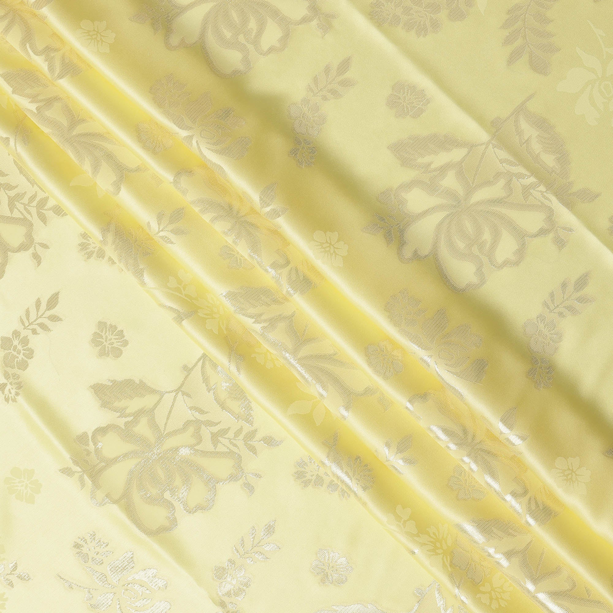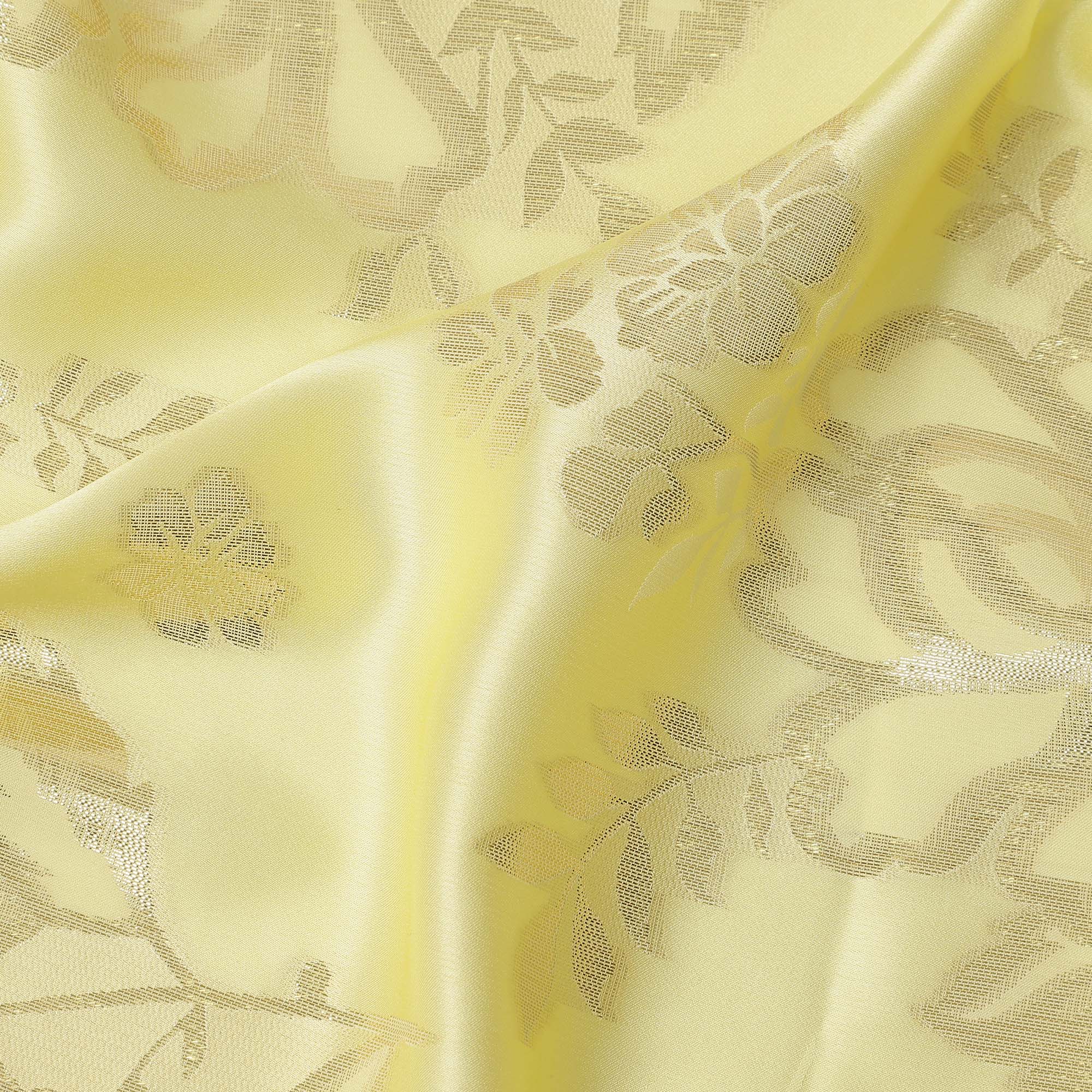 Premium lemon yellow silk satin fabric with intricate metallic floral jacquard weaving.