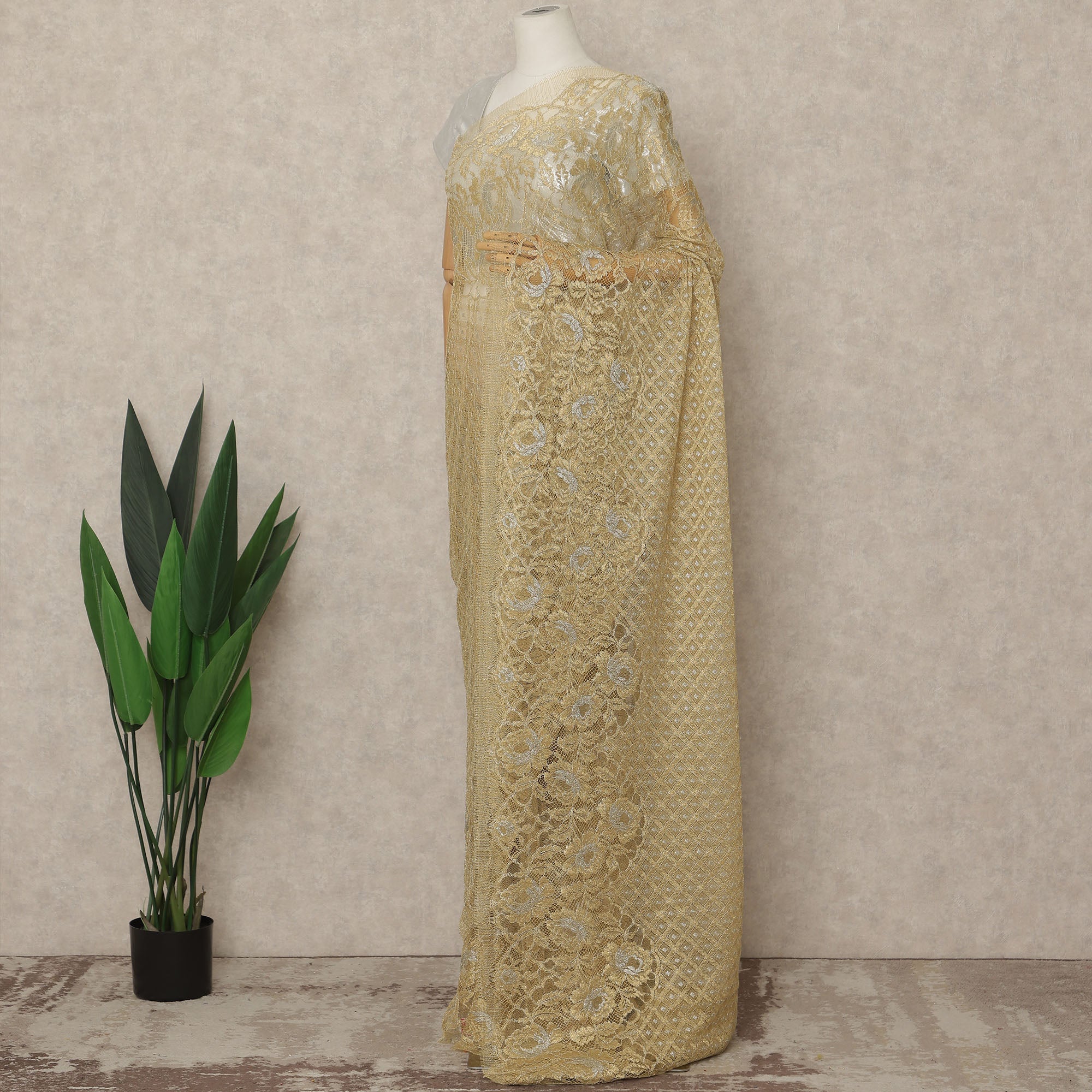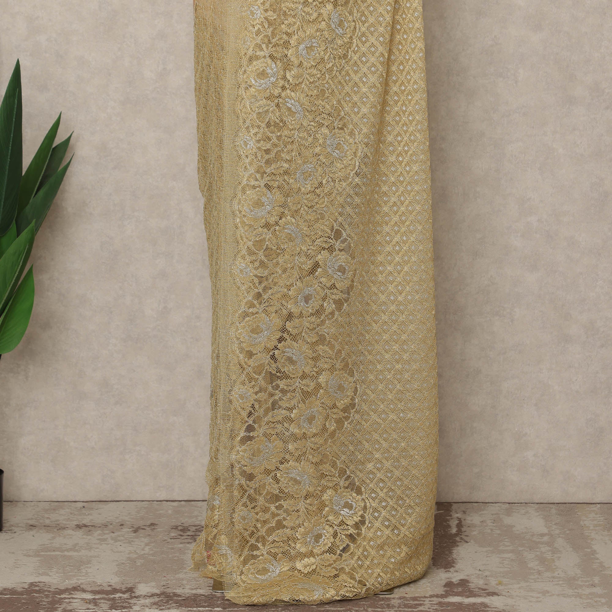 Elegant light antique gold metallic Chantilly lace saree fabric with intricate woven detailing.