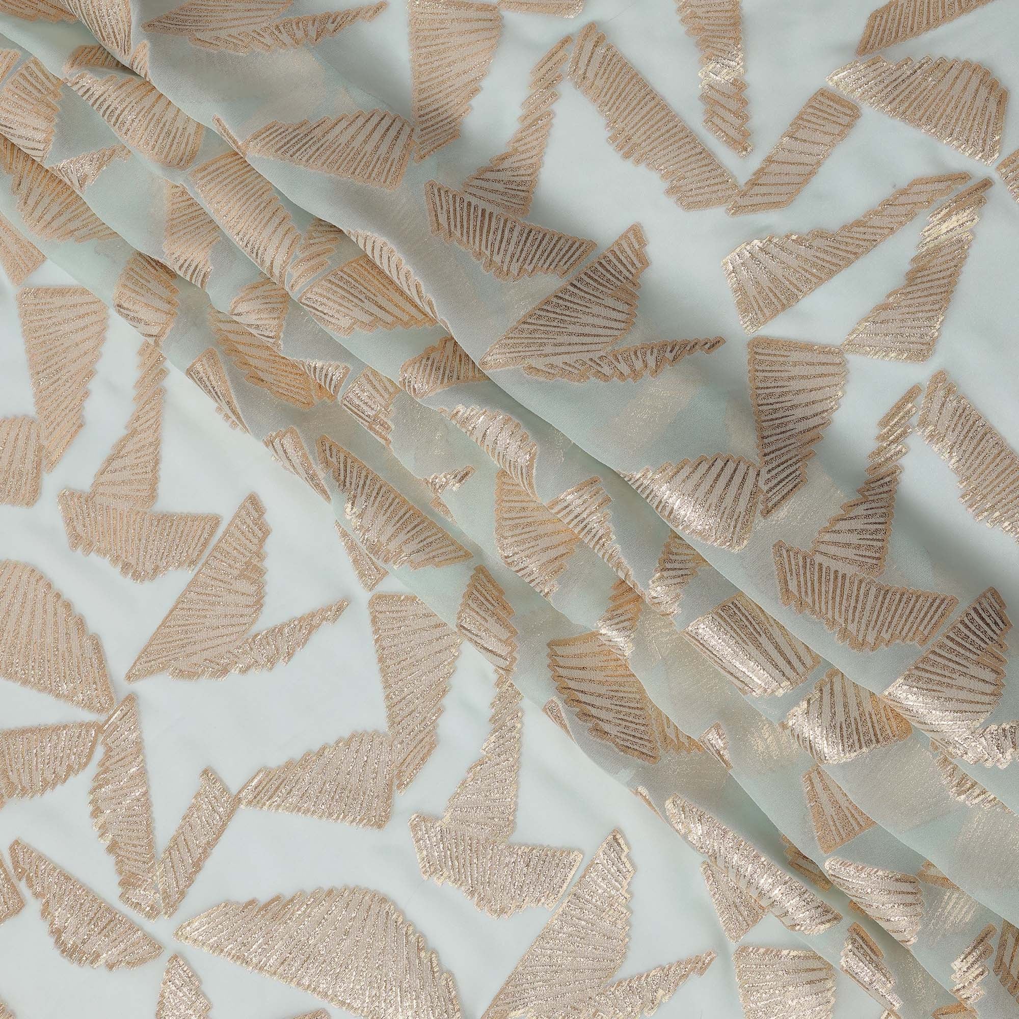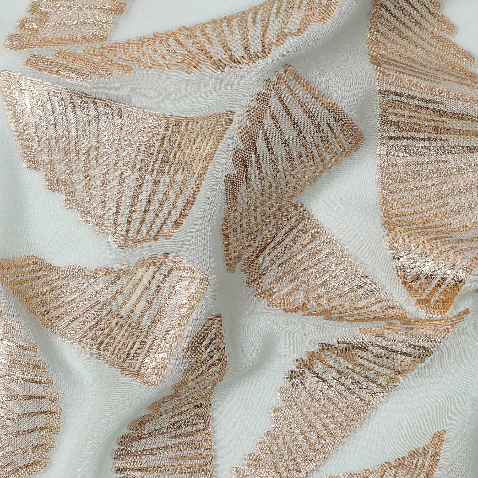 This light blue silk chiffon fabric with metallic lurex abstract motifs is a modern and stylish textile designed for high-fashion and couture projects. The soothing light blue base adds a touch of serenity and sophistication, while the shimmering golden abstract designs bring a contemporary artistic flair. Lightweight, sheer, and fluid, this fabric is perfect for sarees, gowns, dupattas, lehengas, overlays, and statement couture wear. Its graceful drape ensures elegance, while the metallic accents catch the light beautifully, making it ideal for festive and evening ensembles. Crafted in South Korea, this fabric combines premium quality with refined craftsmanship.
