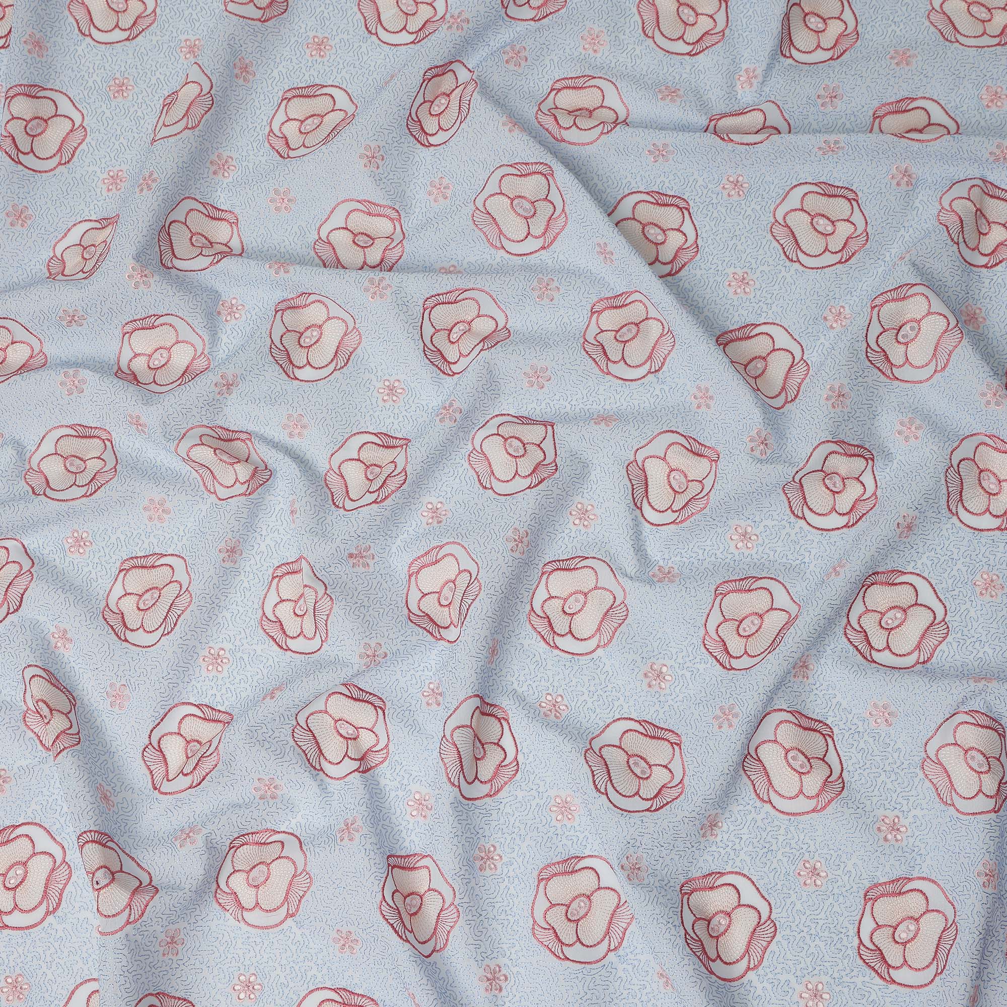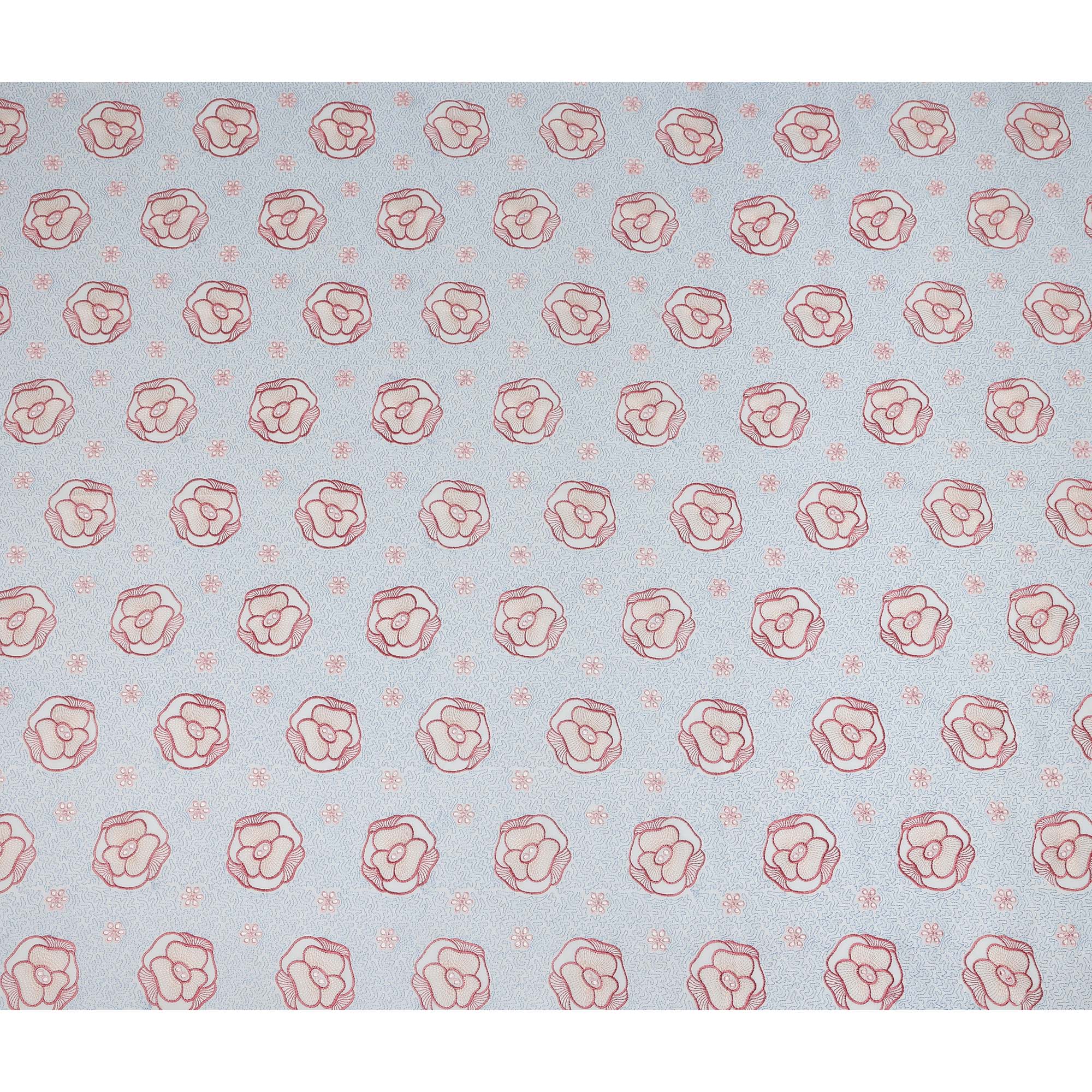 Light Blue Floral Embroidered Cotton Voile Fabric Soft Lightweight Breathable Pink Flower Embroidery Dressmaking Sewing Apparel Fabric 110 Cms Width Made In India-D28406
