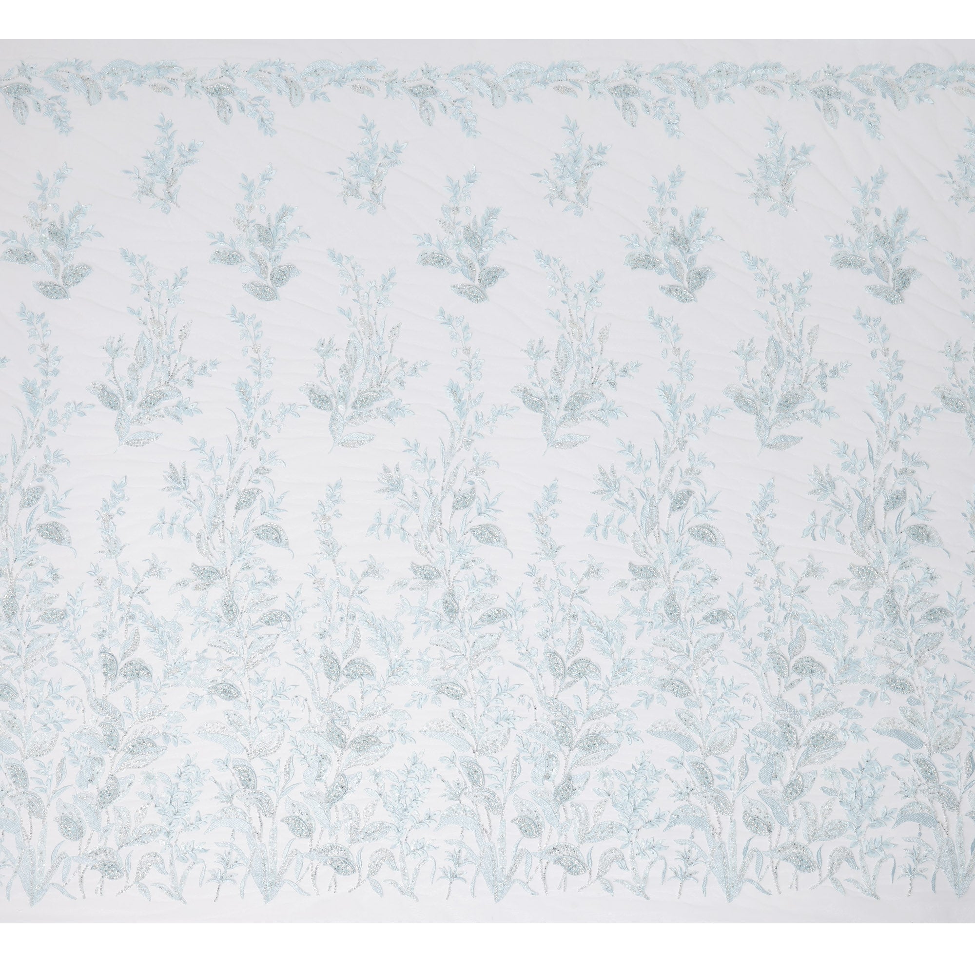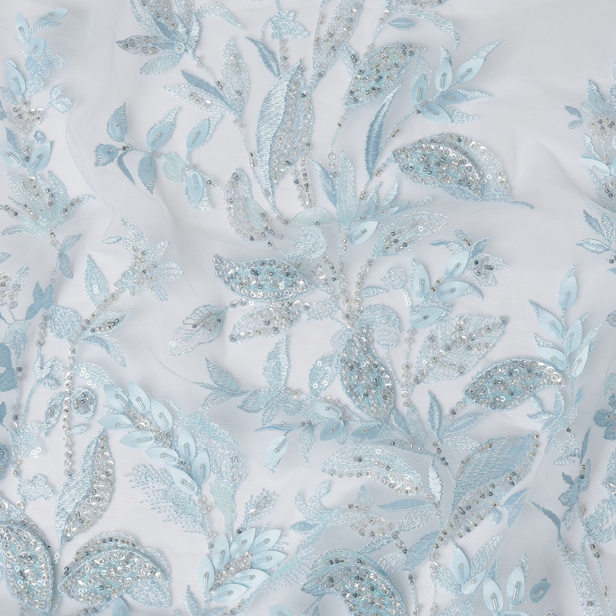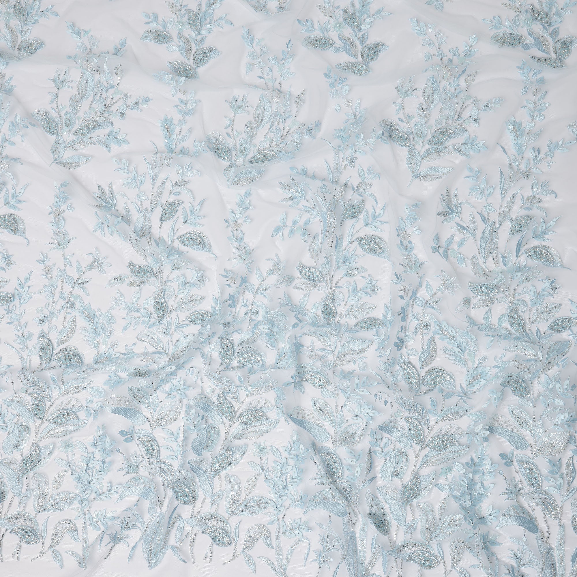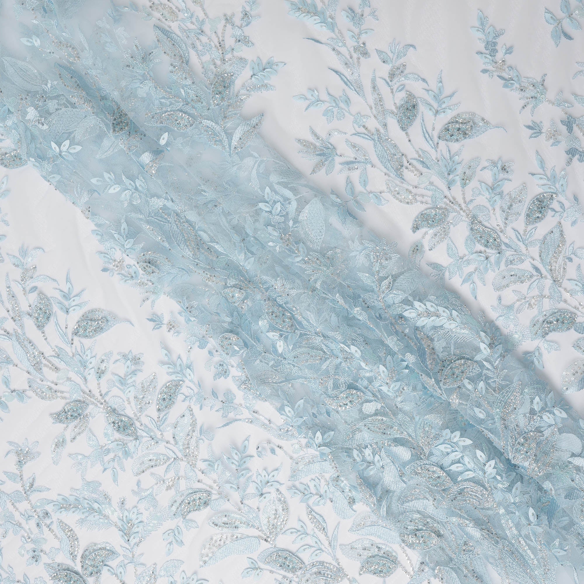 This elegant light blue nylon tulle embroidery fabric showcases intricate floral motifs enriched with shimmering sequins, creating a soft, ethereal texture perfect for designer wear, evening gowns, and couture projects. Crafted with precision on premium tulle, the delicate pastel blue palette enhances its luxurious appeal, allowing the embroidery and sequin work to stand out beautifully. Its lightweight yet durable construction makes it ideal for layered silhouettes, bridal ensembles, and custom creations, offering both sophistication and comfort. Easy to drape and versatile to style, this fabric is a refined choice for those who wish to buy online or shop online for high-quality embroidered materials with a touch of artistic finesse.